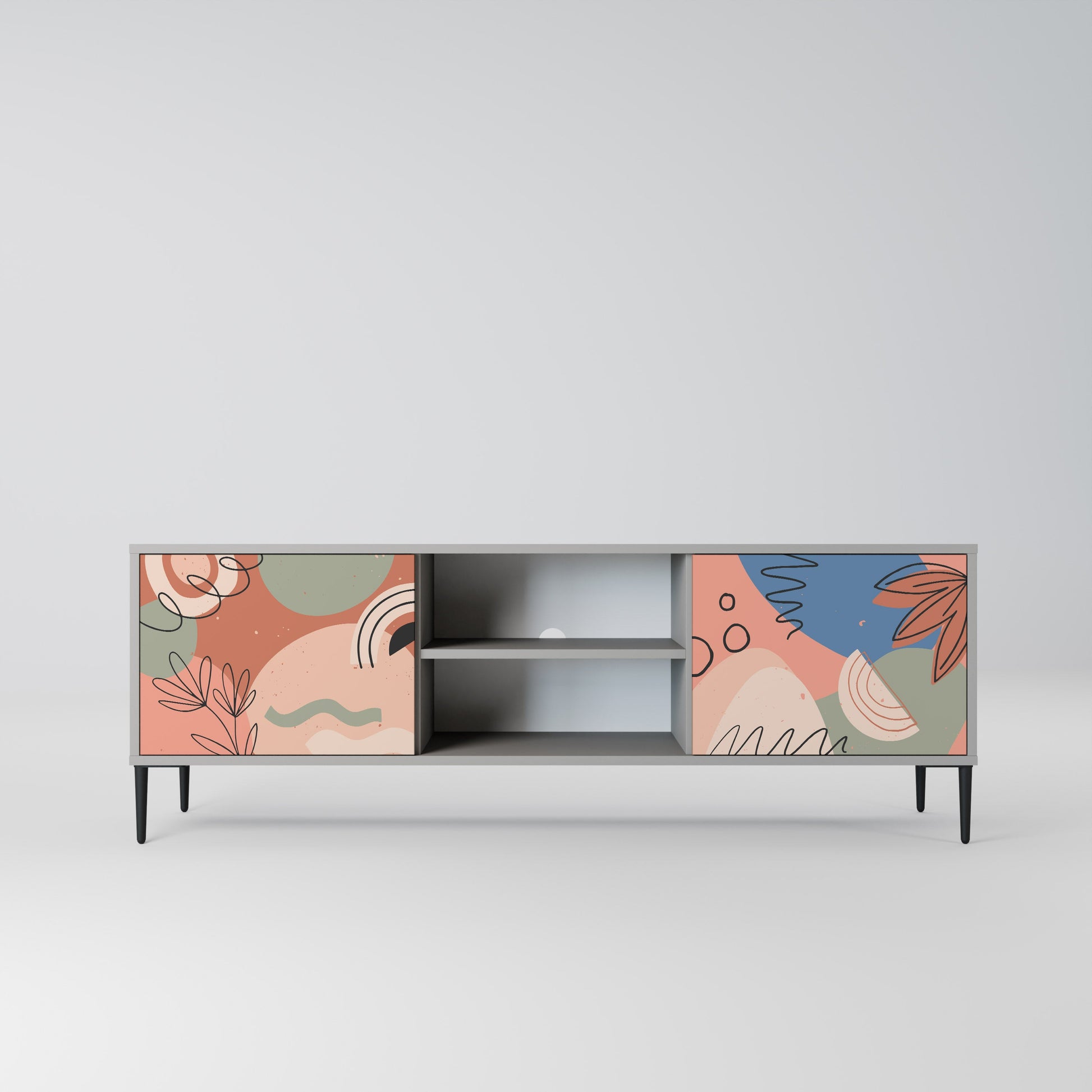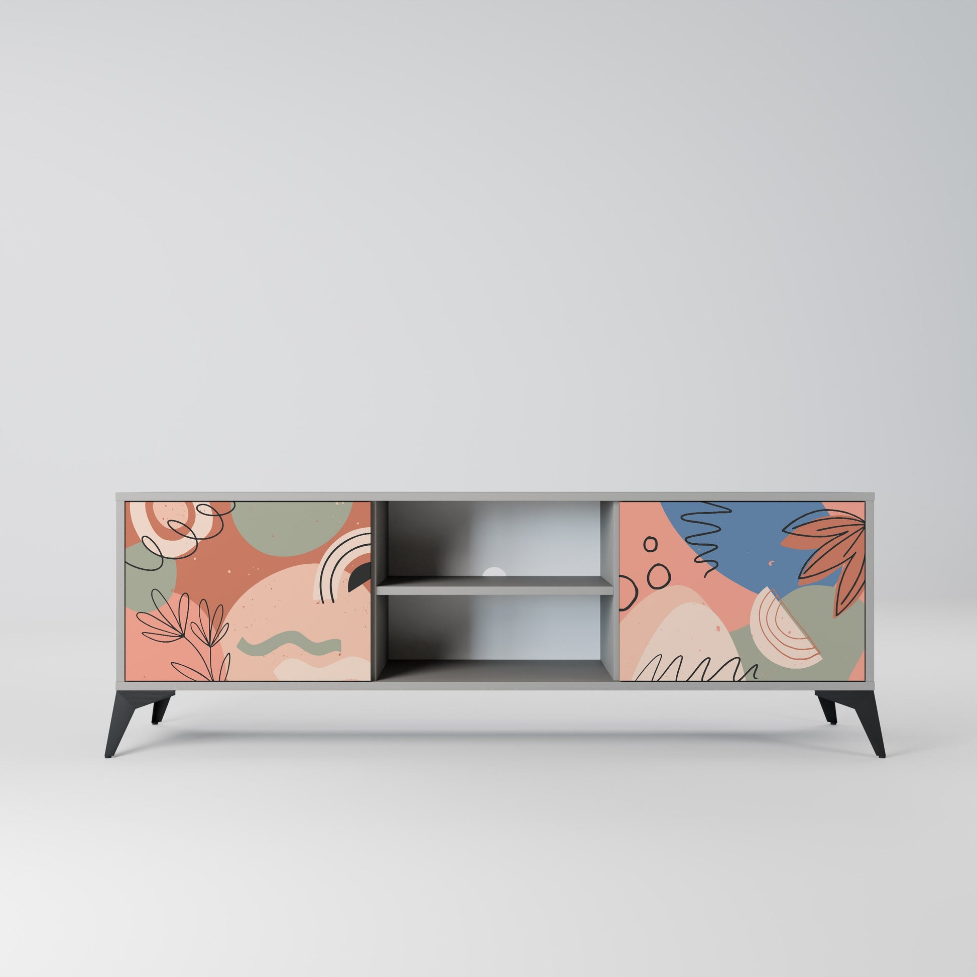 The grey body lends the TV stand a contemporary, refined look, while the fronts with an exceptional print capture attention, becoming the focal point of any room. The spacious interior provides room for electronic devices, cables, remotes, and other accessories, helping you maintain order and organization.