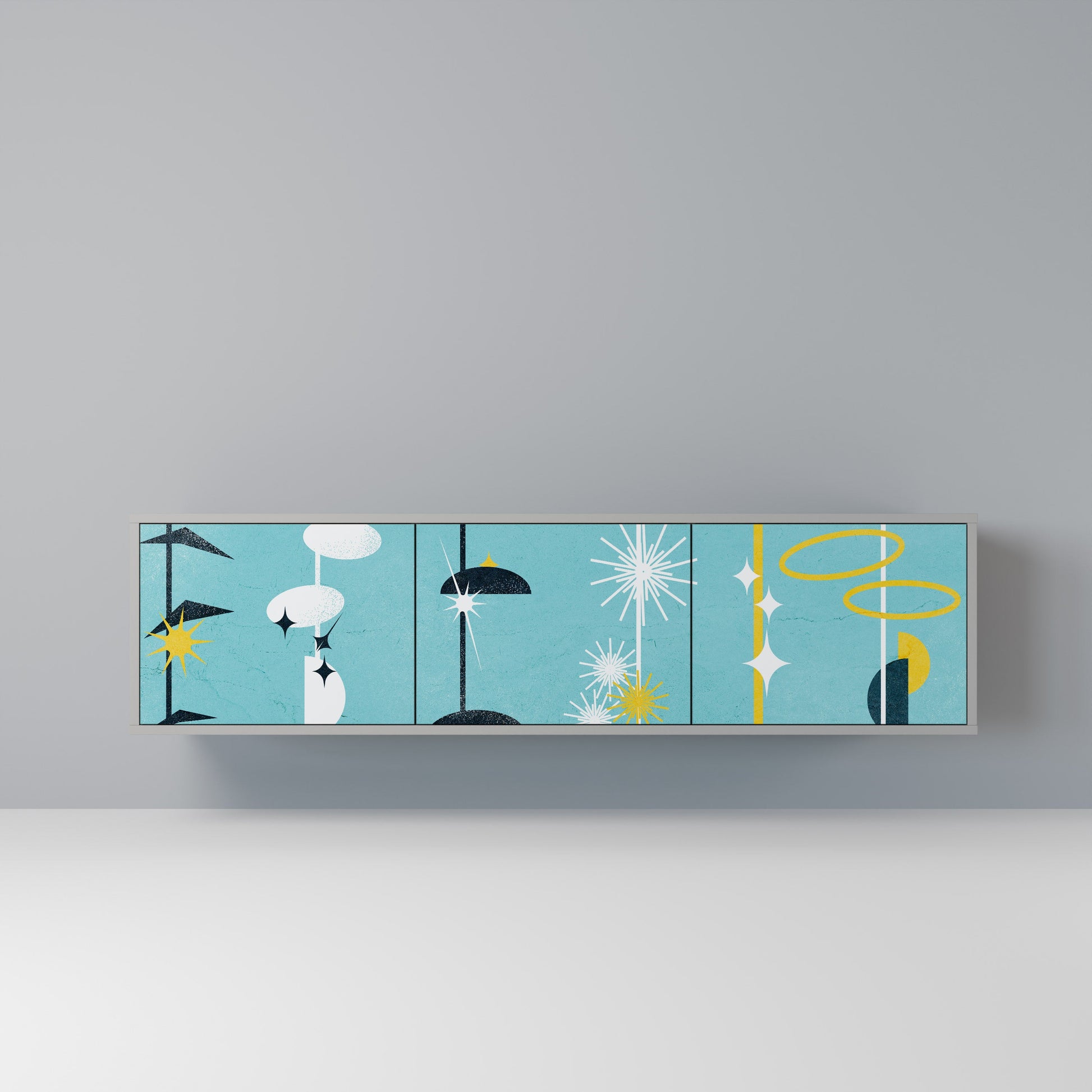 The grey body of the stand creates a refined, modern accent that pairs beautifully with industrial and minimalist arrangements. The fronts with a designer print add character and uniqueness, making this piece not only practical but also a standout decorative element.
