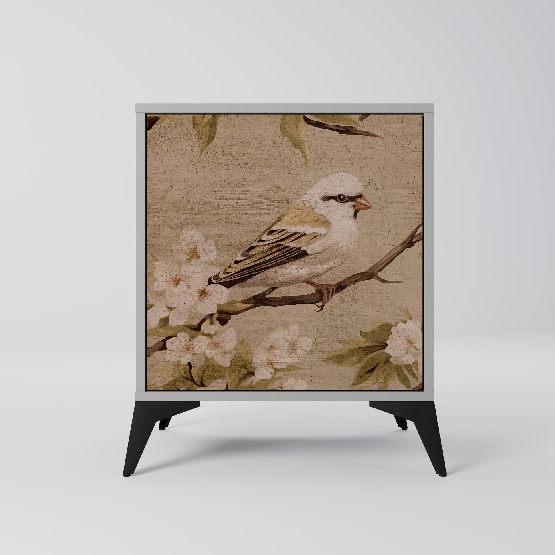 This compact yet remarkably elegant piece of furniture impresses with its minimalist design, perfectly fitting into both modern and classic interiors. The subdued grey color of the body gives the furniture a subtle yet distinctive character, while the fronts with a unique print add an artistic touch.