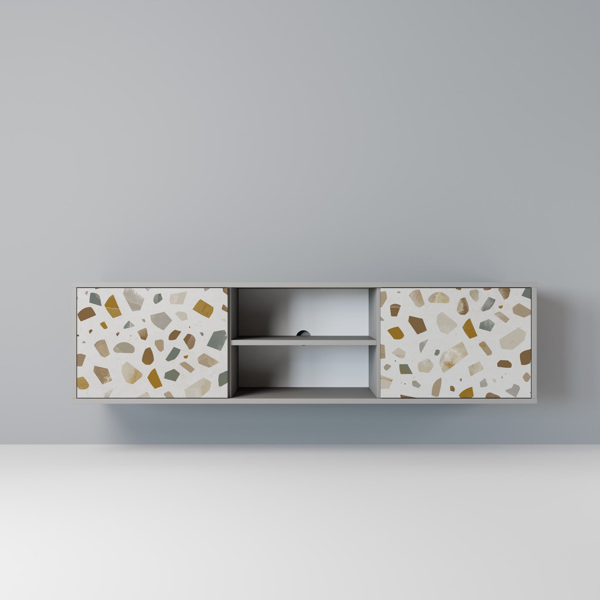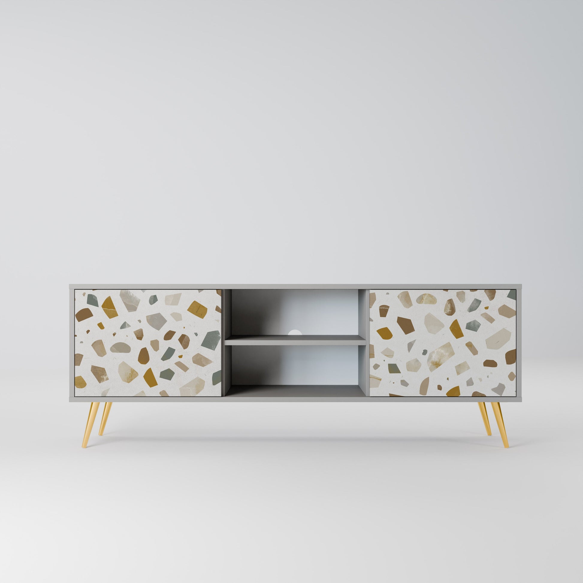 The grey body lends the TV stand a contemporary, refined look, while the fronts with an exceptional print capture attention, becoming the focal point of any room. The spacious interior provides room for electronic devices, cables, remotes, and other accessories, helping you maintain order and organization.