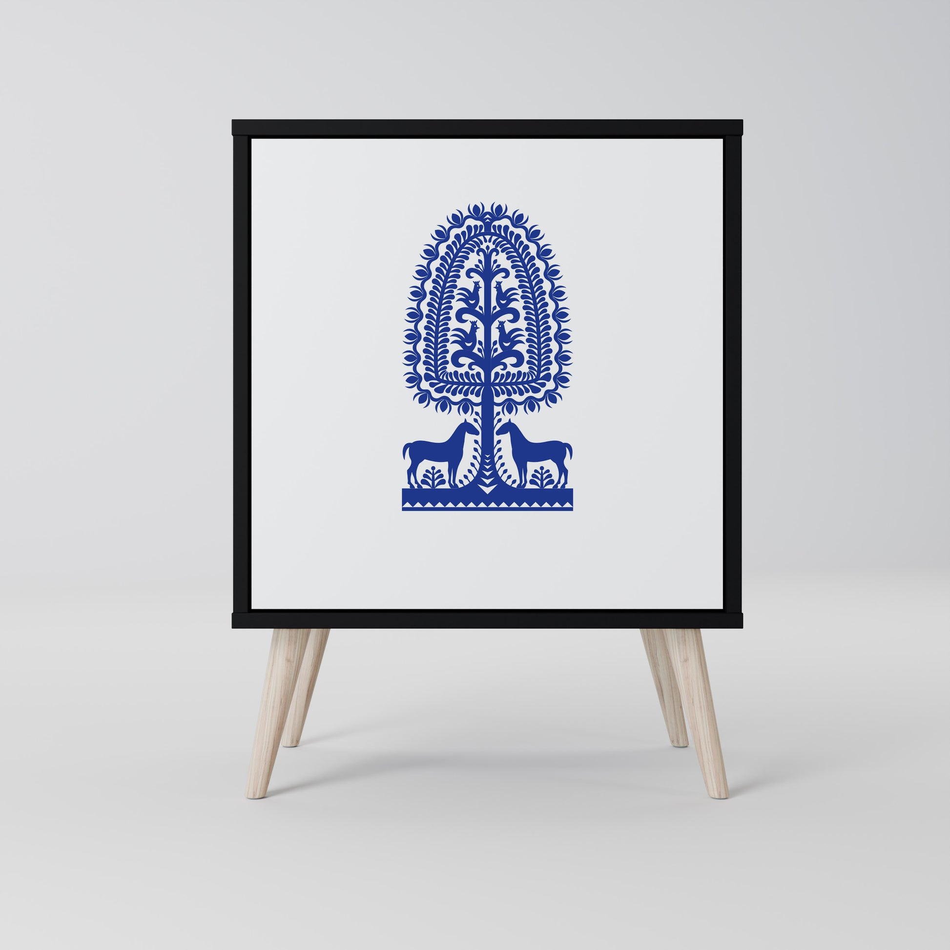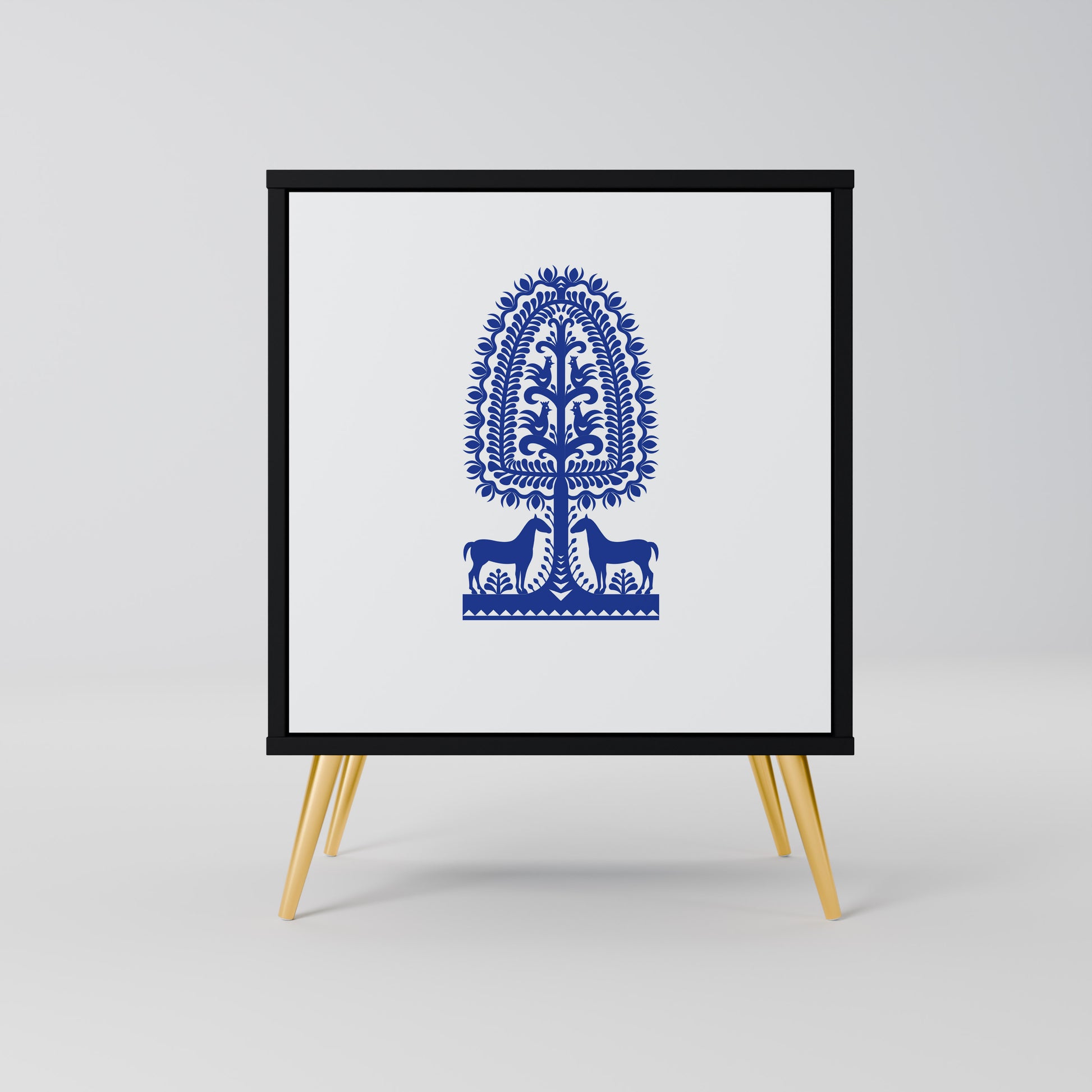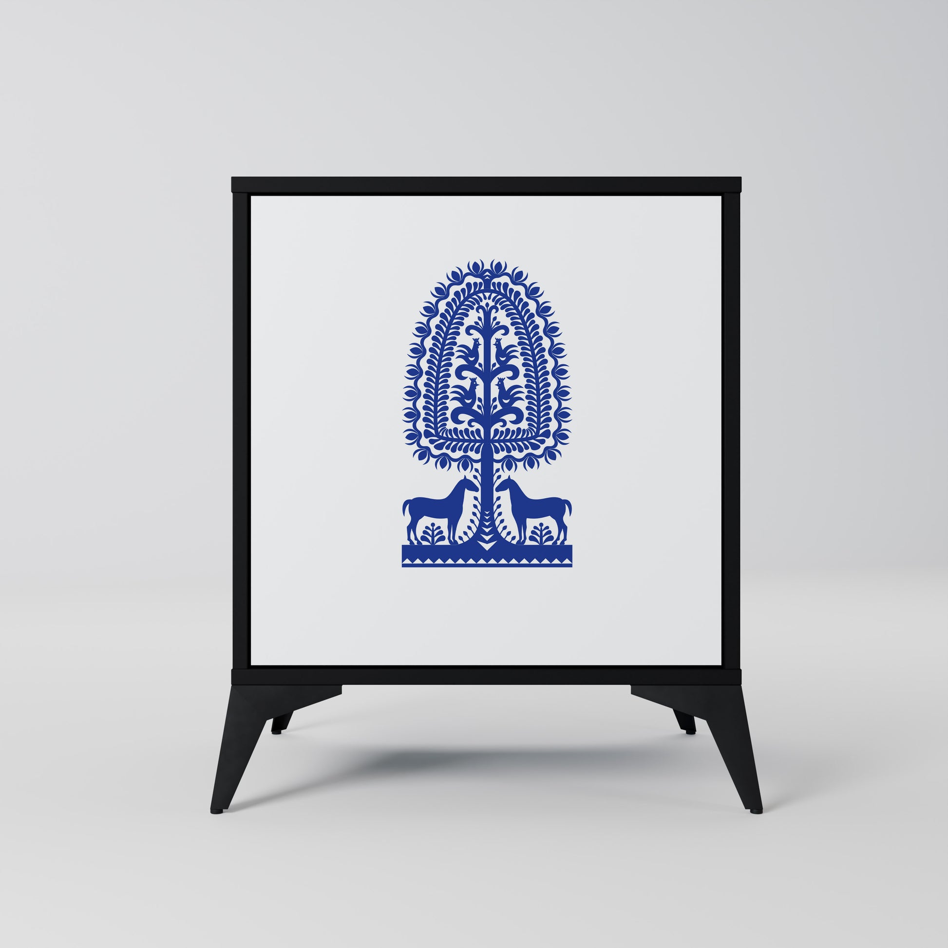 This compact yet remarkably elegant piece of furniture impresses with its minimalist design, perfectly fitting into both modern and classic interiors. The black body emphasizes the furniture’s bold character, while the fronts with a unique print add an artistic touch.