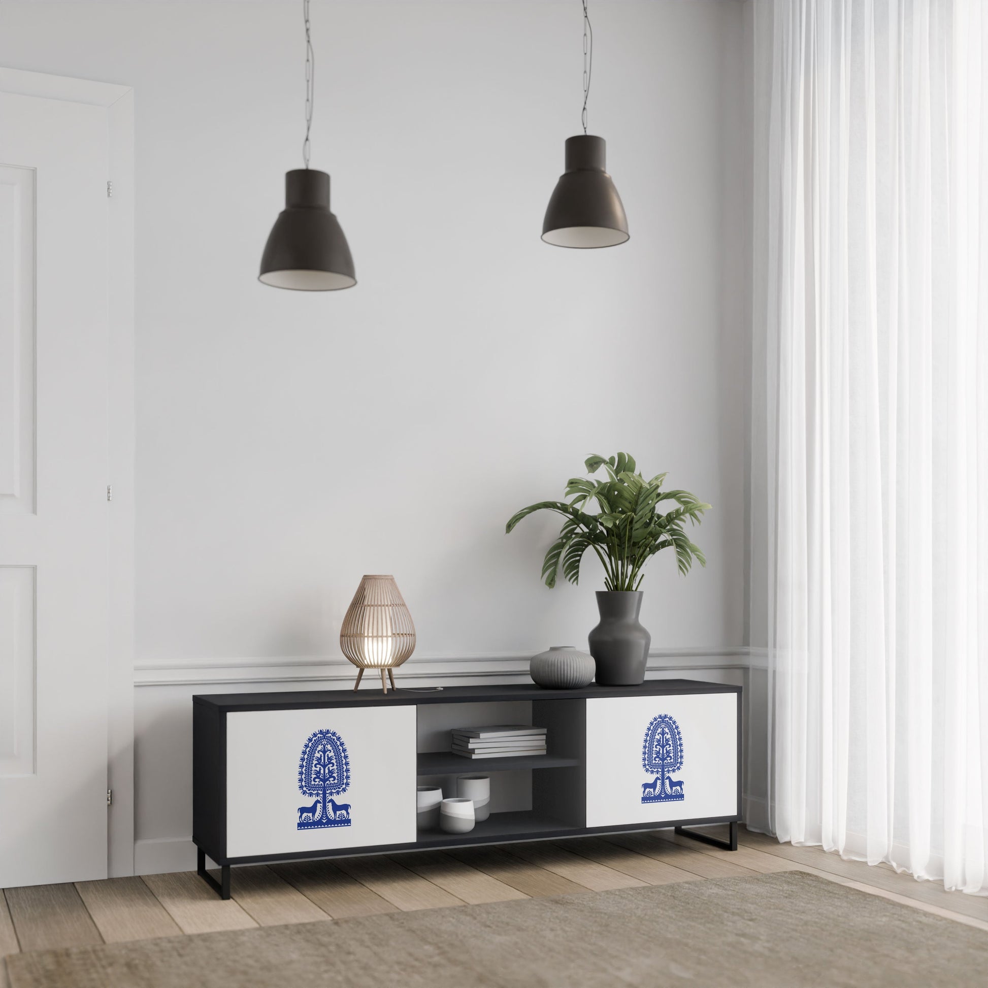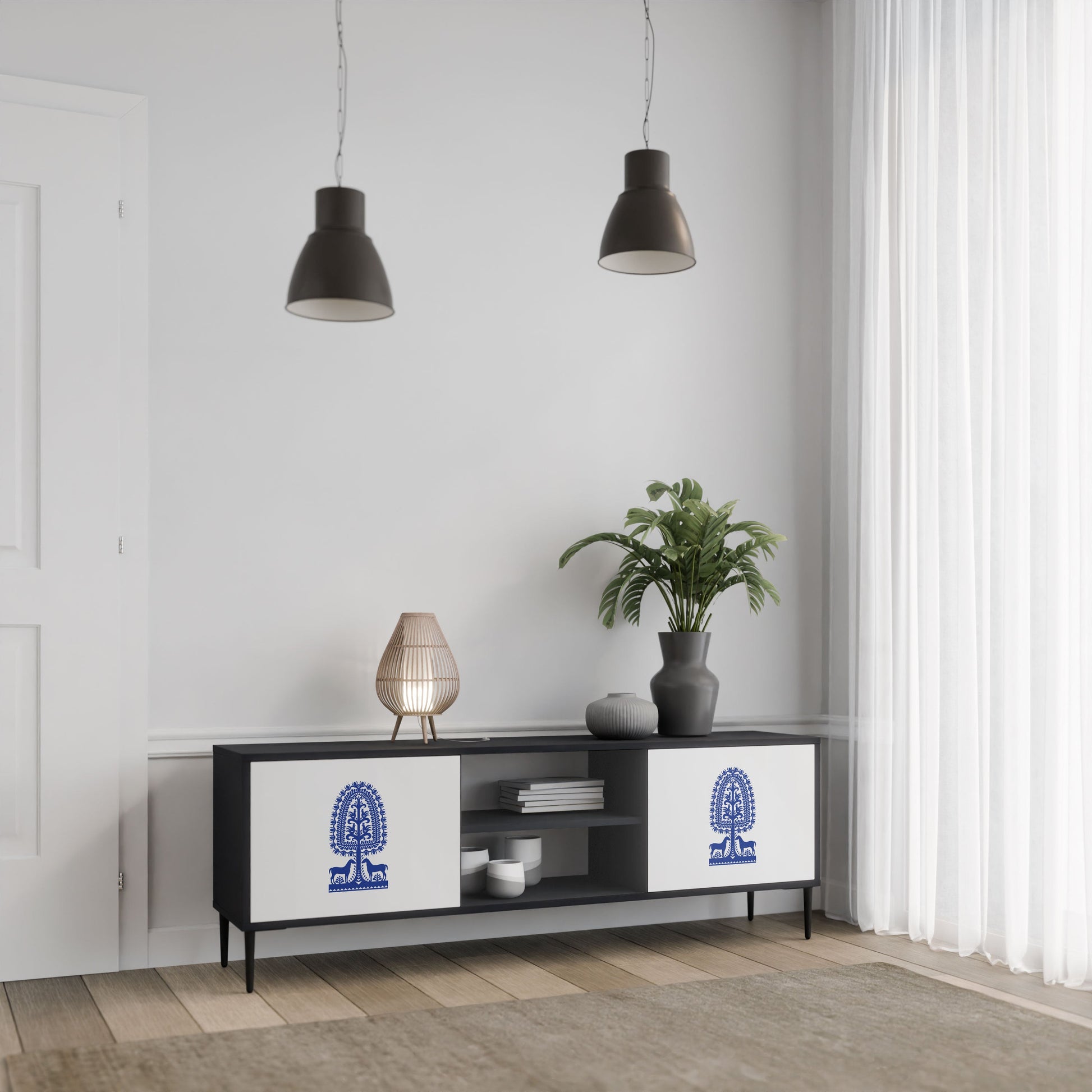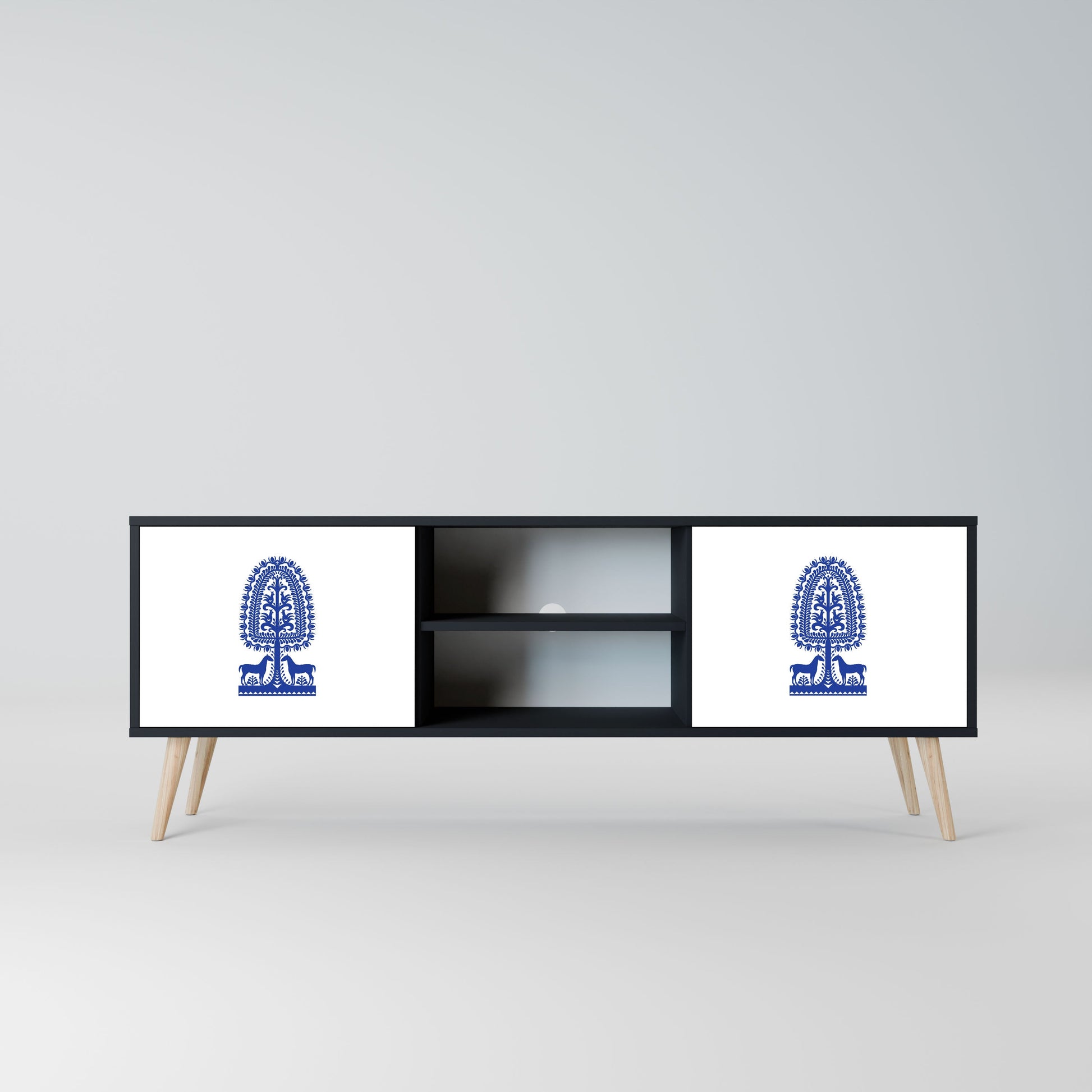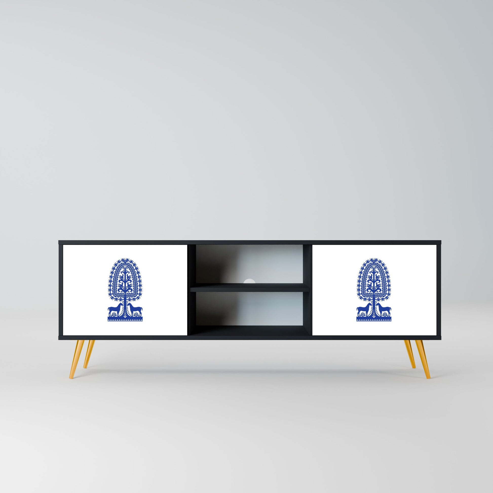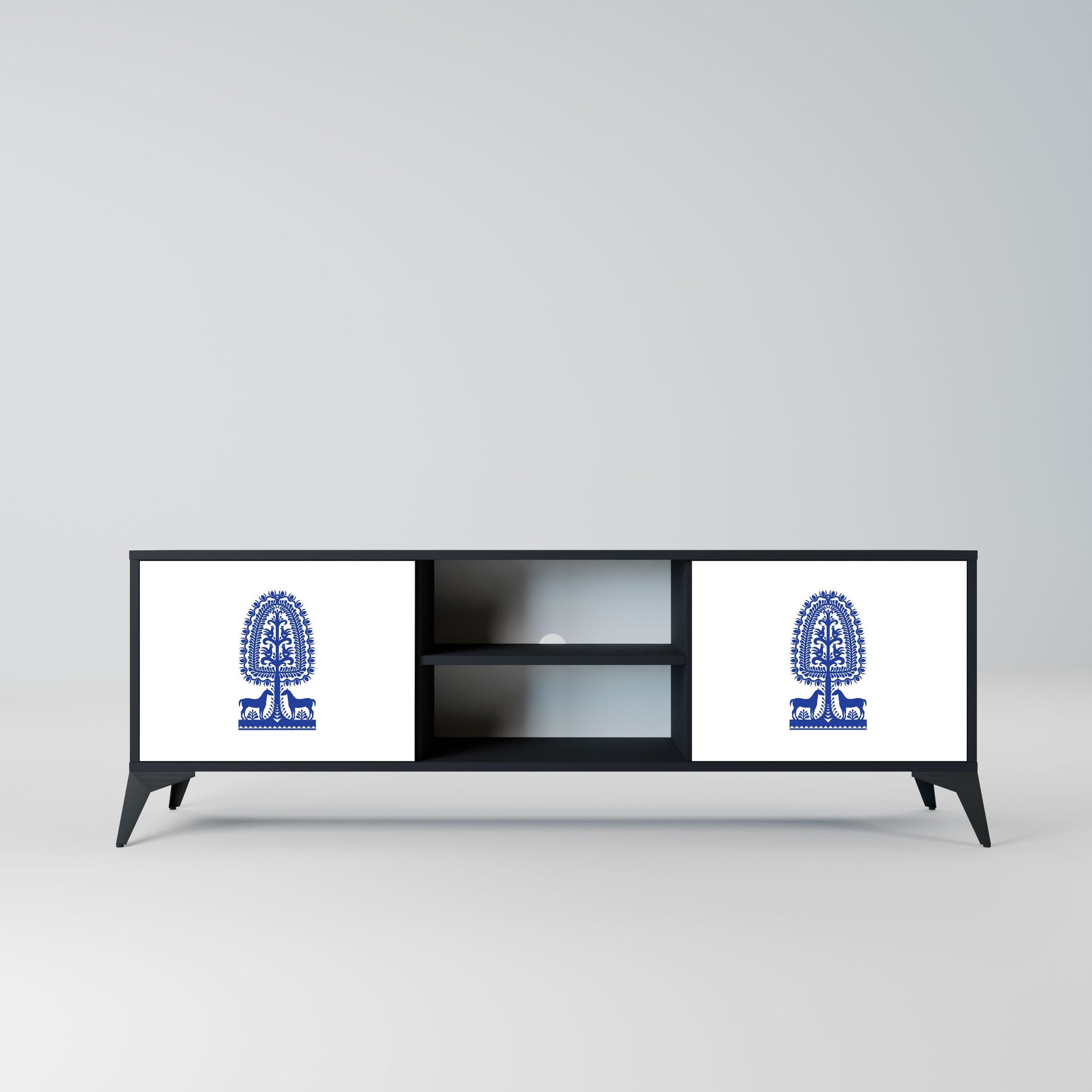 The black body gives the TV stand an elegant, modern look, while the fronts with an exceptional print draw attention, making it the focal point of any room. The spacious interior provides room for electronic devices, cables, remotes, and other accessories, helping you maintain order and organization.