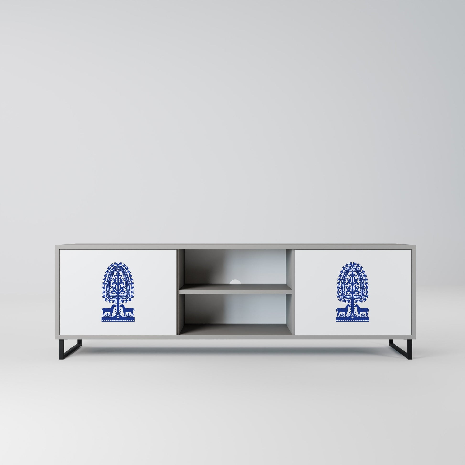 The grey body lends the TV stand a contemporary, refined look, while the fronts with an exceptional print capture attention, becoming the focal point of any room. The spacious interior provides room for electronic devices, cables, remotes, and other accessories, helping you maintain order and organization.