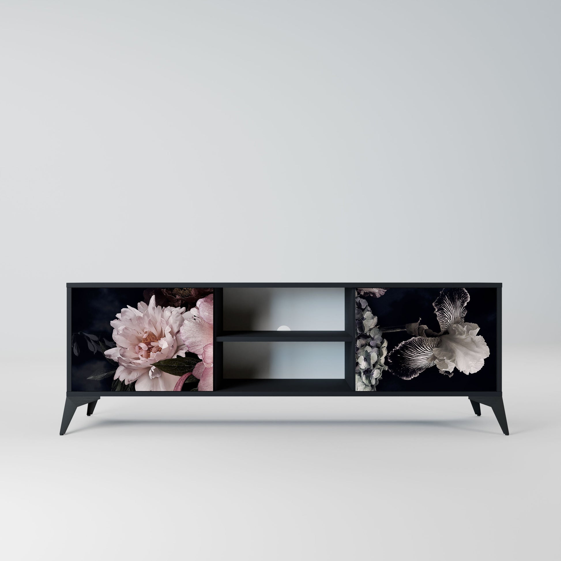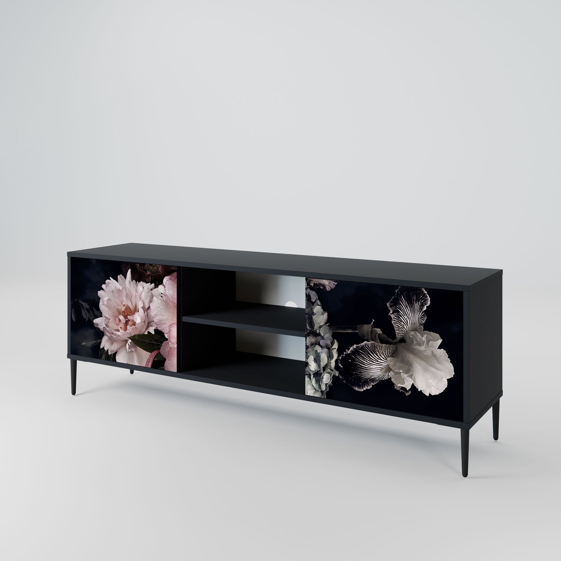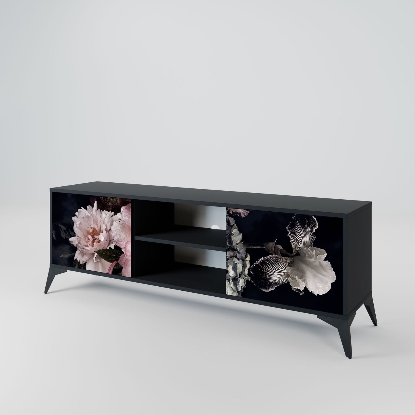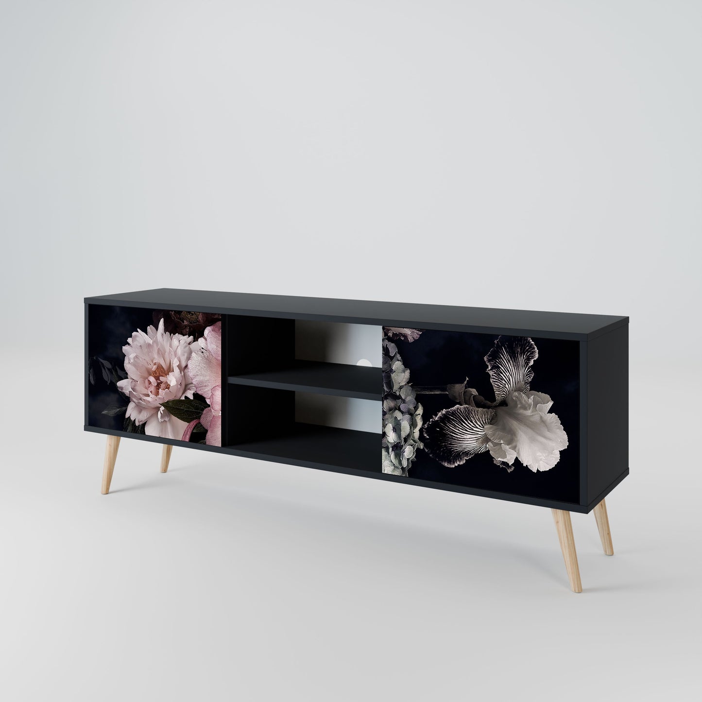 The black body gives the TV stand an elegant, modern look, while the fronts with an exceptional print draw attention, making it the focal point of any room. The spacious interior provides room for electronic devices, cables, remotes, and other accessories, helping you maintain order and organization.