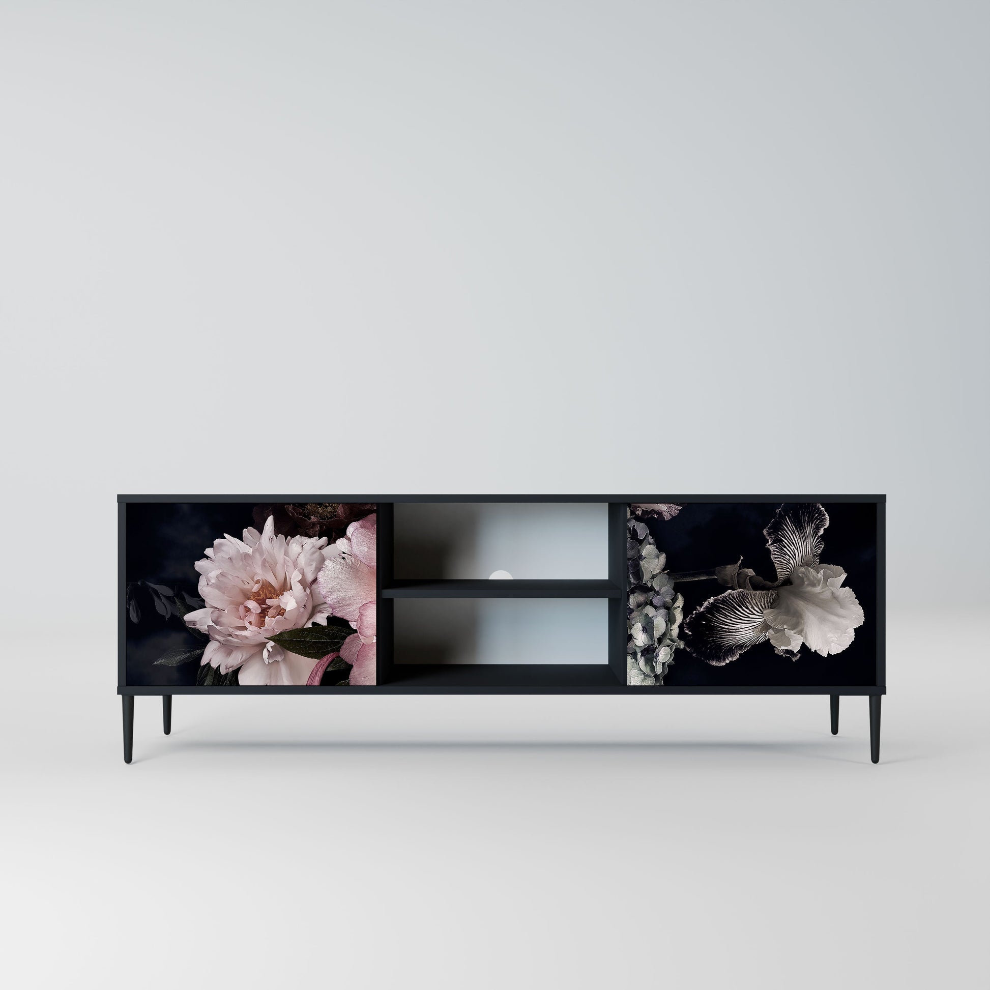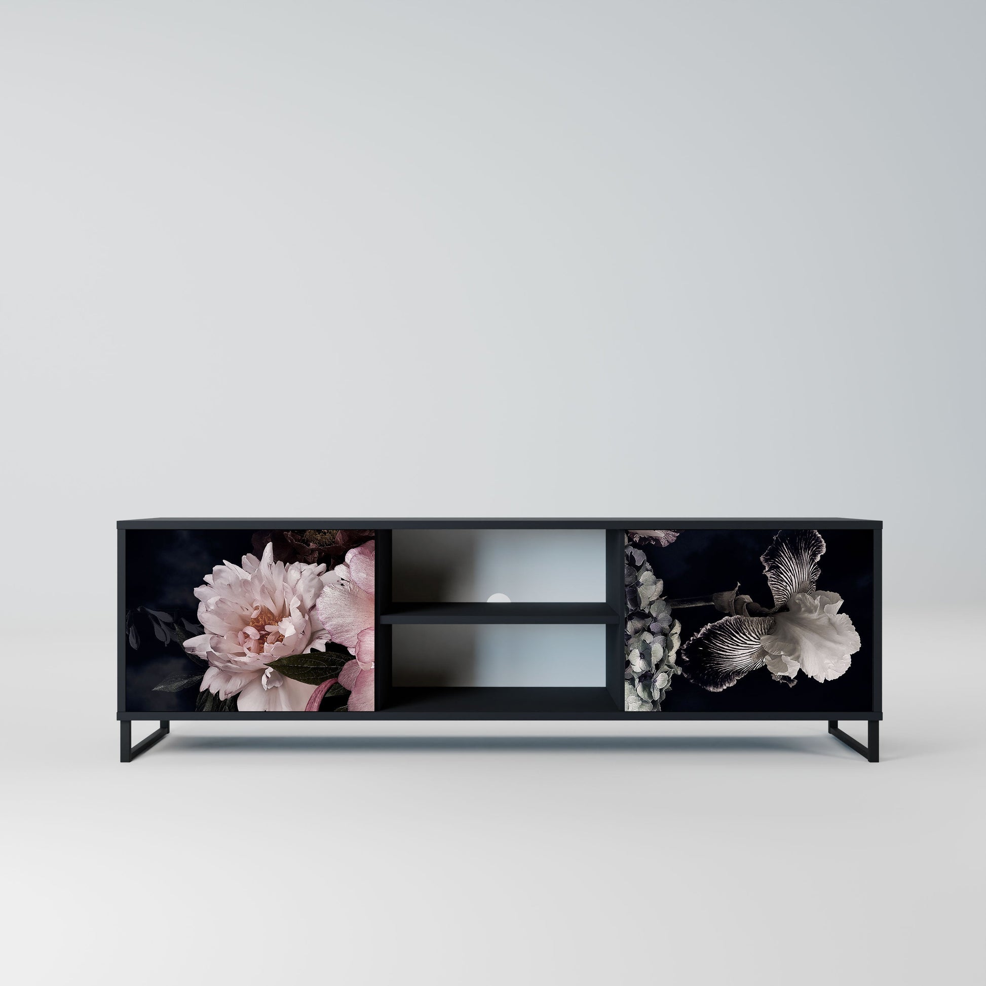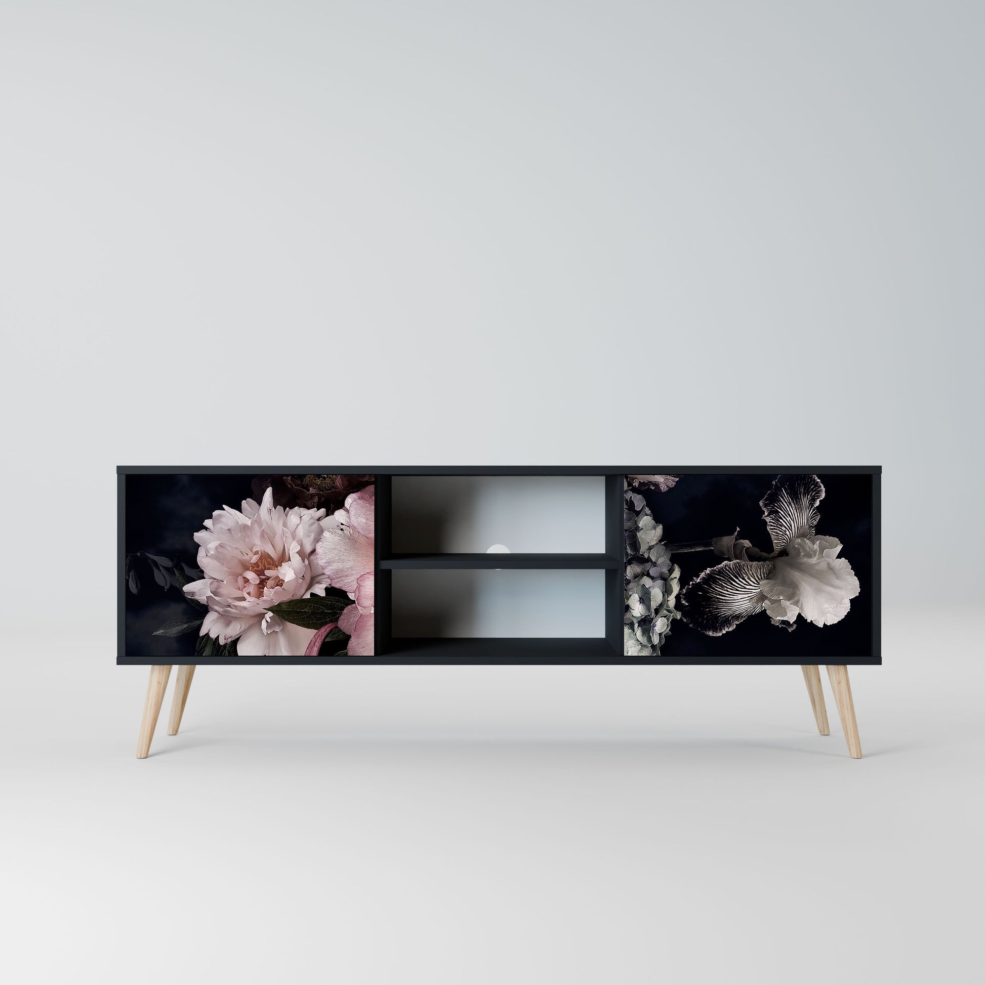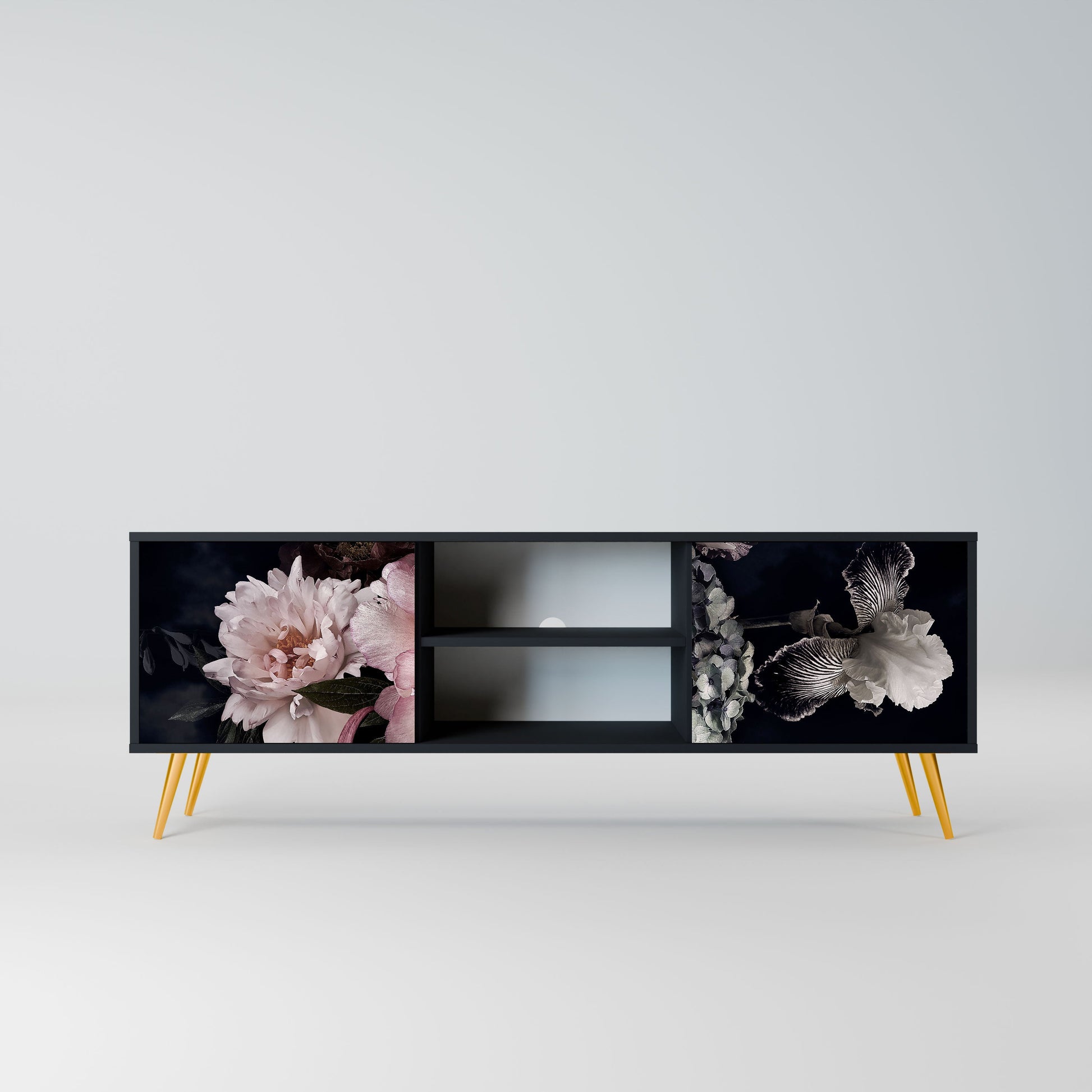 The black body gives the TV stand an elegant, modern look, while the fronts with an exceptional print draw attention, making it the focal point of any room. The spacious interior provides room for electronic devices, cables, remotes, and other accessories, helping you maintain order and organization.