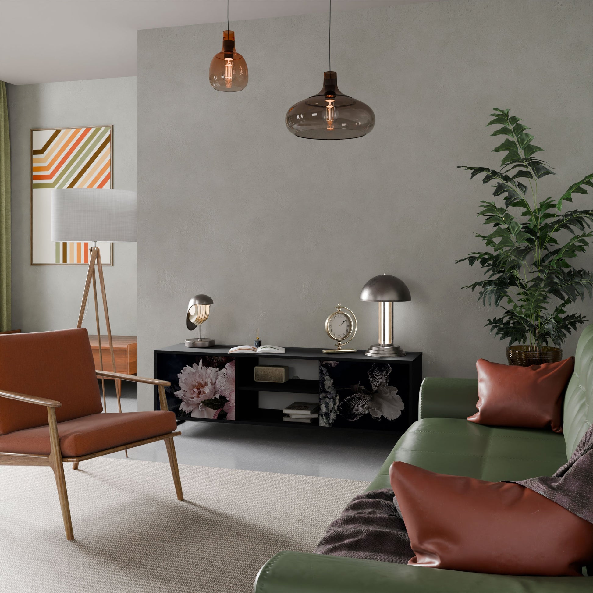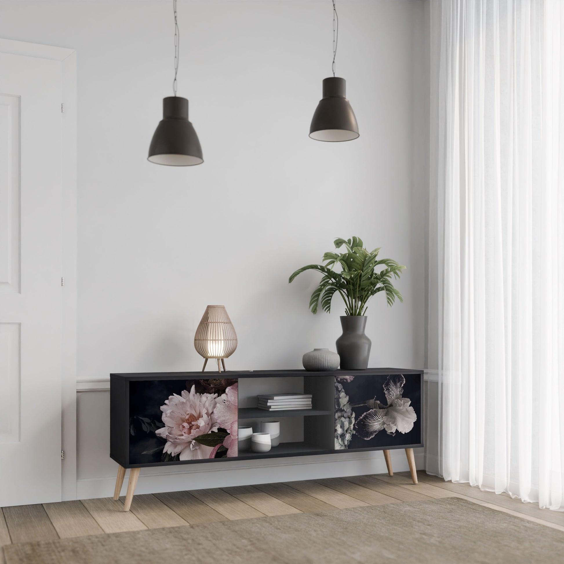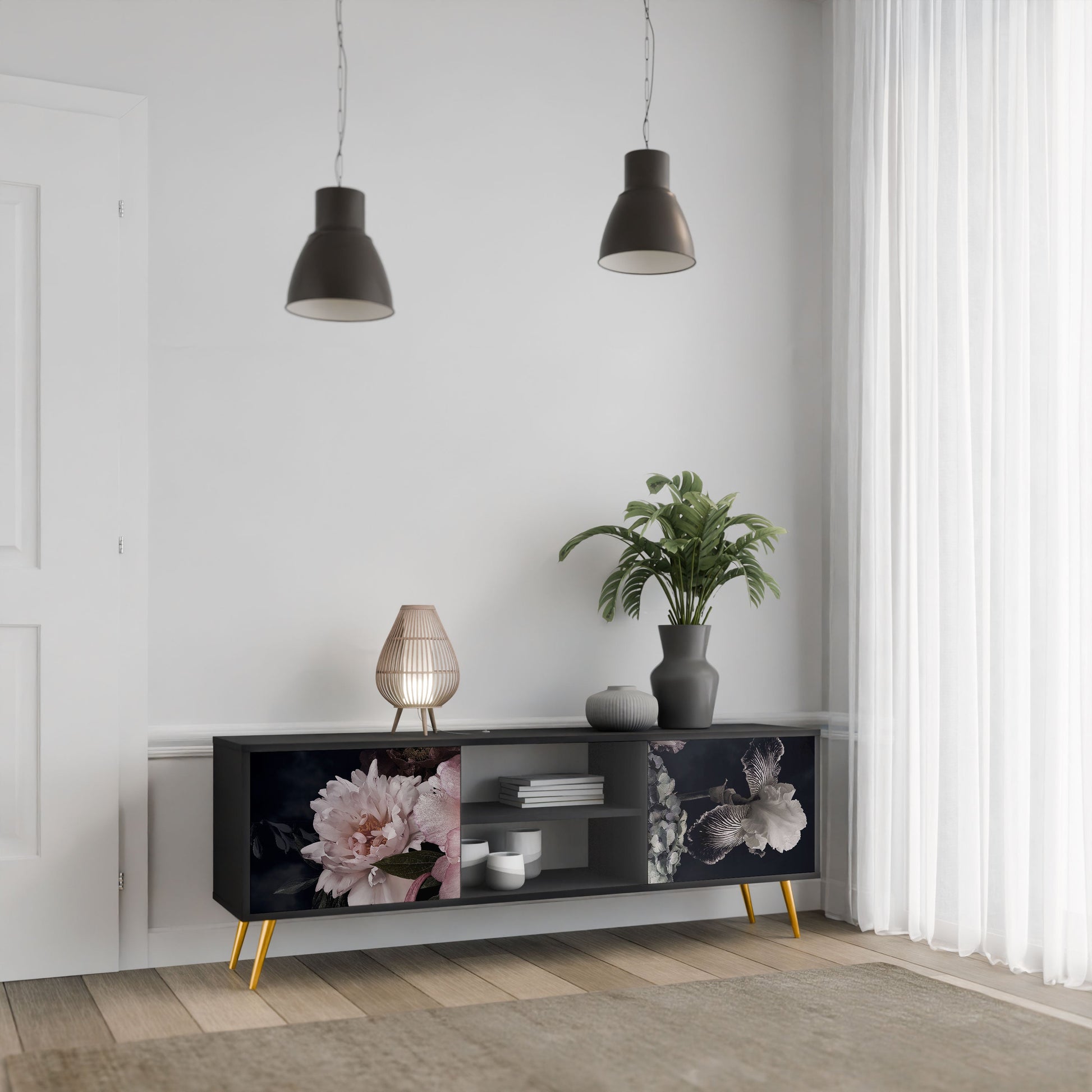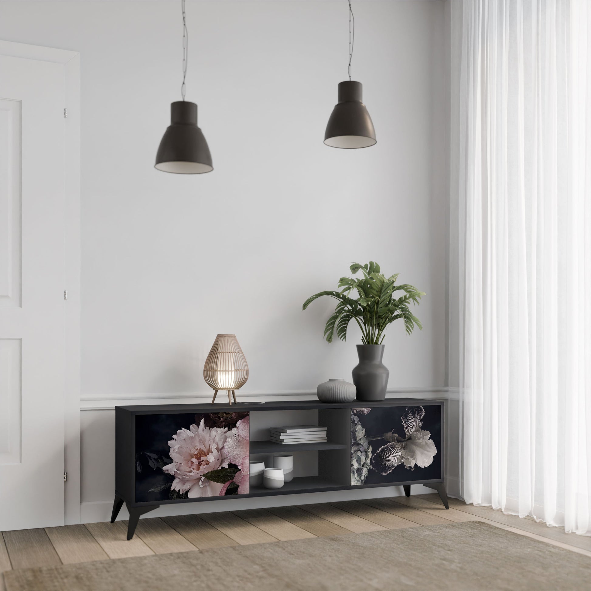 The black body gives the TV stand an elegant, modern look, while the fronts with an exceptional print draw attention, making it the focal point of any room. The spacious interior provides room for electronic devices, cables, remotes, and other accessories, helping you maintain order and organization.