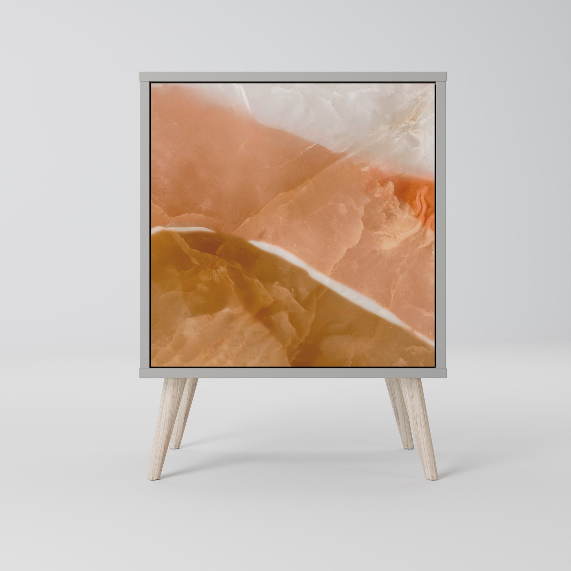This compact yet remarkably elegant piece of furniture impresses with its minimalist design, perfectly fitting into both modern and classic interiors. The subdued grey color of the body gives the furniture a subtle yet distinctive character, while the fronts with a unique print add an artistic touch.