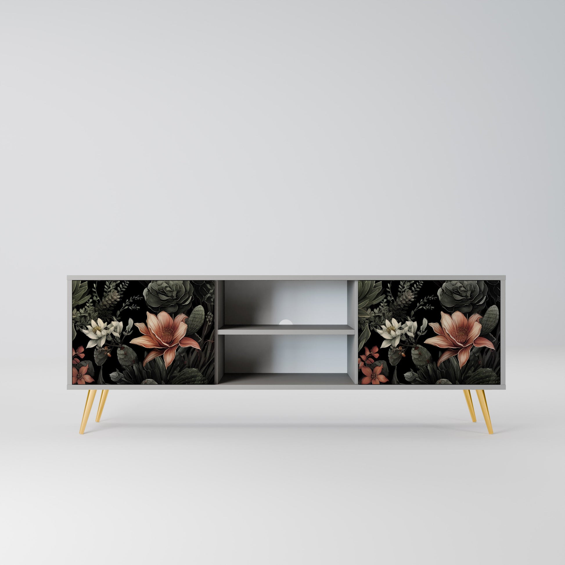 The grey body lends the TV stand a contemporary, refined look, while the fronts with an exceptional print capture attention, becoming the focal point of any room. The spacious interior provides room for electronic devices, cables, remotes, and other accessories, helping you maintain order and organization.
