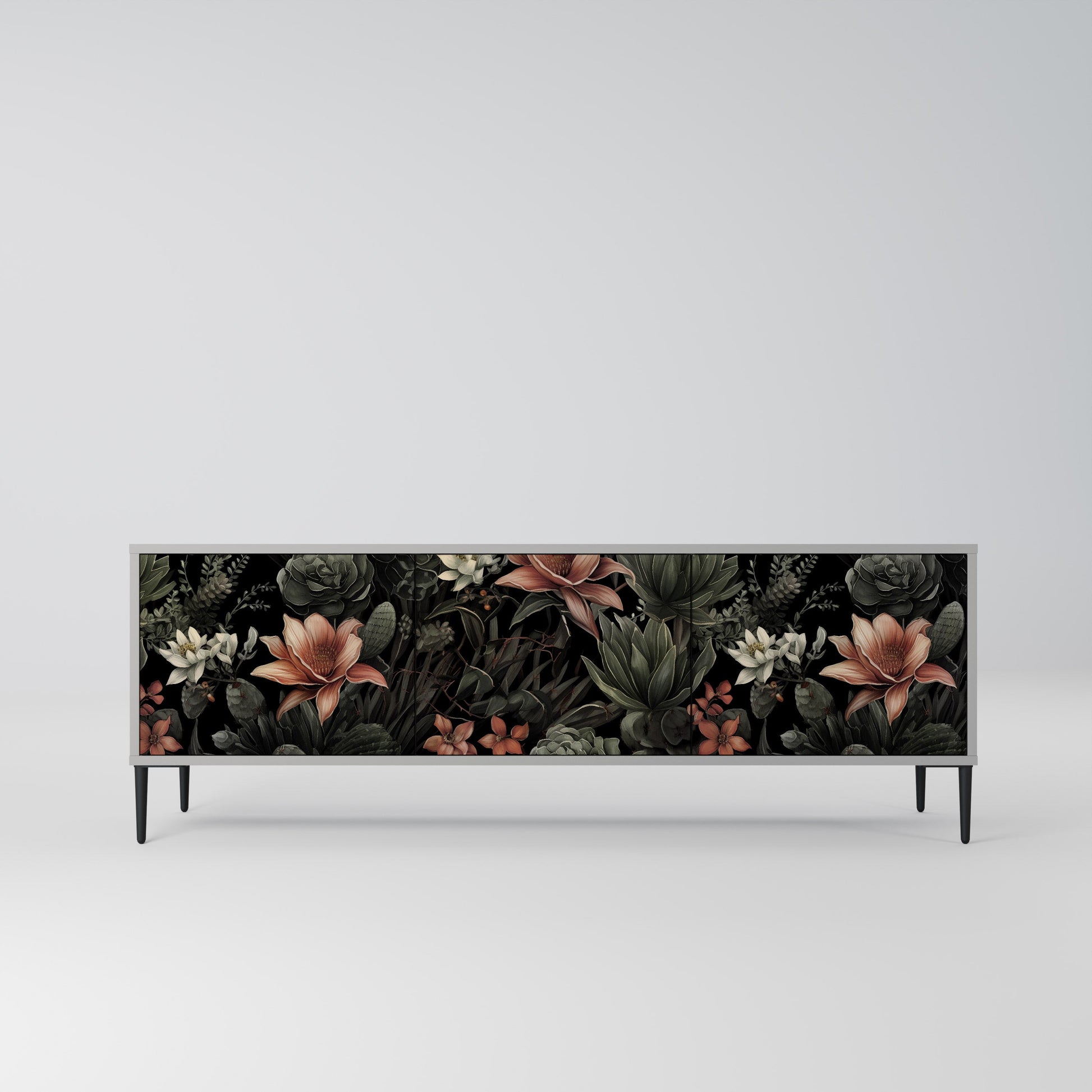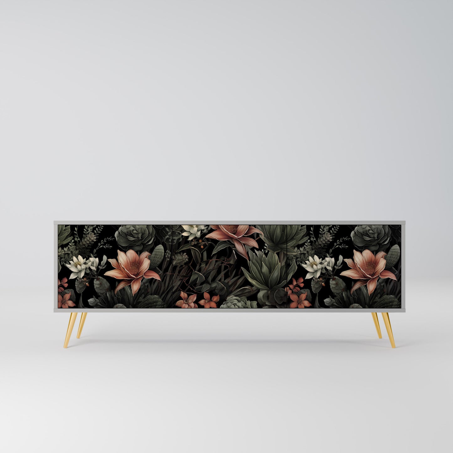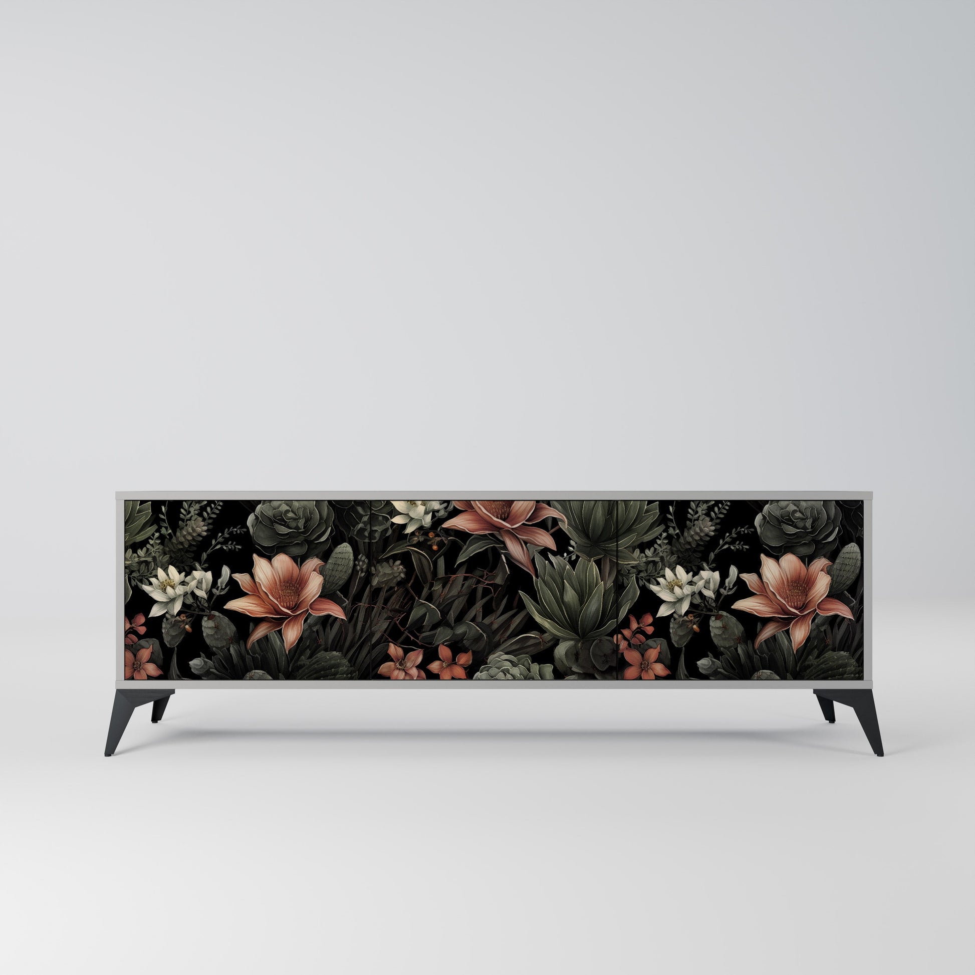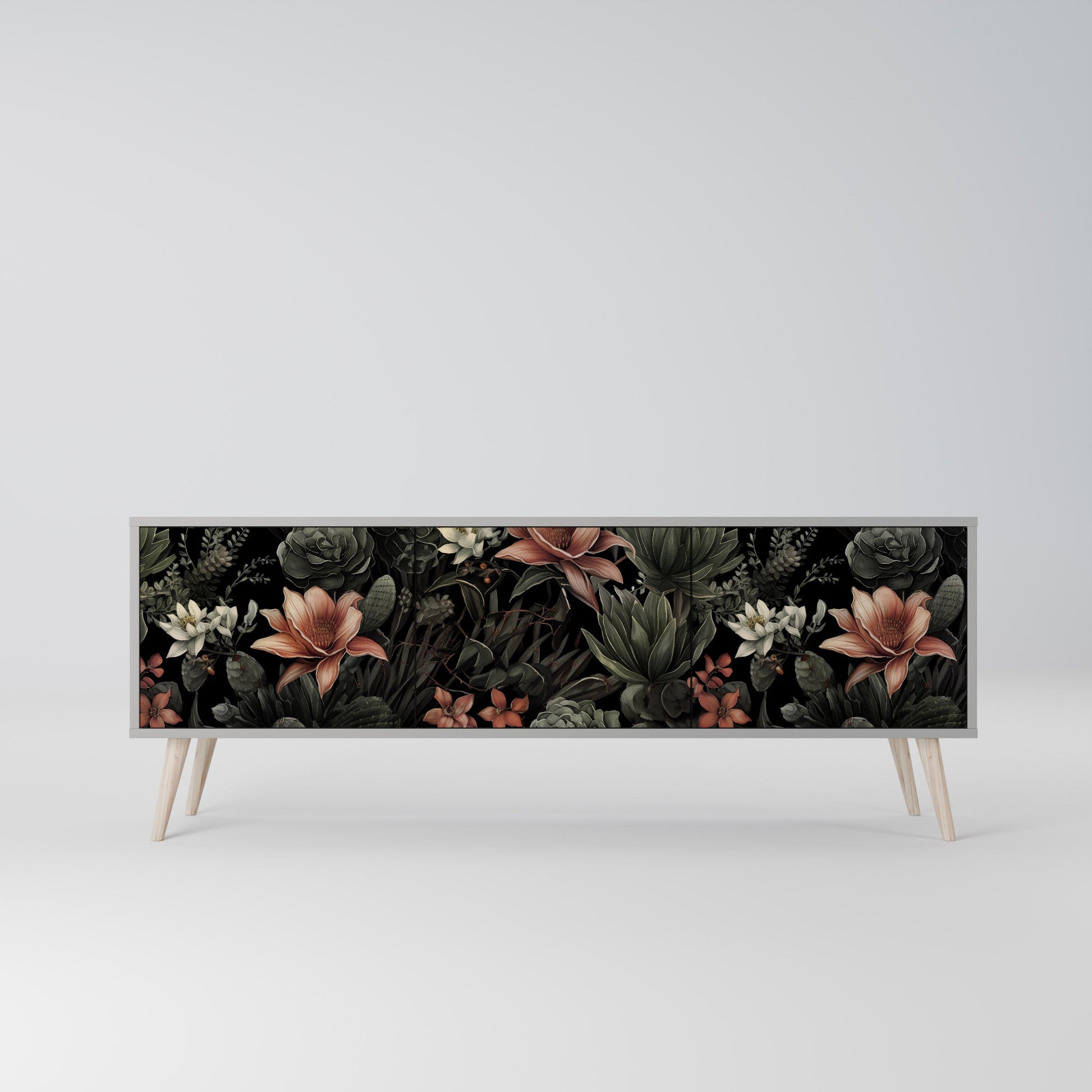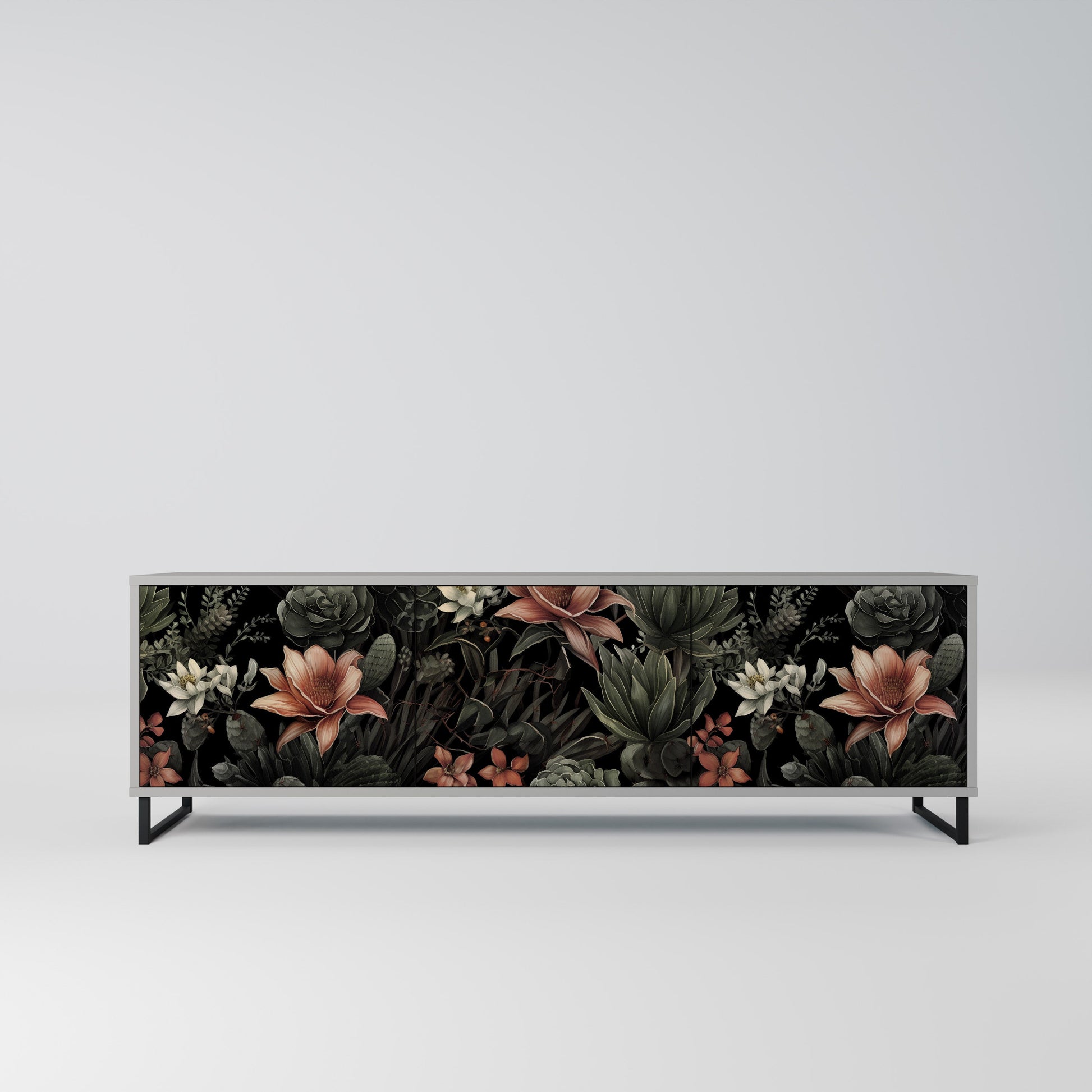 The grey body of the stand creates a refined, modern accent that pairs beautifully with industrial and minimalist arrangements. The fronts with a designer print add character and uniqueness, making this piece not only practical but also a standout decorative element.