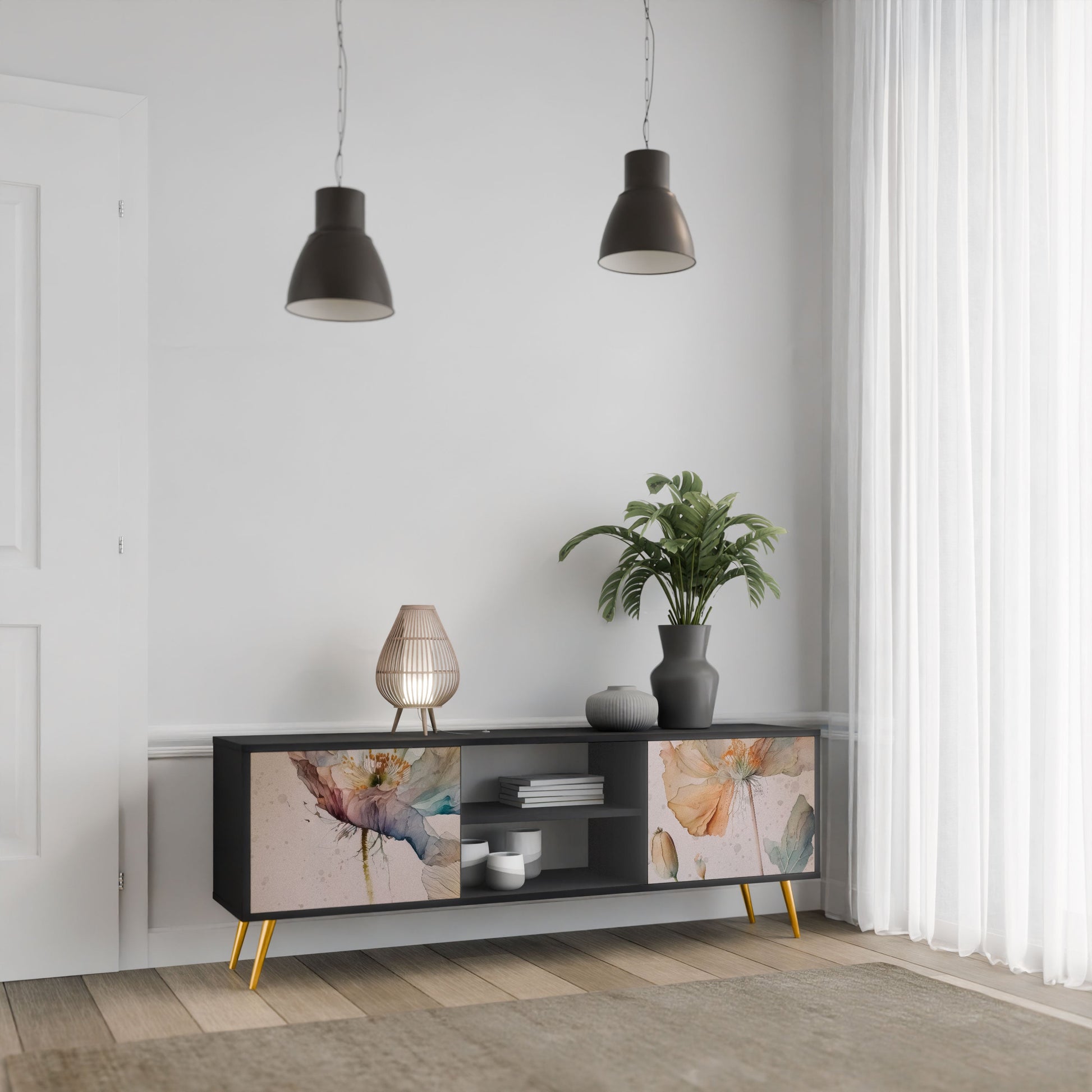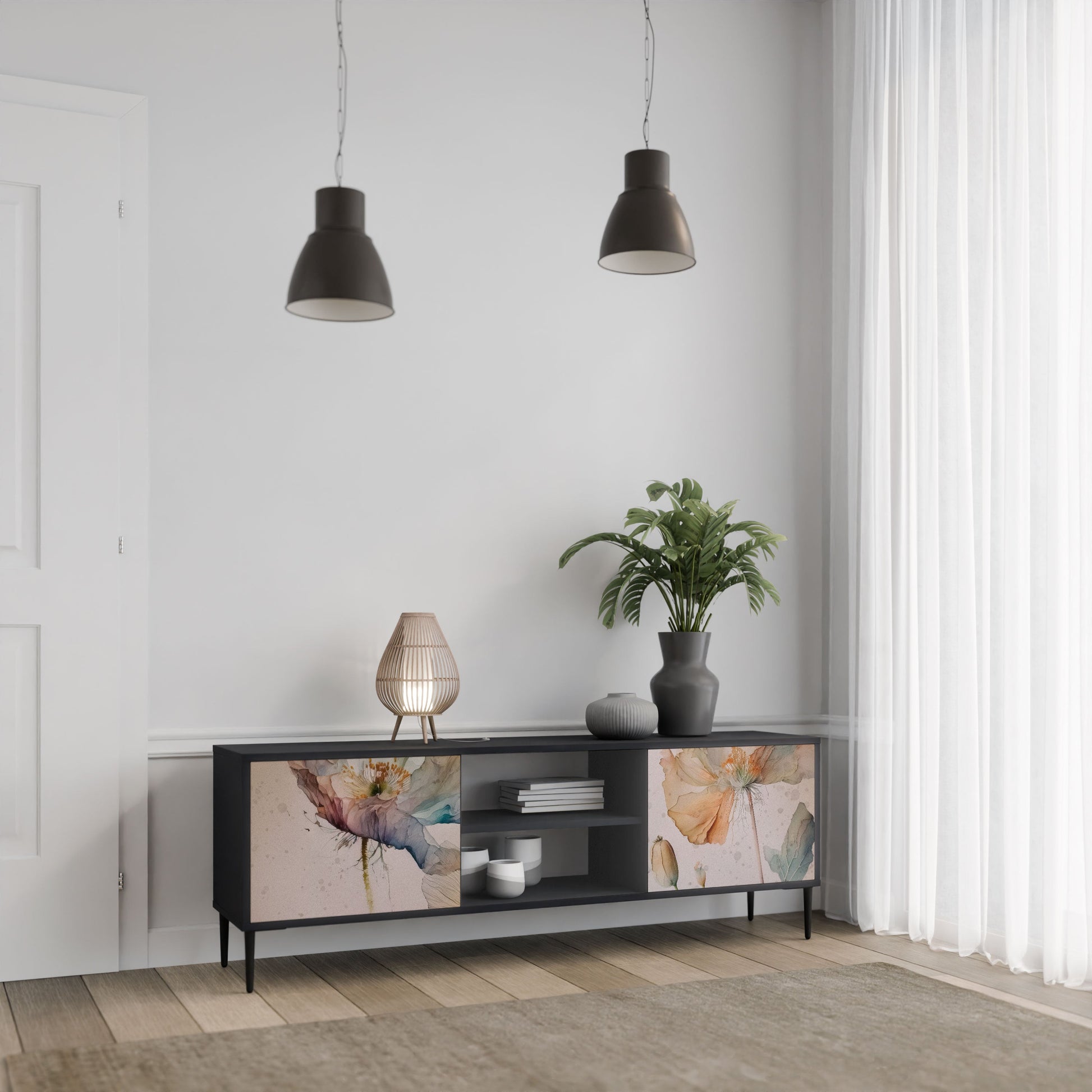 The black body gives the TV stand an elegant, modern look, while the fronts with an exceptional print draw attention, making it the focal point of any room. The spacious interior provides room for electronic devices, cables, remotes, and other accessories, helping you maintain order and organization.