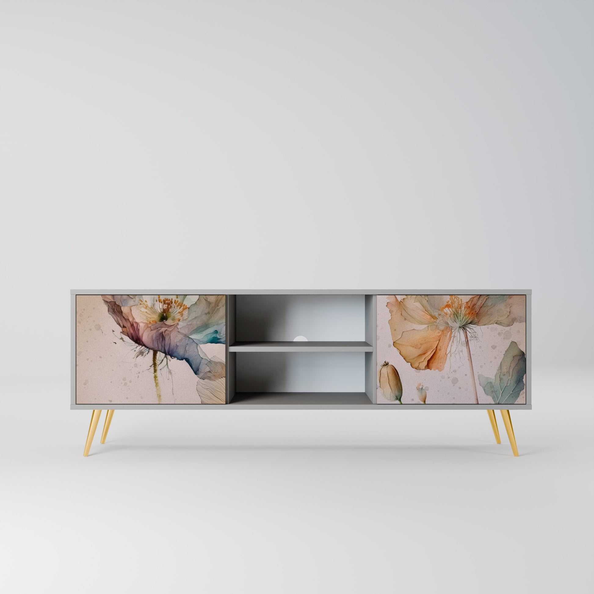 The grey body lends the TV stand a contemporary, refined look, while the fronts with an exceptional print capture attention, becoming the focal point of any room. The spacious interior provides room for electronic devices, cables, remotes, and other accessories, helping you maintain order and organization.
