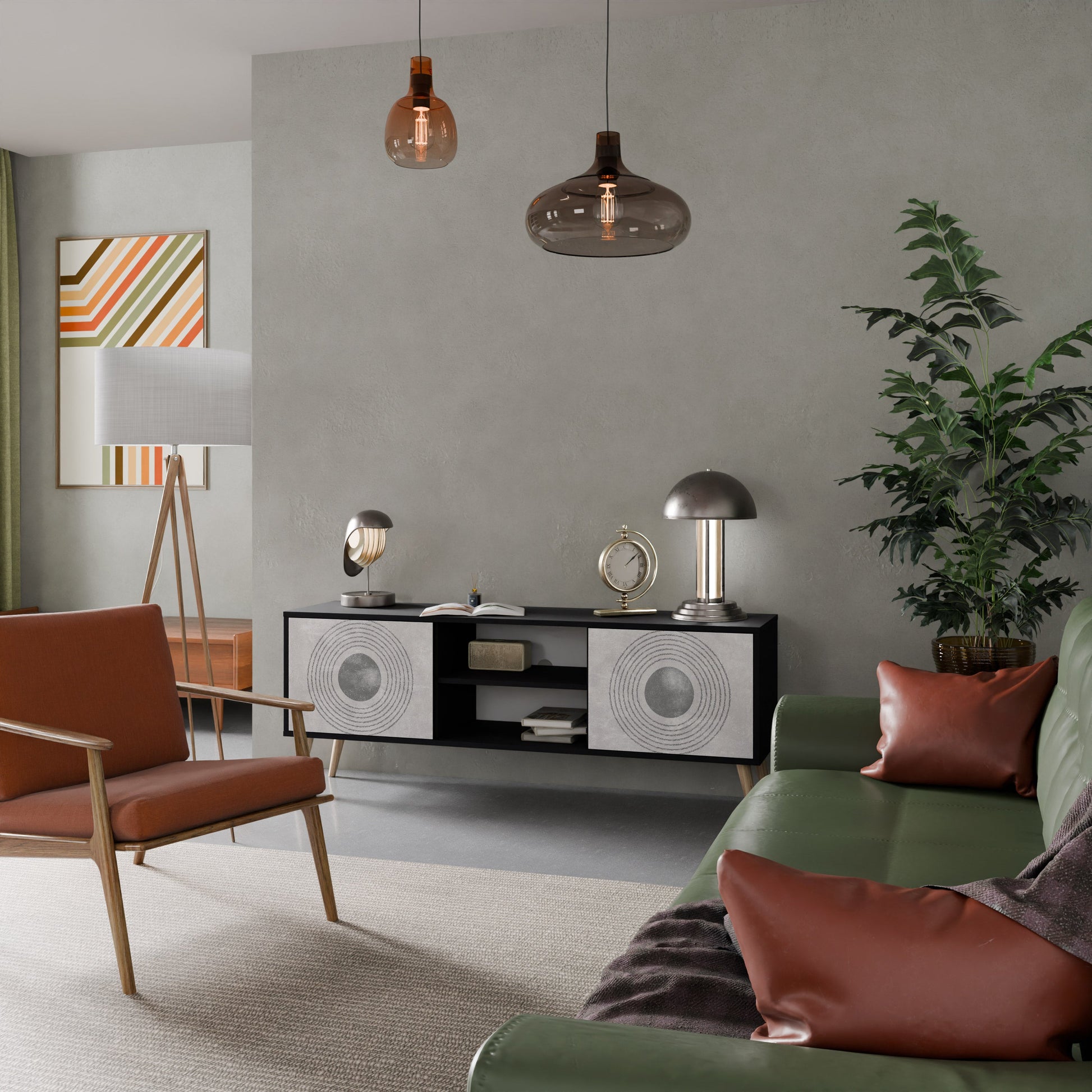 The black body gives the TV stand an elegant, modern look, while the fronts with an exceptional print draw attention, making it the focal point of any room. The spacious interior provides room for electronic devices, cables, remotes, and other accessories, helping you maintain order and organization.