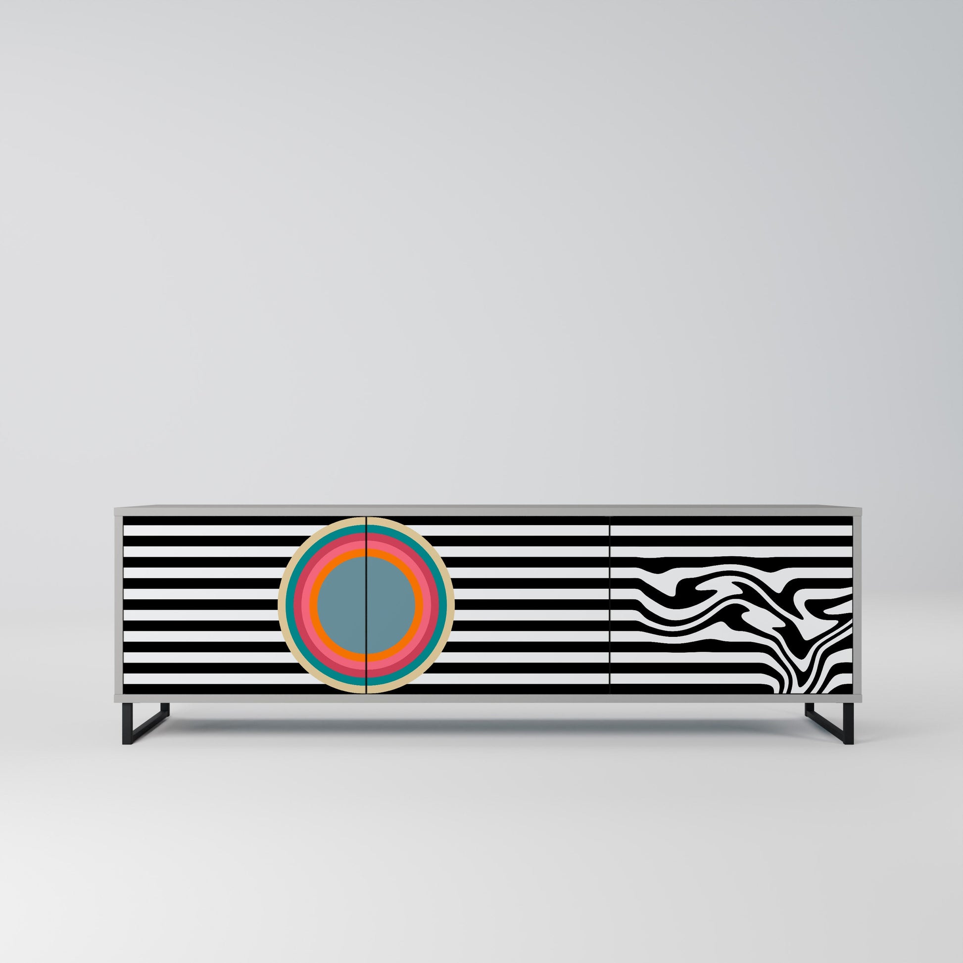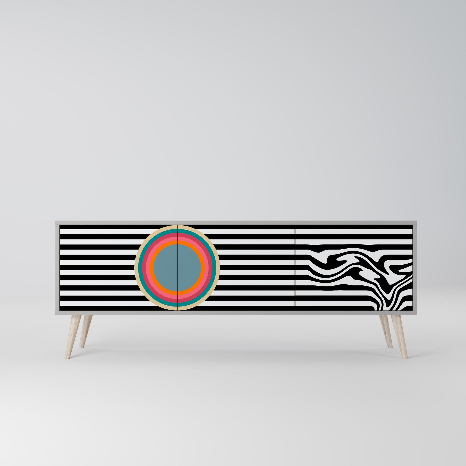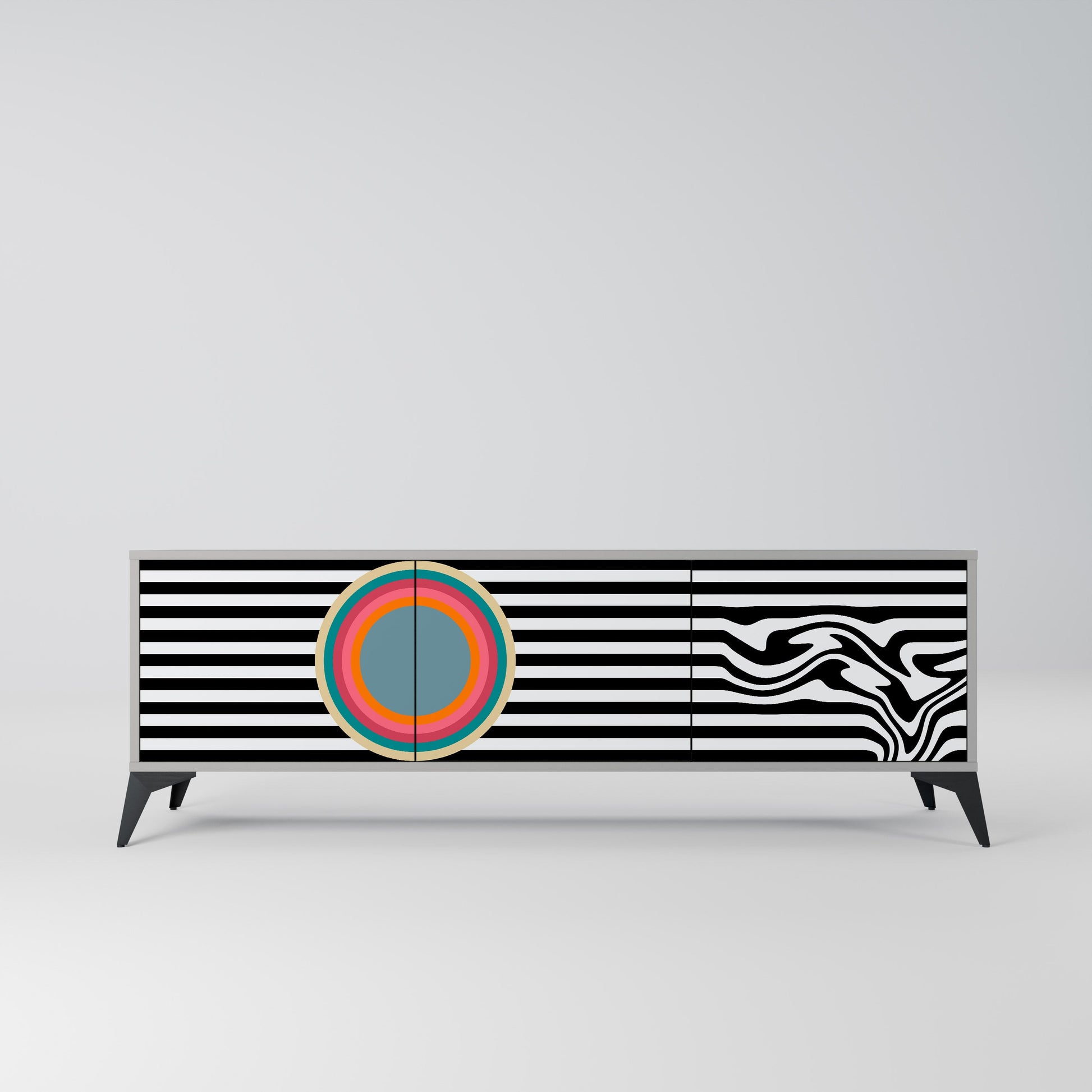 The grey body of the stand creates a refined, modern accent that pairs beautifully with industrial and minimalist arrangements. The fronts with a designer print add character and uniqueness, making this piece not only practical but also a standout decorative element.