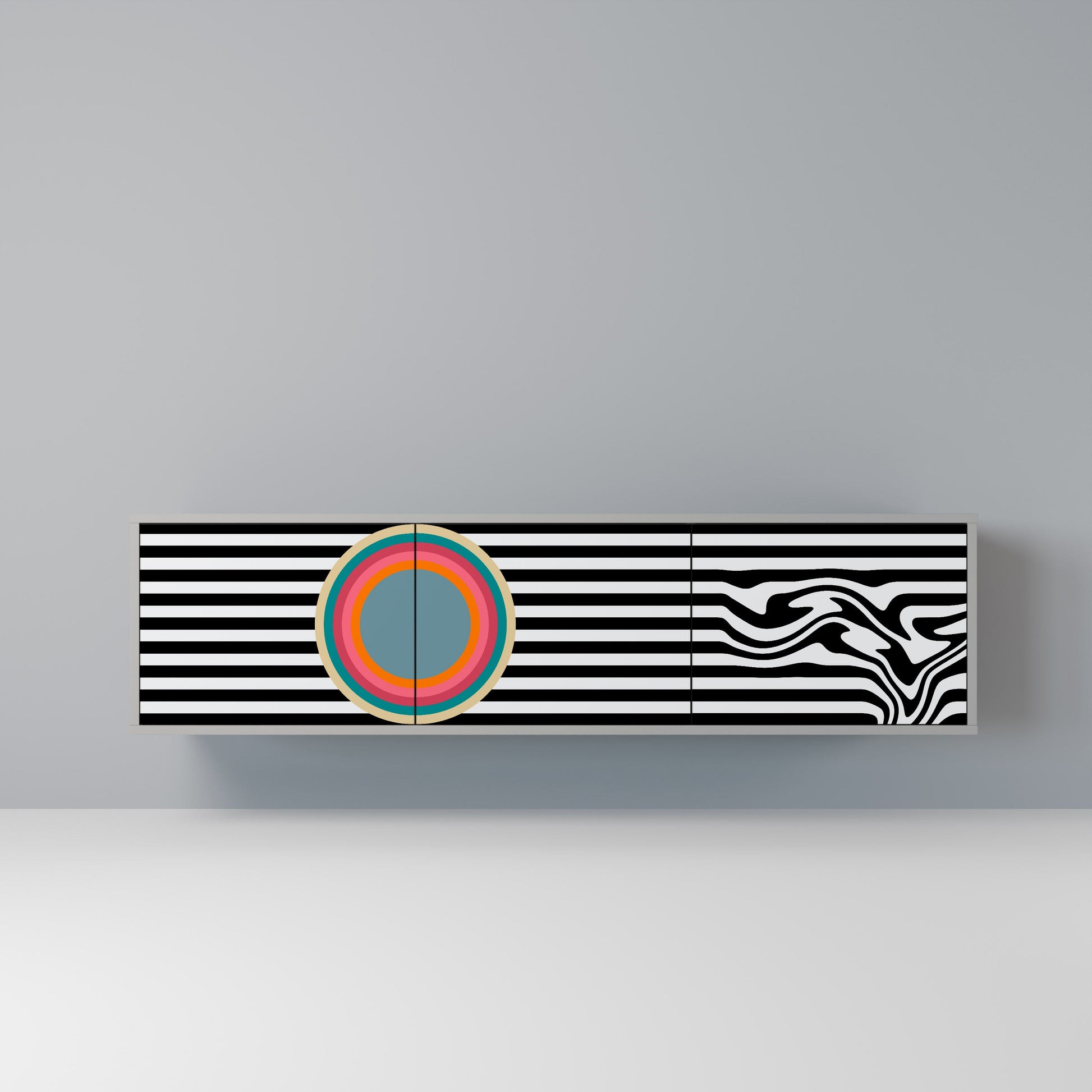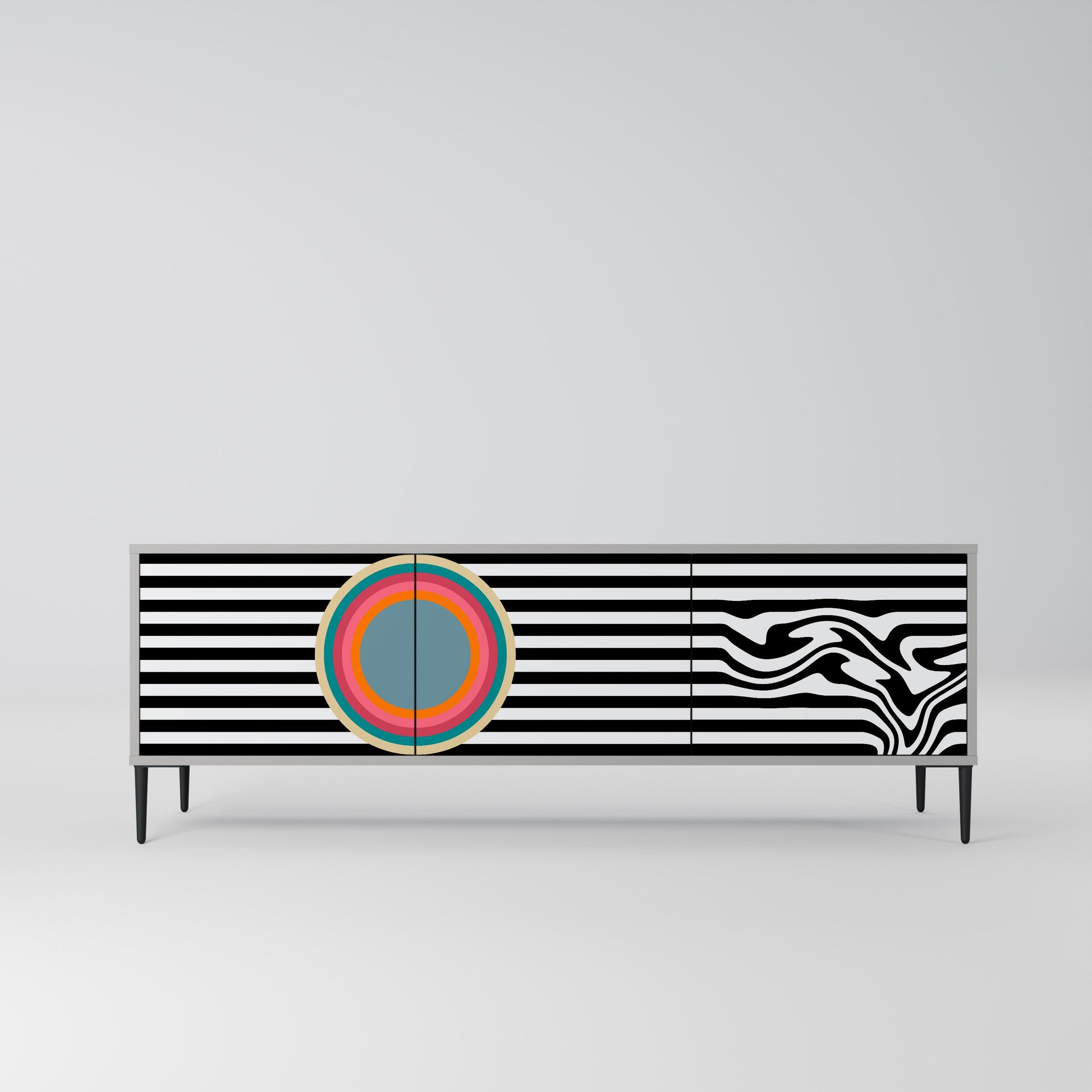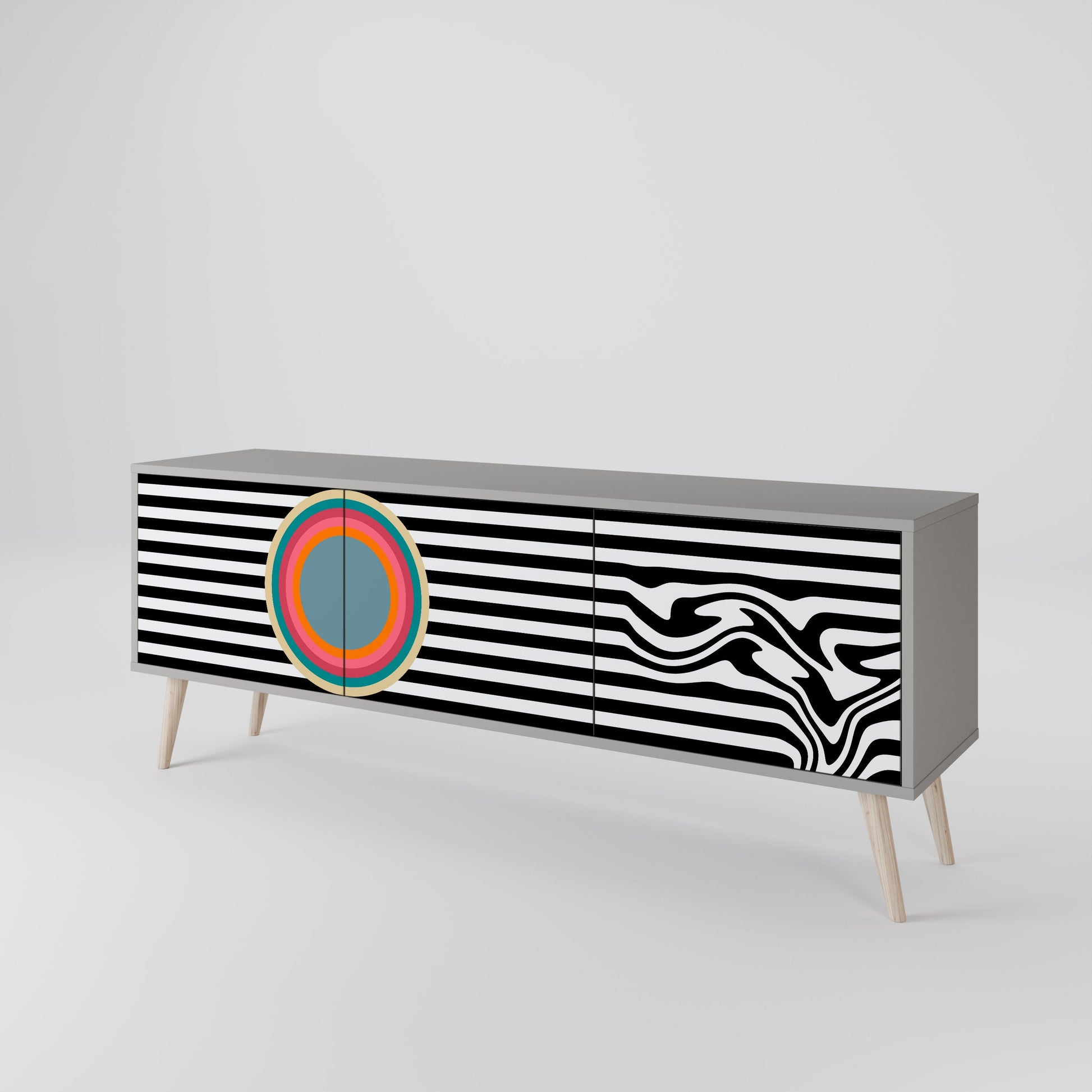The grey body of the stand creates a refined, modern accent that pairs beautifully with industrial and minimalist arrangements. The fronts with a designer print add character and uniqueness, making this piece not only practical but also a standout decorative element.