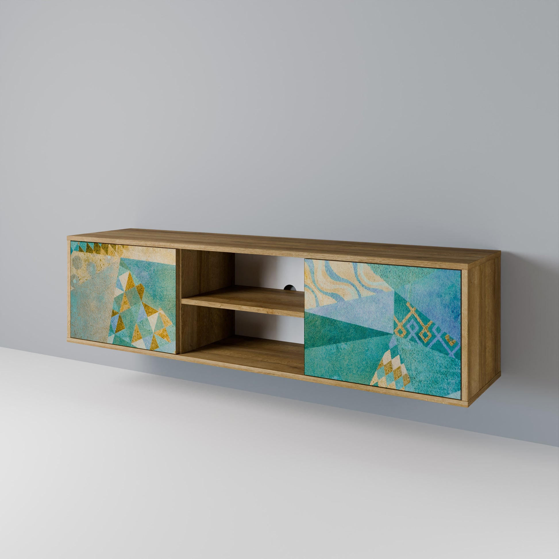 We invite you to discover our 2-door TV stand that combines simplicity with exceptional style. Made from the highest-quality materials, this elegant piece in oak tones, featuring wooden doors with a printed finish, is the perfect addition to any modern living room.