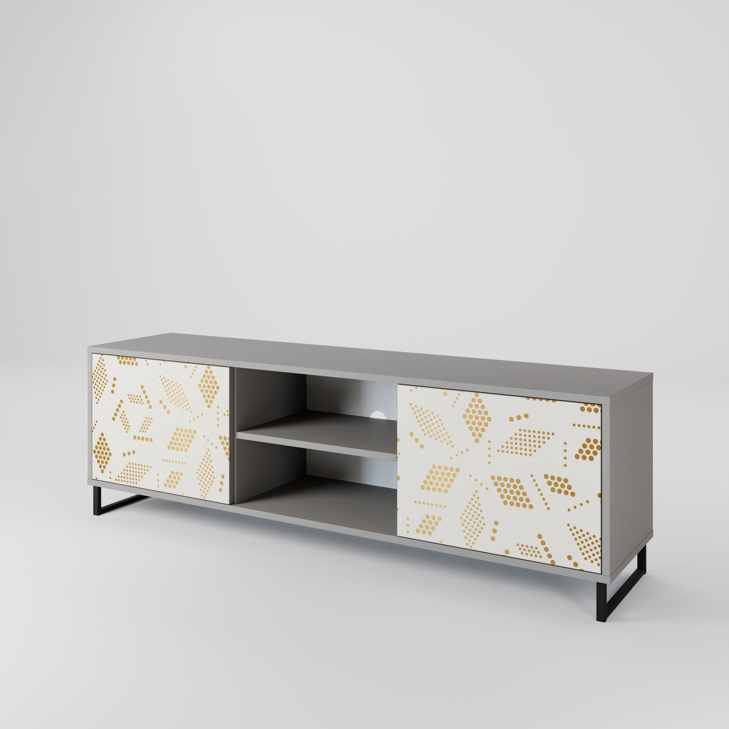 The grey body lends the TV stand a contemporary, refined look, while the fronts with an exceptional print capture attention, becoming the focal point of any room. The spacious interior provides room for electronic devices, cables, remotes, and other accessories, helping you maintain order and organization.