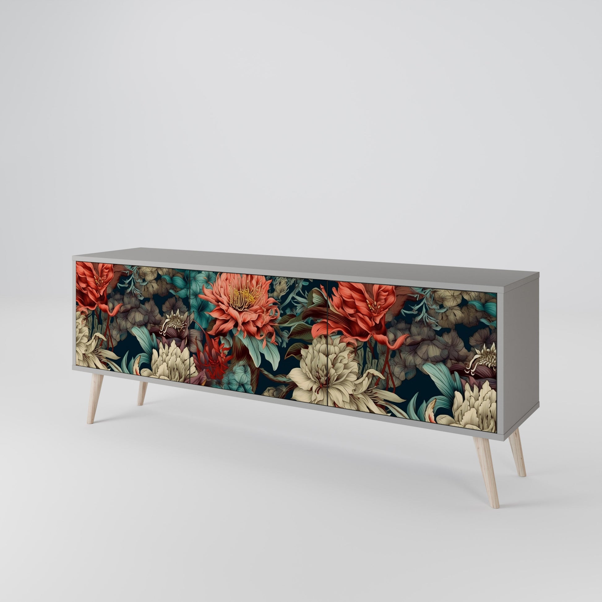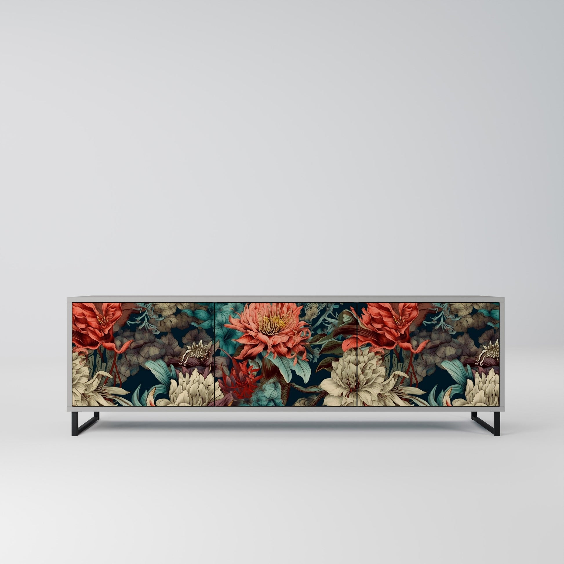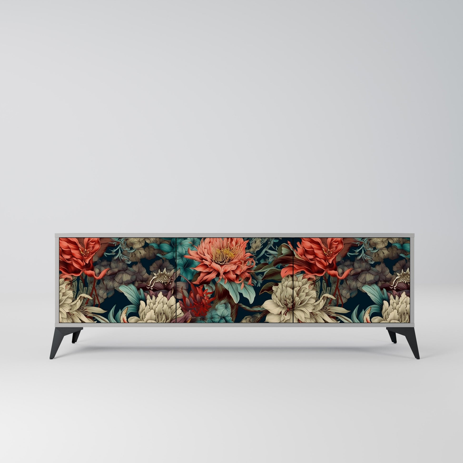 The grey body of the stand creates a refined, modern accent that pairs beautifully with industrial and minimalist arrangements. The fronts with a designer print add character and uniqueness, making this piece not only practical but also a standout decorative element.