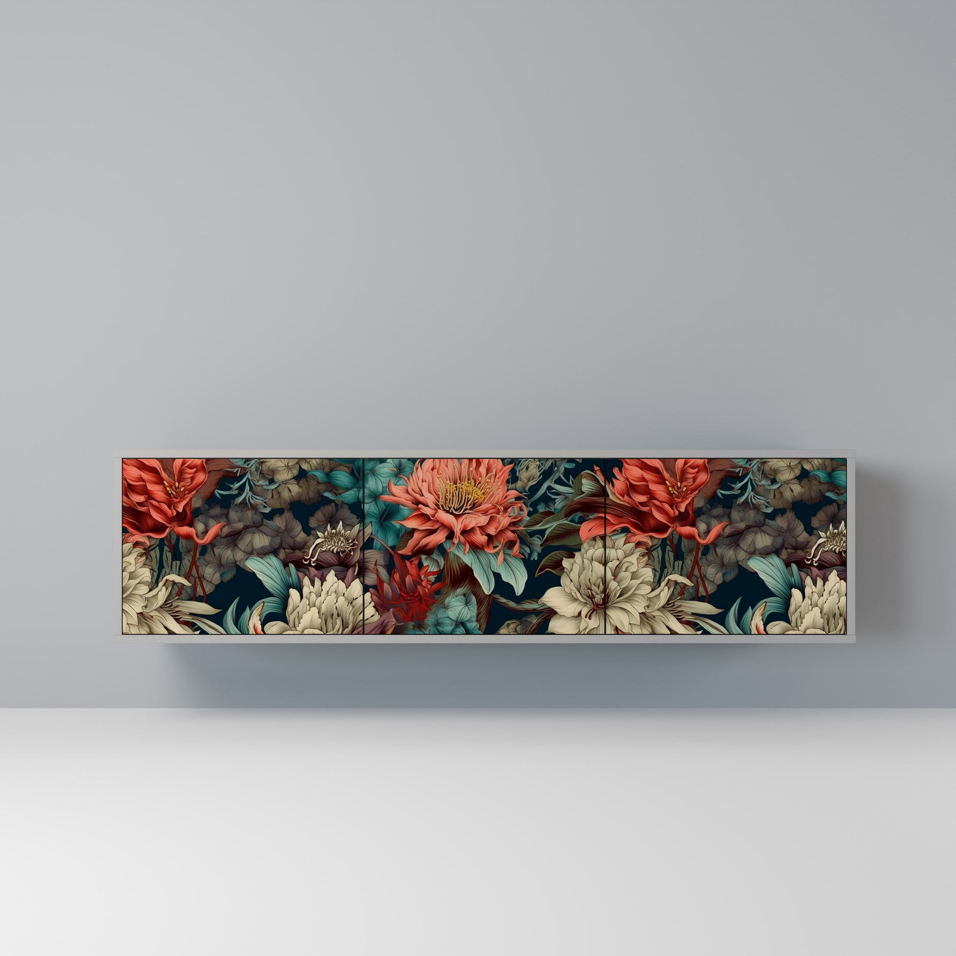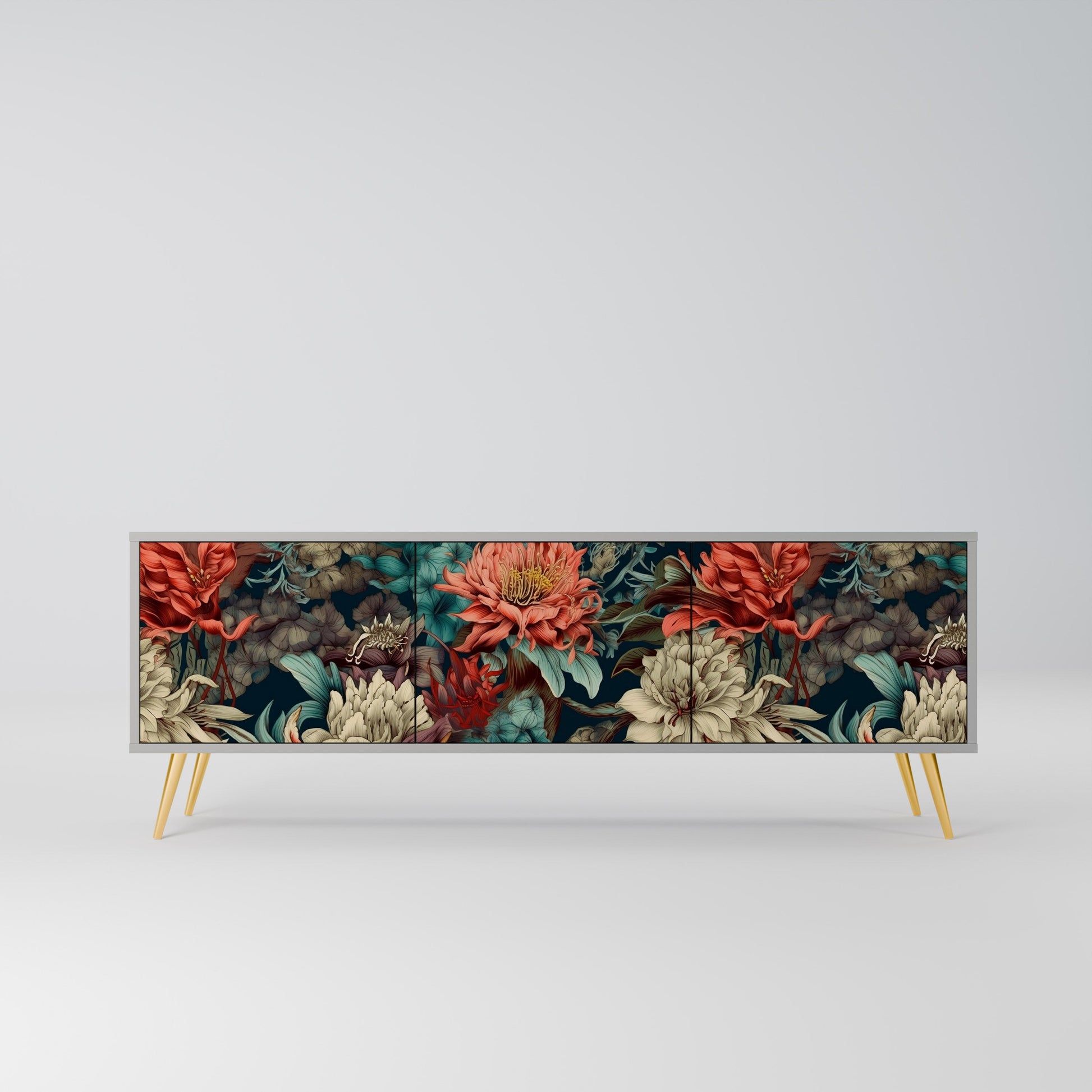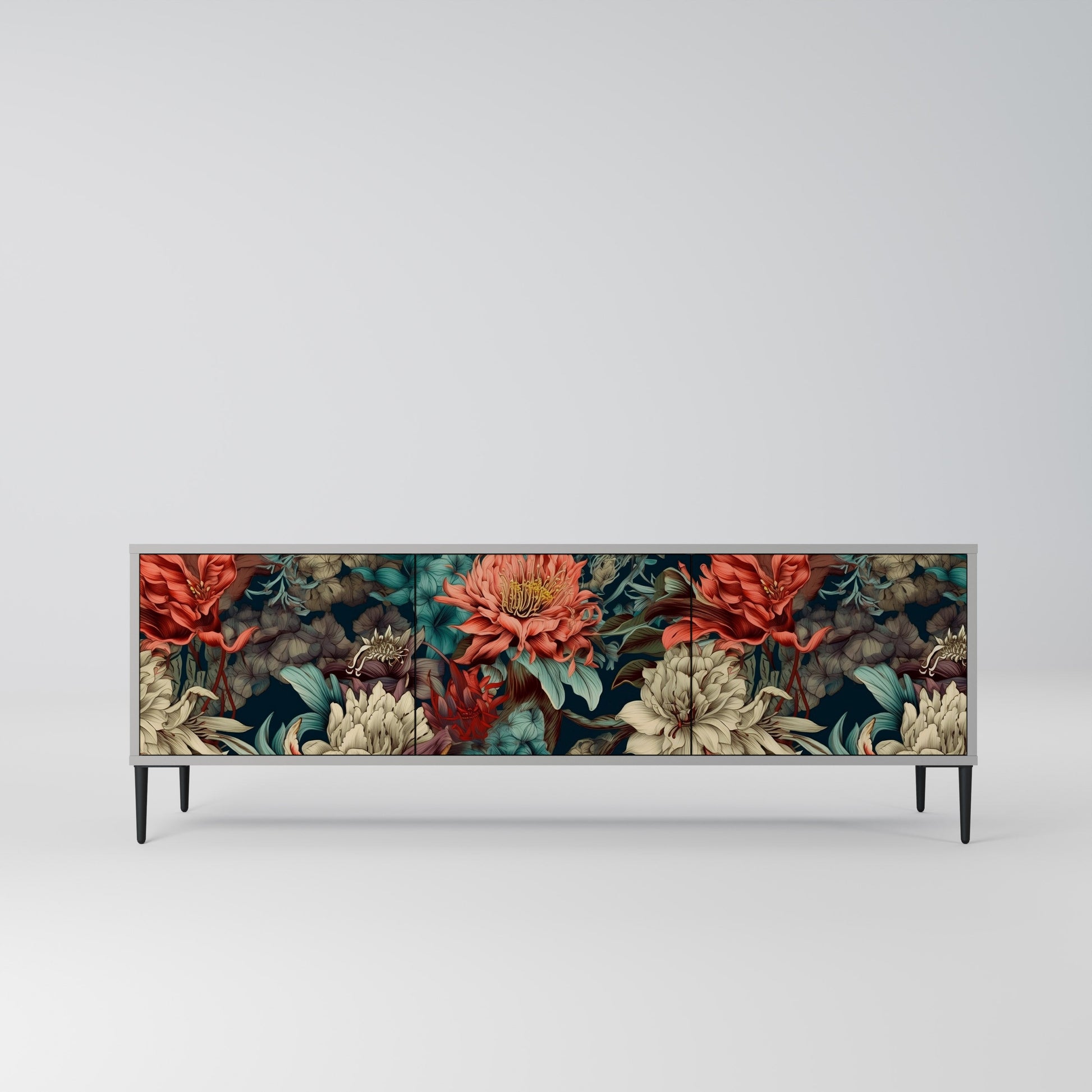 The grey body of the stand creates a refined, modern accent that pairs beautifully with industrial and minimalist arrangements. The fronts with a designer print add character and uniqueness, making this piece not only practical but also a standout decorative element.