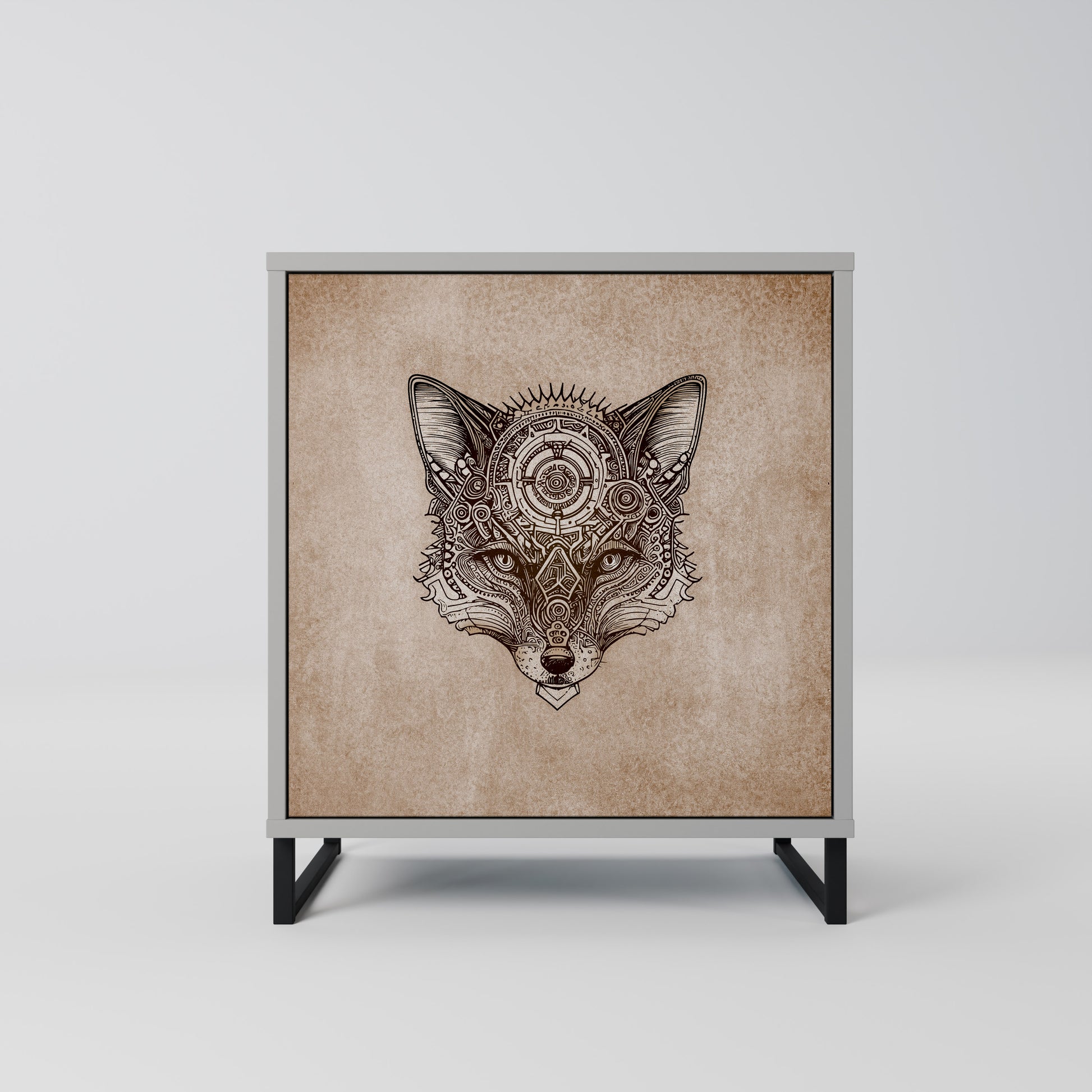 This compact yet remarkably elegant piece of furniture impresses with its minimalist design, perfectly fitting into both modern and classic interiors. The subdued grey color of the body gives the furniture a subtle yet distinctive character, while the fronts with a unique print add an artistic touch.