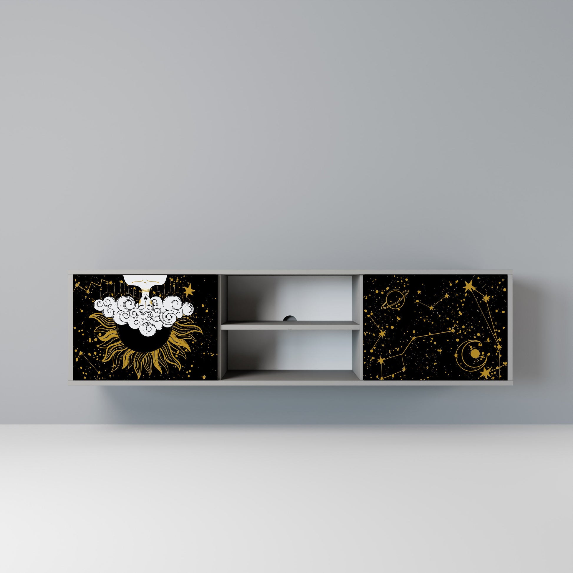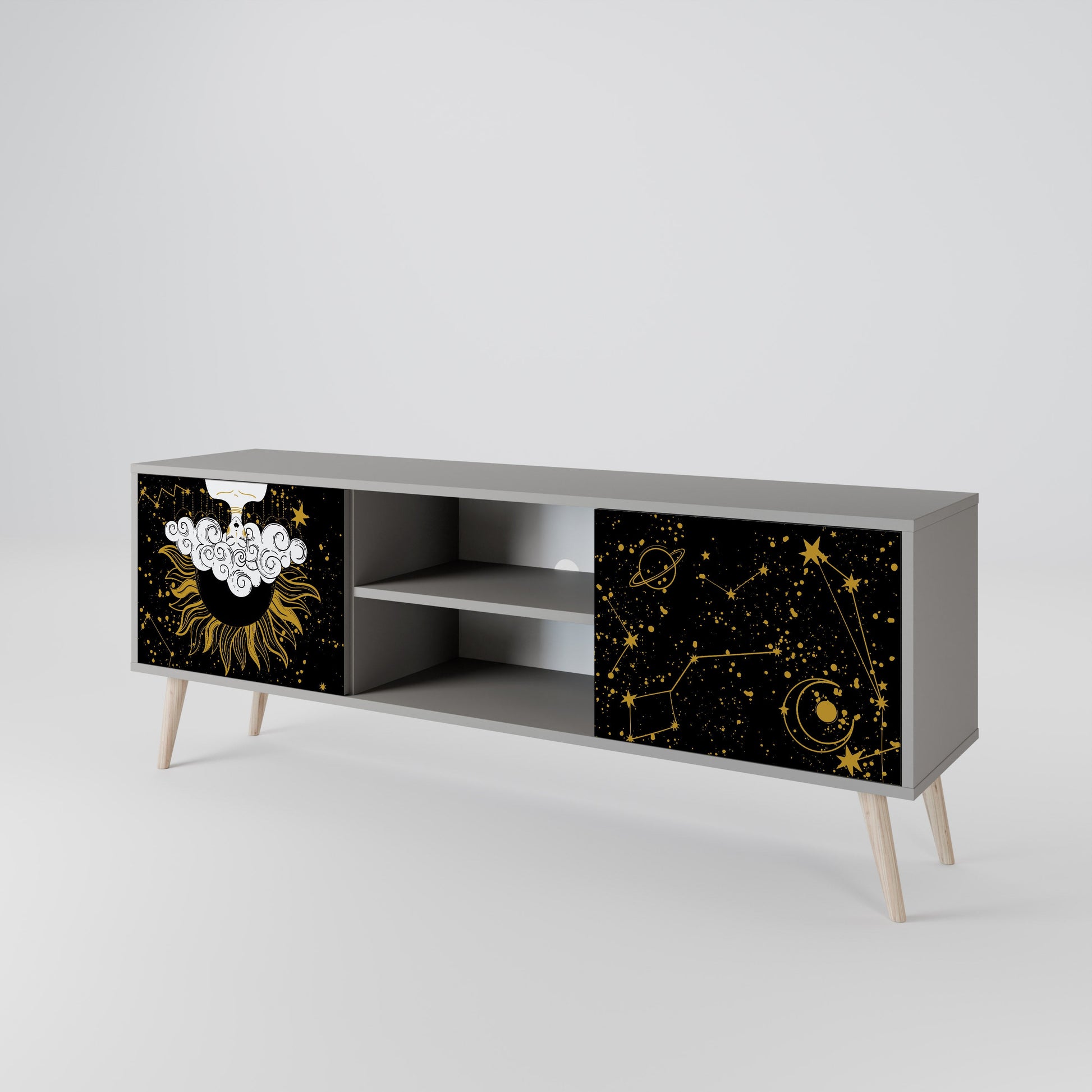 The grey body lends the TV stand a contemporary, refined look, while the fronts with an exceptional print capture attention, becoming the focal point of any room. The spacious interior provides room for electronic devices, cables, remotes, and other accessories, helping you maintain order and organization.