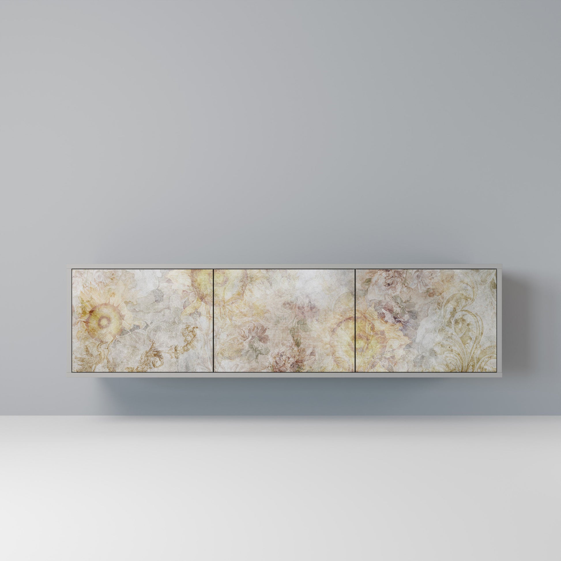 The grey body of the stand creates a refined, modern accent that pairs beautifully with industrial and minimalist arrangements. The fronts with a designer print add character and uniqueness, making this piece not only practical but also a standout decorative element.