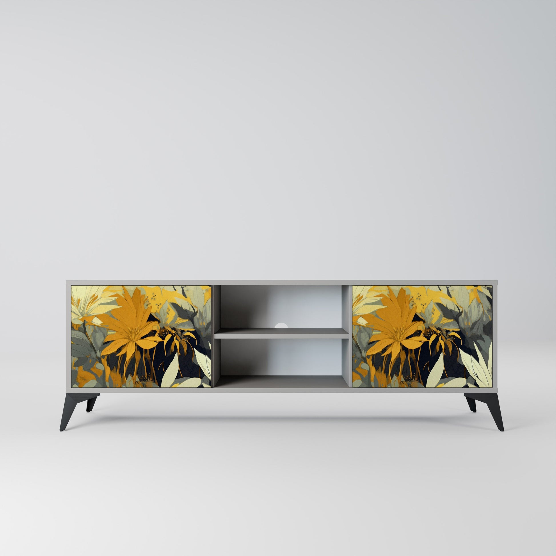 The grey body lends the TV stand a contemporary, refined look, while the fronts with an exceptional print capture attention, becoming the focal point of any room. The spacious interior provides room for electronic devices, cables, remotes, and other accessories, helping you maintain order and organization.