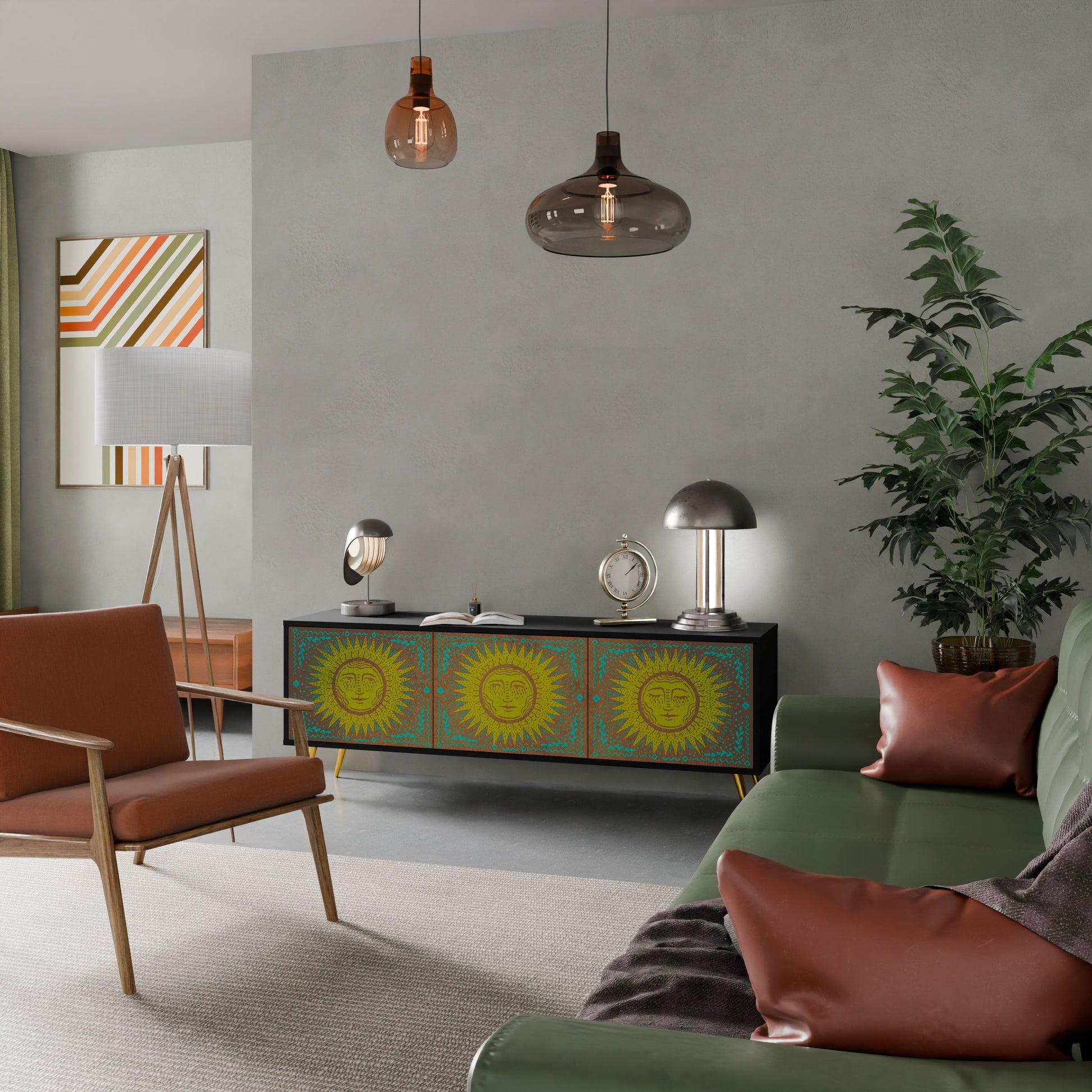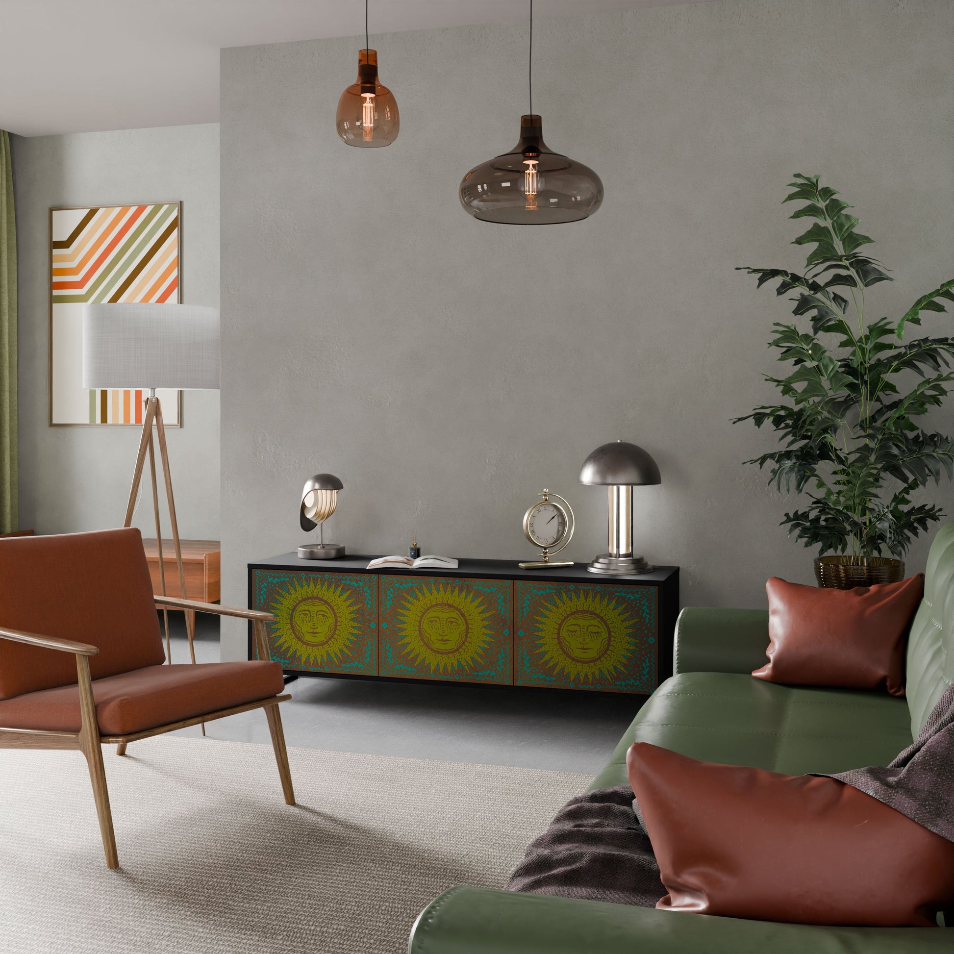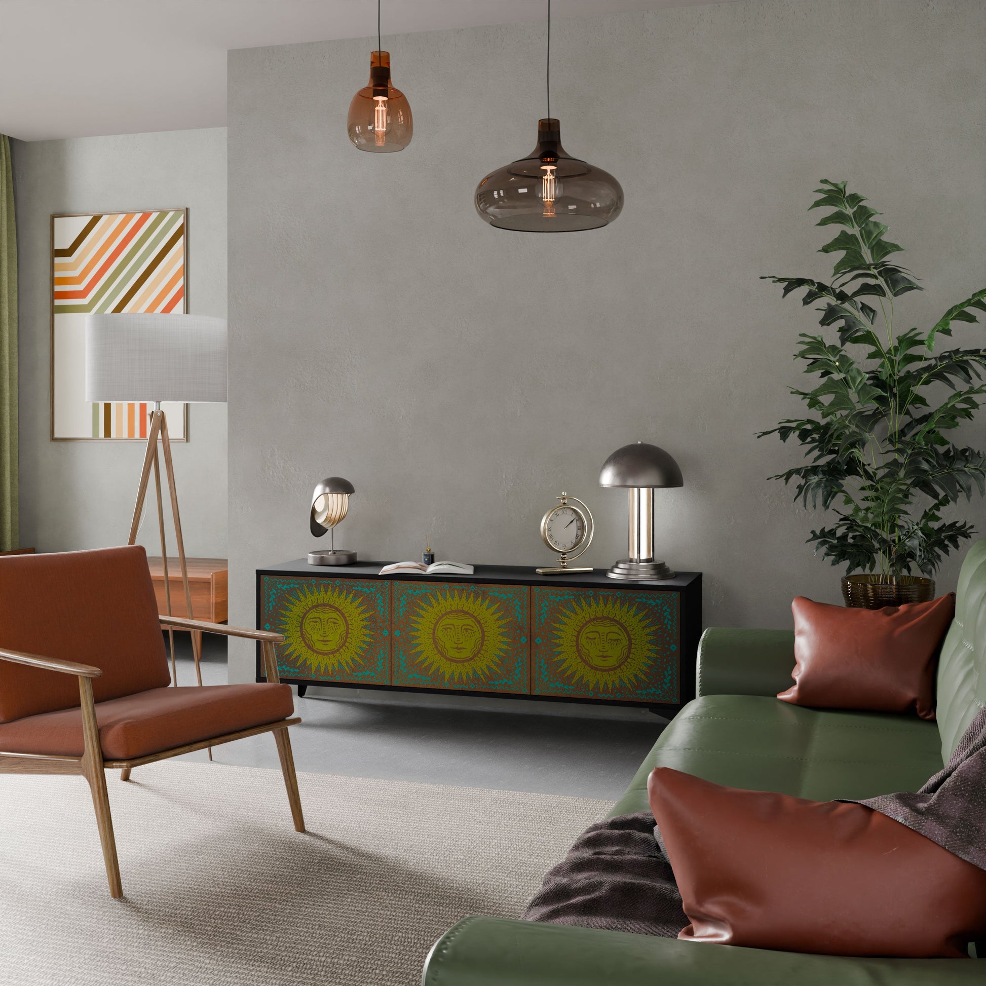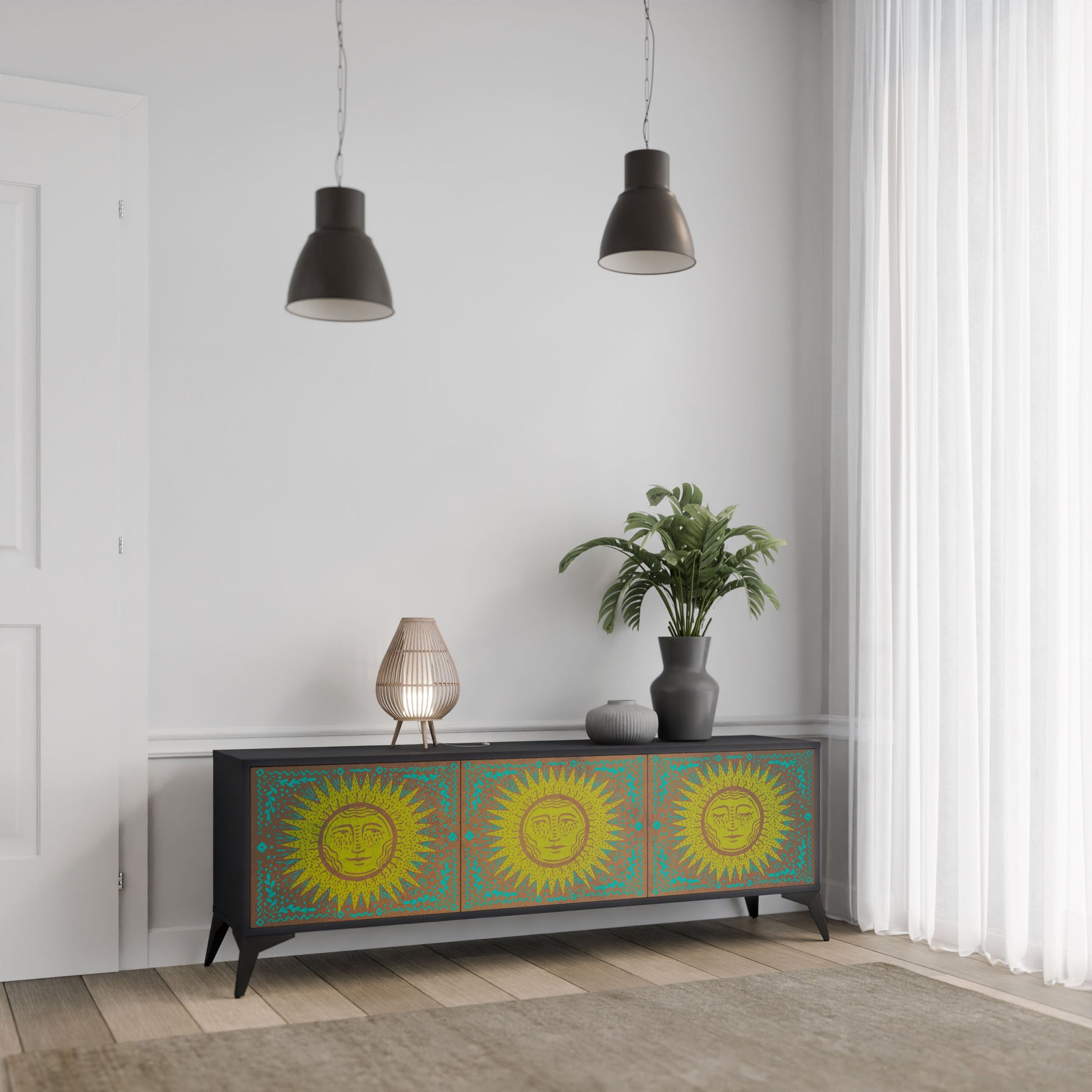 The black body of the stand creates a bold, modern accent that pairs beautifully with industrial and minimalist arrangements. The fronts with a designer print add character and uniqueness, making this piece not only practical but also a standout decorative element.