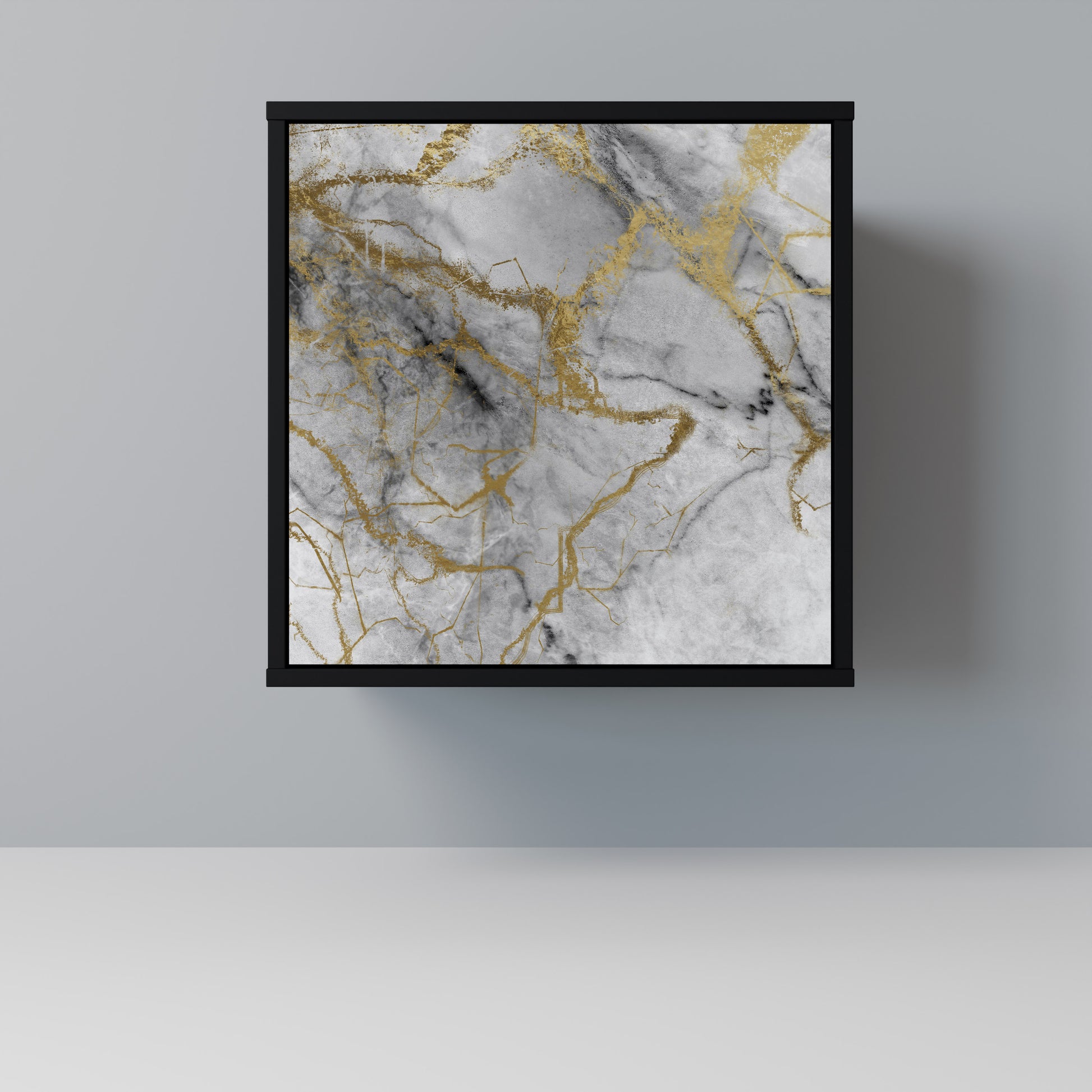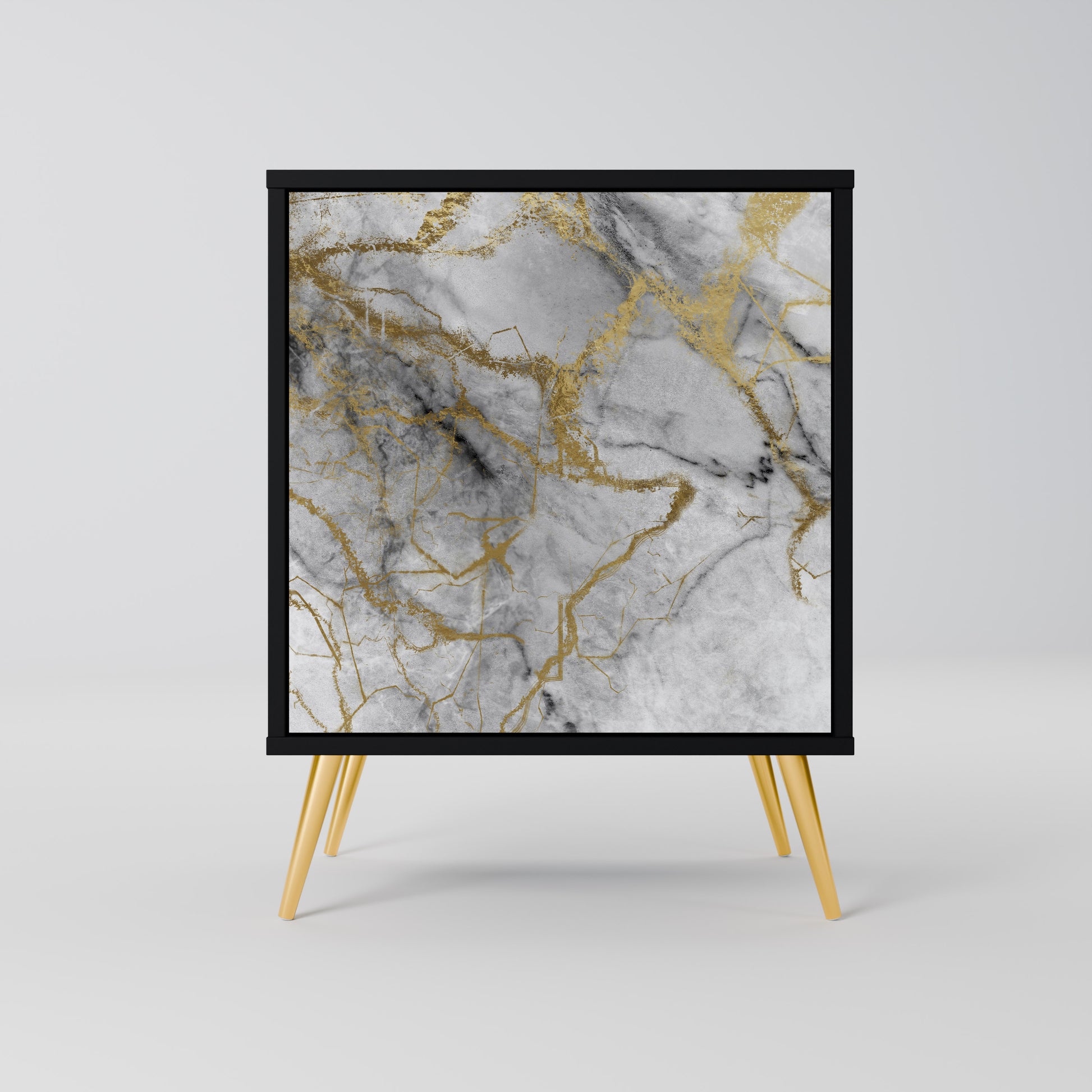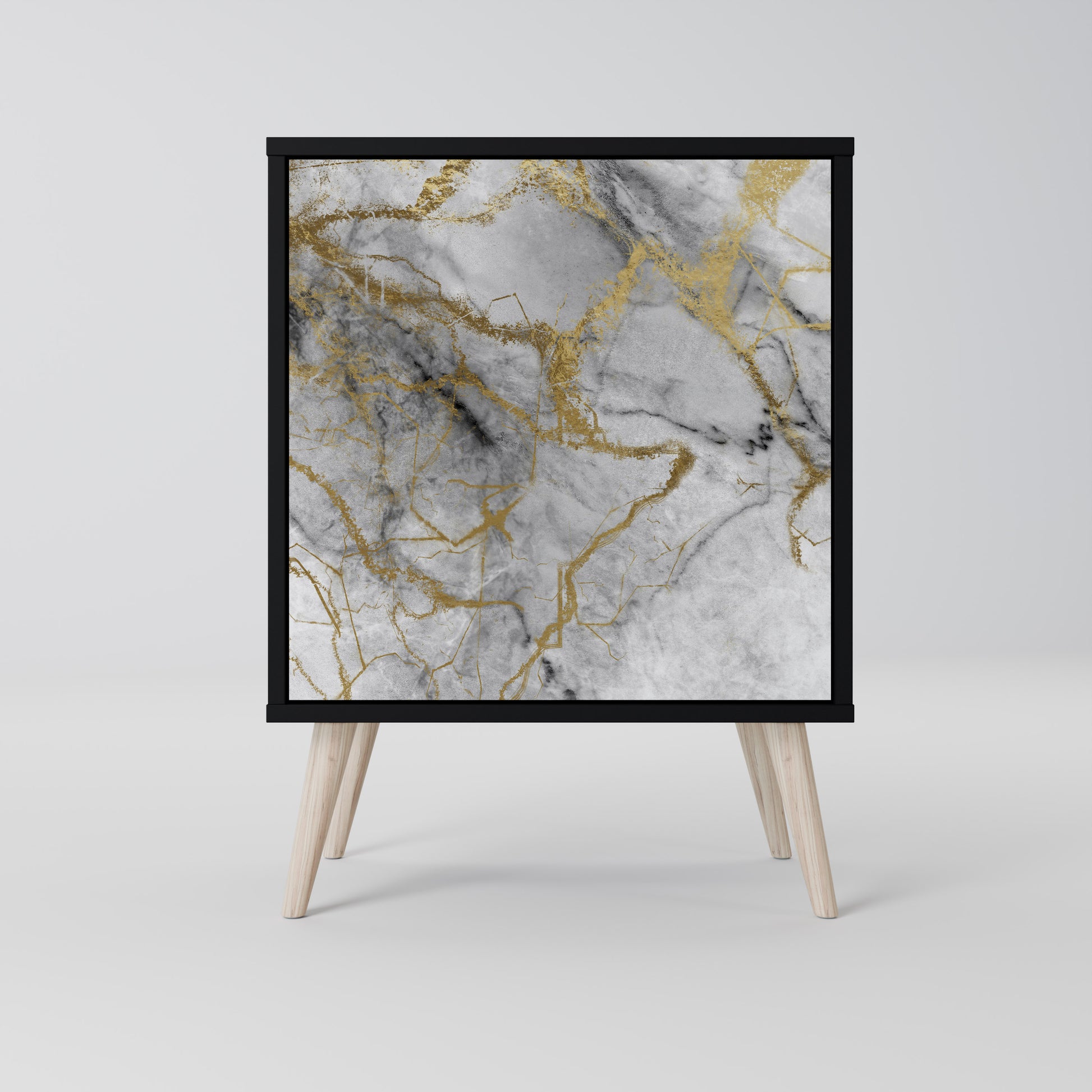 This compact yet remarkably elegant piece of furniture impresses with its minimalist design, perfectly fitting into both modern and classic interiors. The black body emphasizes the furniture’s bold character, while the fronts with a unique print add an artistic touch.