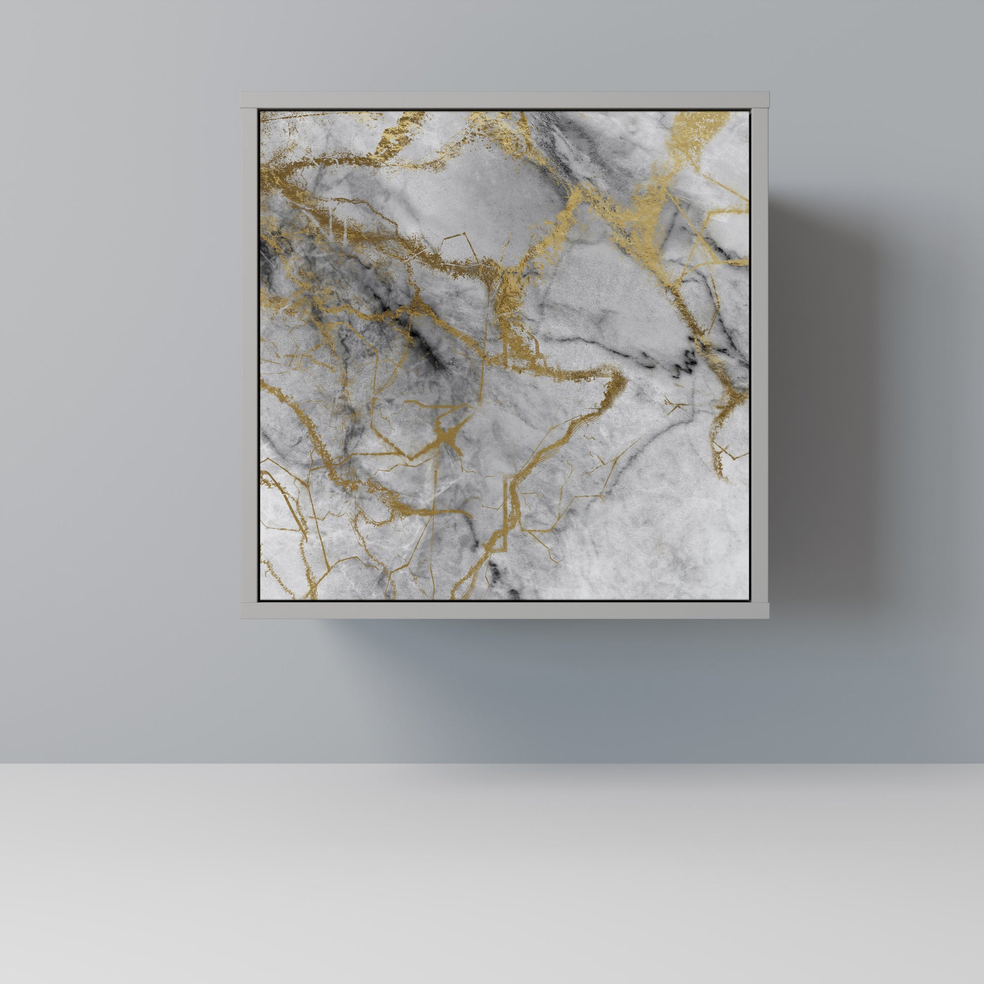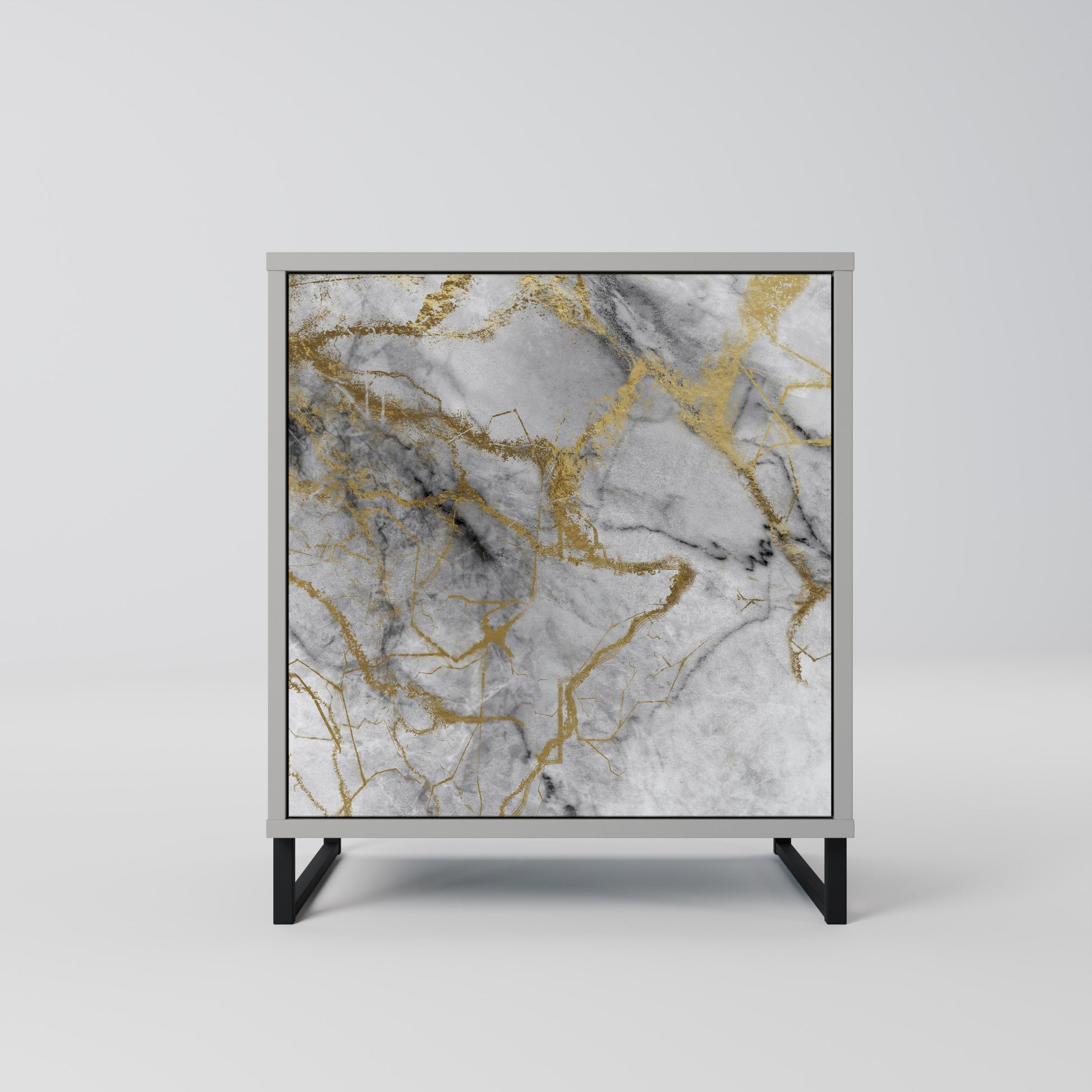 This compact yet remarkably elegant piece of furniture impresses with its minimalist design, perfectly fitting into both modern and classic interiors. The subdued grey color of the body gives the furniture a subtle yet distinctive character, while the fronts with a unique print add an artistic touch.