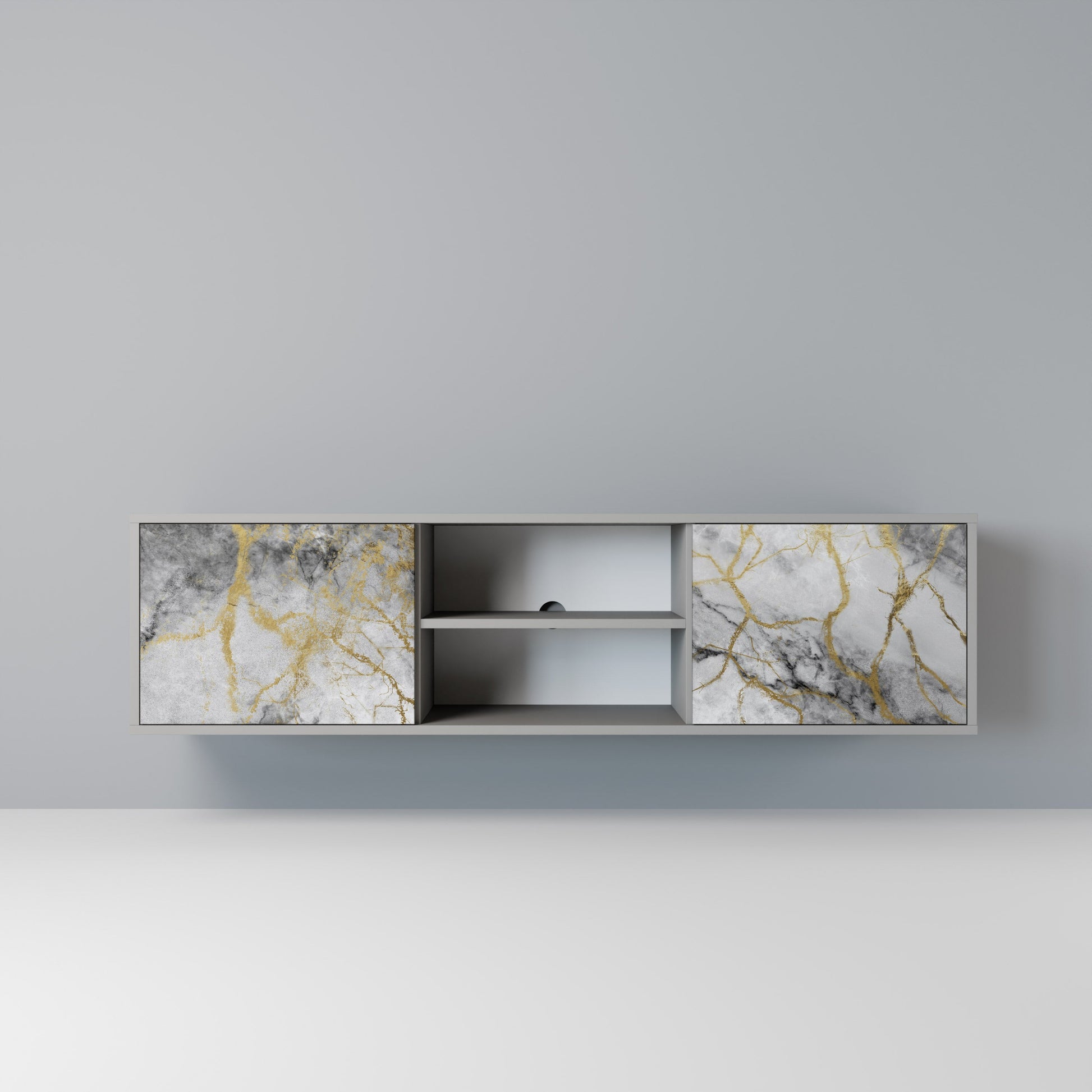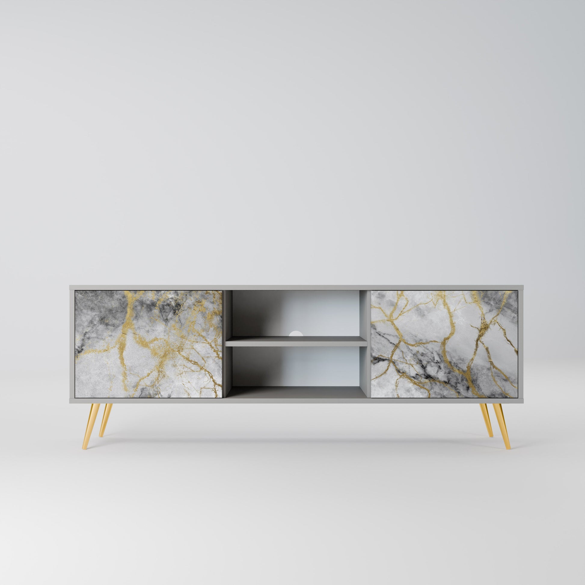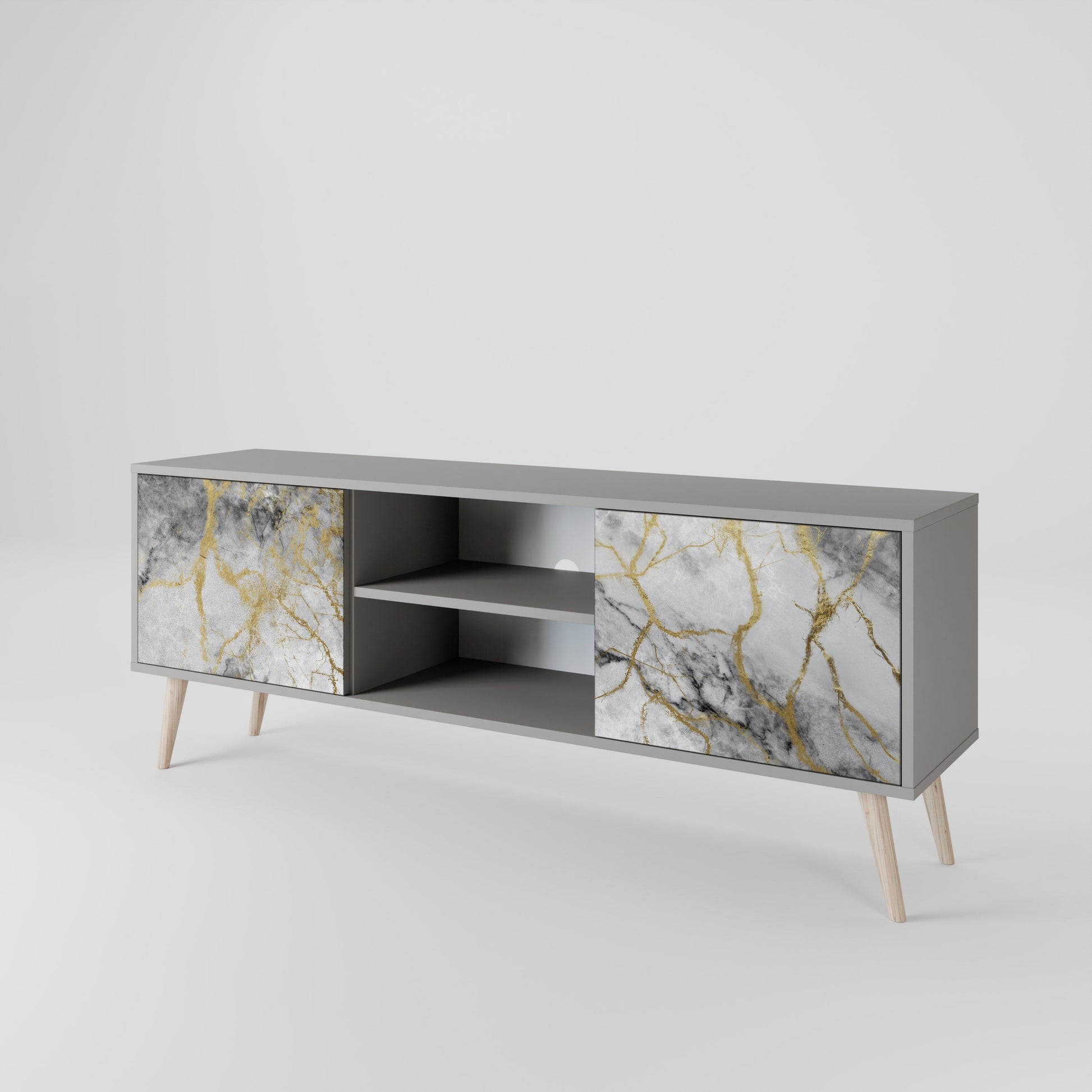 The grey body lends the TV stand a contemporary, refined look, while the fronts with an exceptional print capture attention, becoming the focal point of any room. The spacious interior provides room for electronic devices, cables, remotes, and other accessories, helping you maintain order and organization.