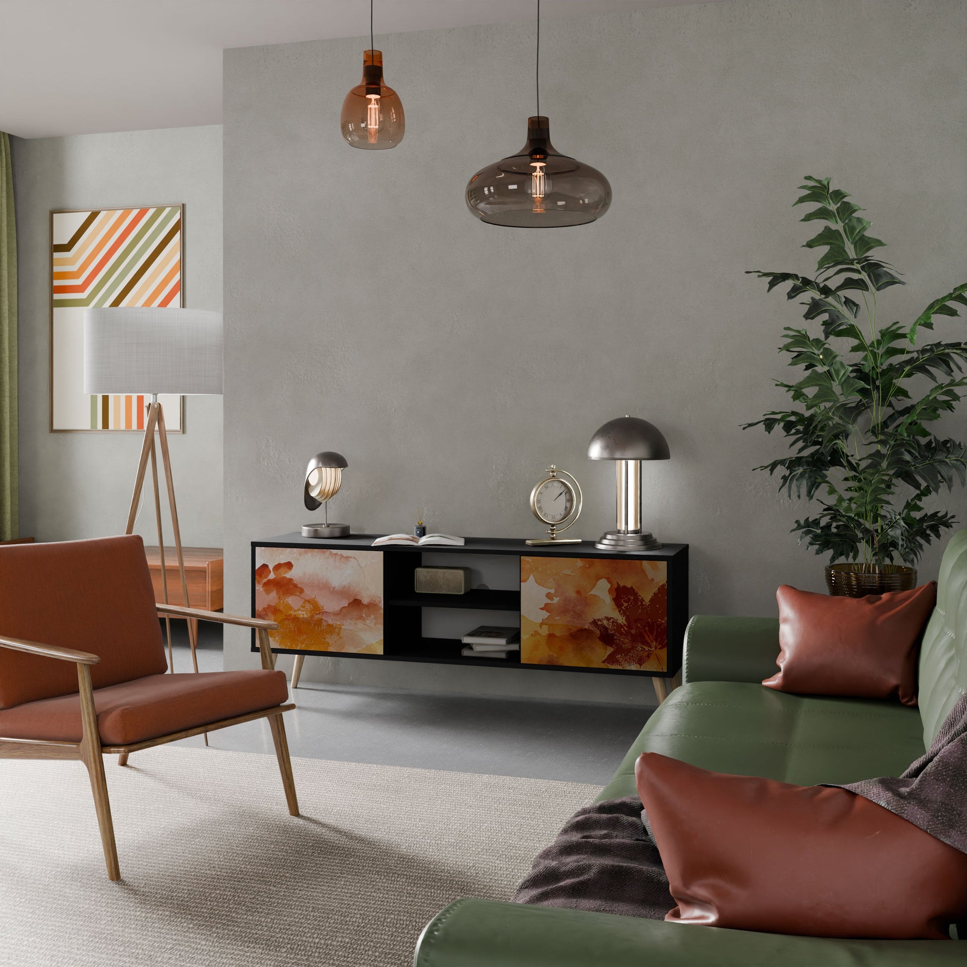 The black body gives the TV stand an elegant, modern look, while the fronts with an exceptional print draw attention, making it the focal point of any room. The spacious interior provides room for electronic devices, cables, remotes, and other accessories, helping you maintain order and organization.