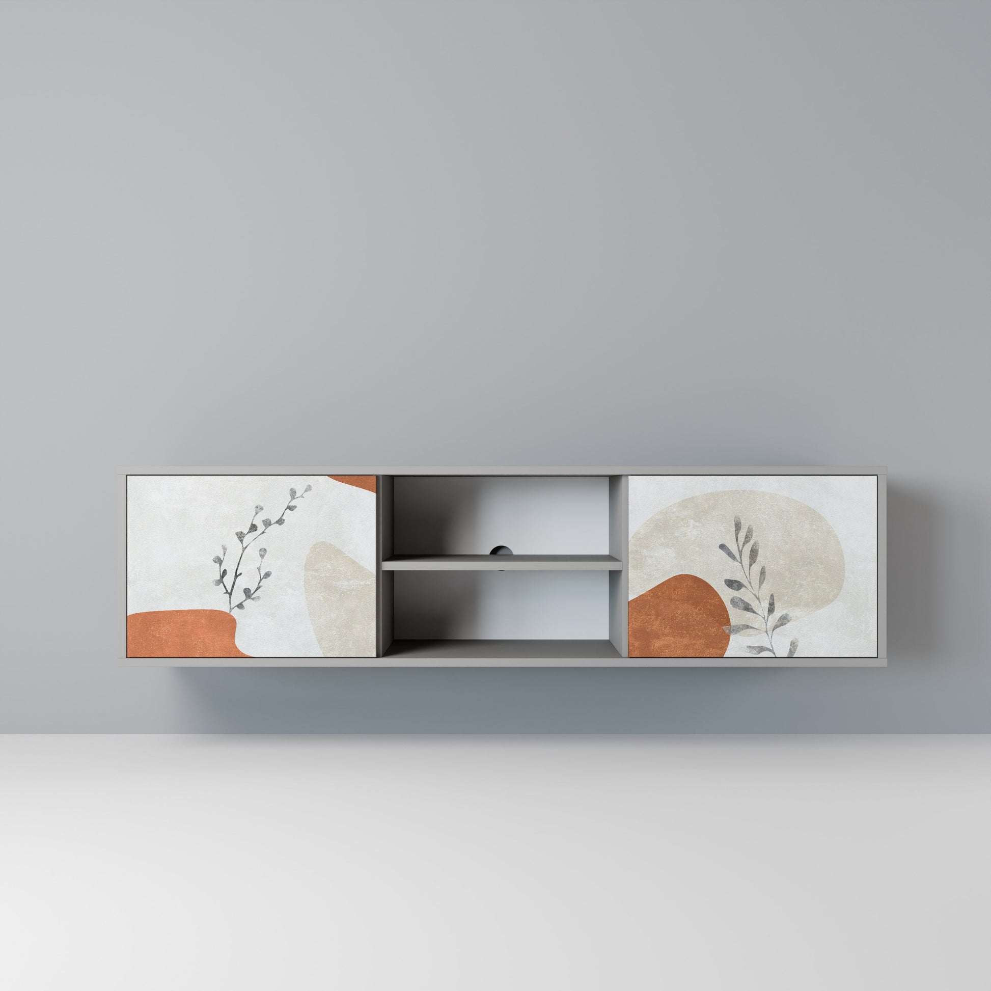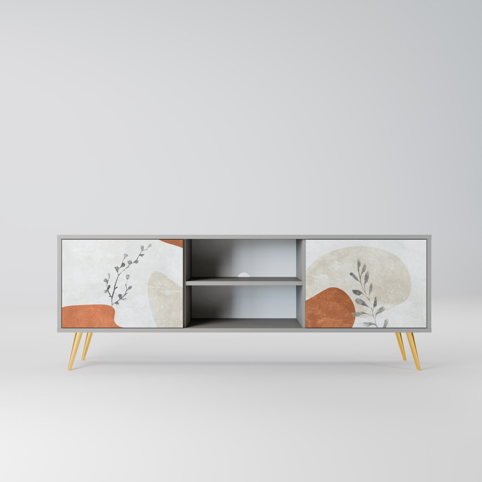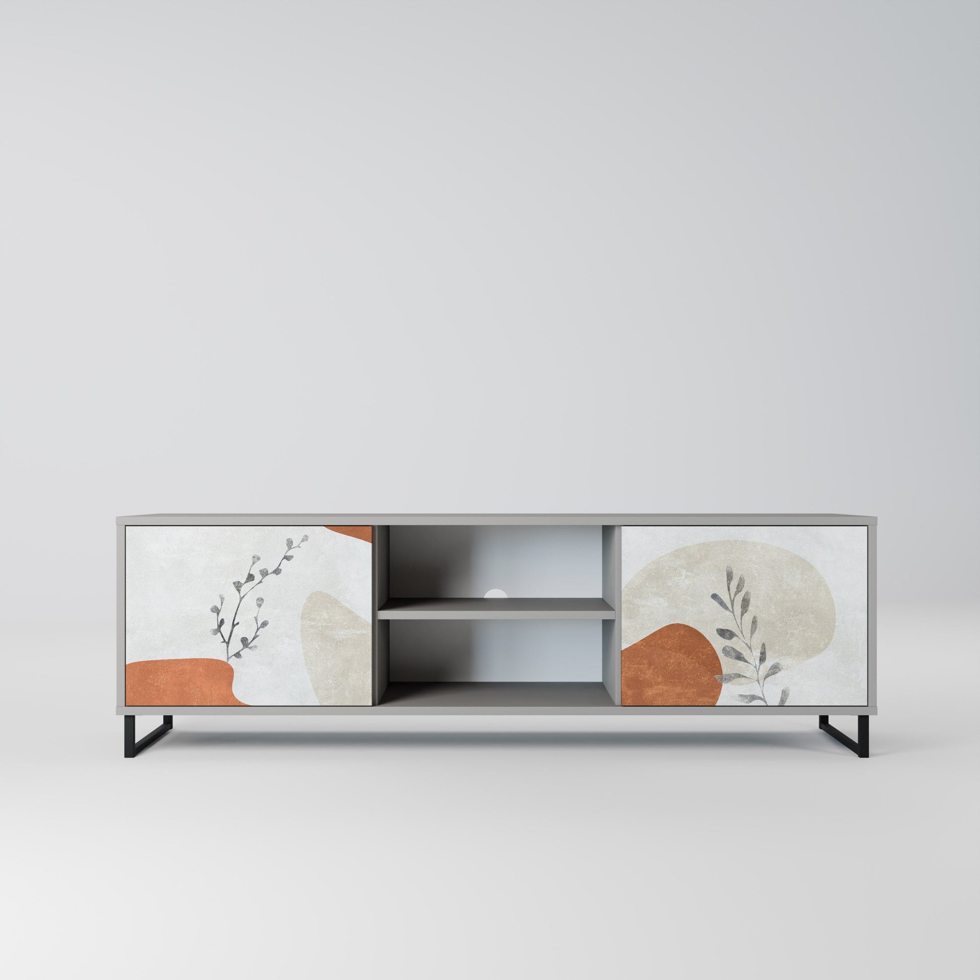 The grey body lends the TV stand a contemporary, refined look, while the fronts with an exceptional print capture attention, becoming the focal point of any room. The spacious interior provides room for electronic devices, cables, remotes, and other accessories, helping you maintain order and organization.