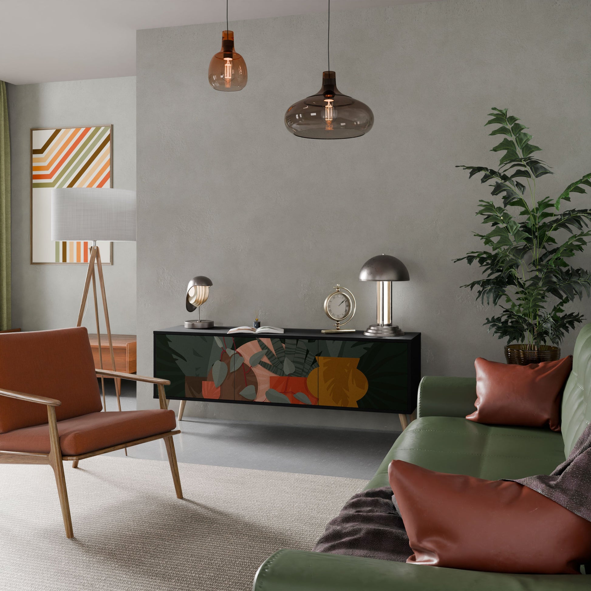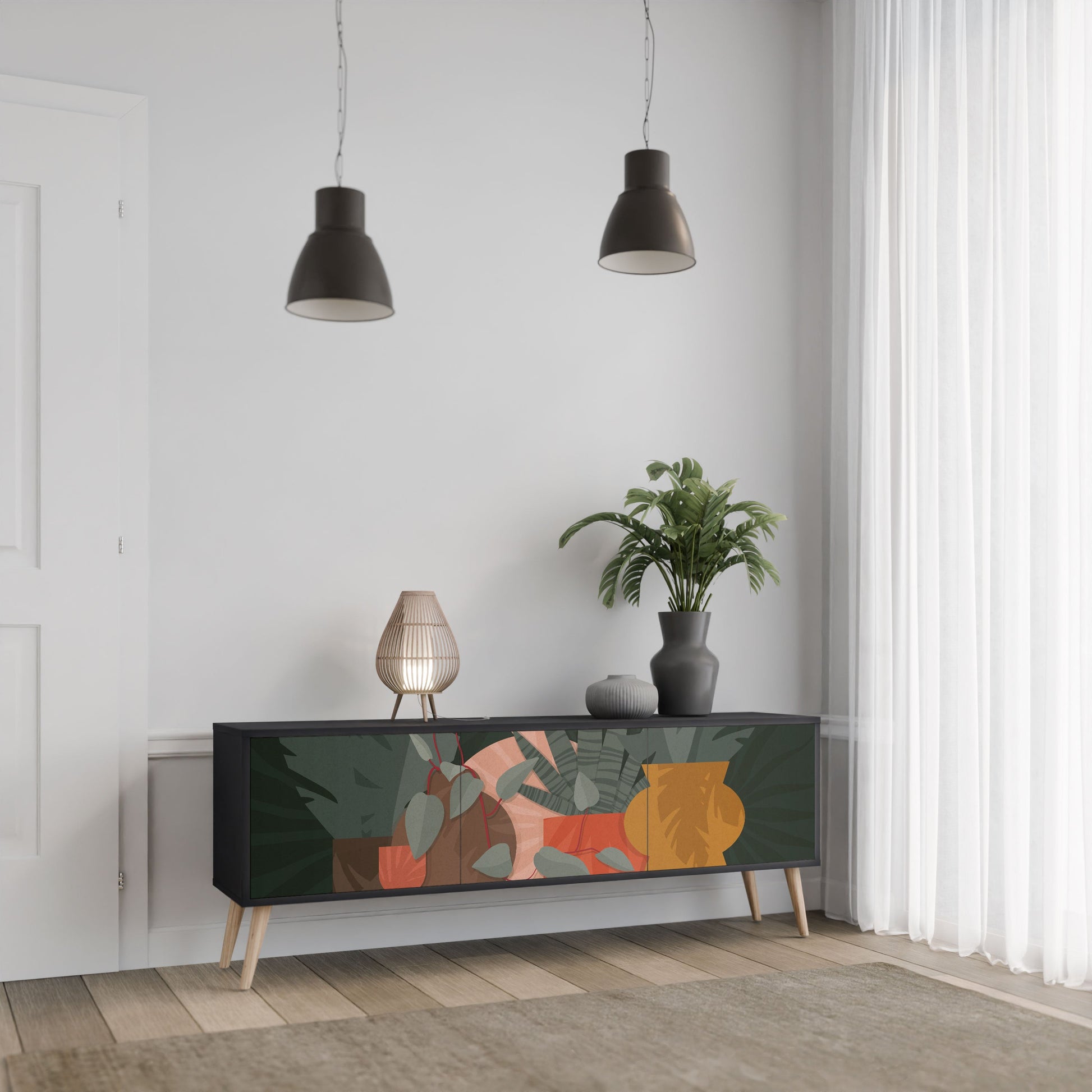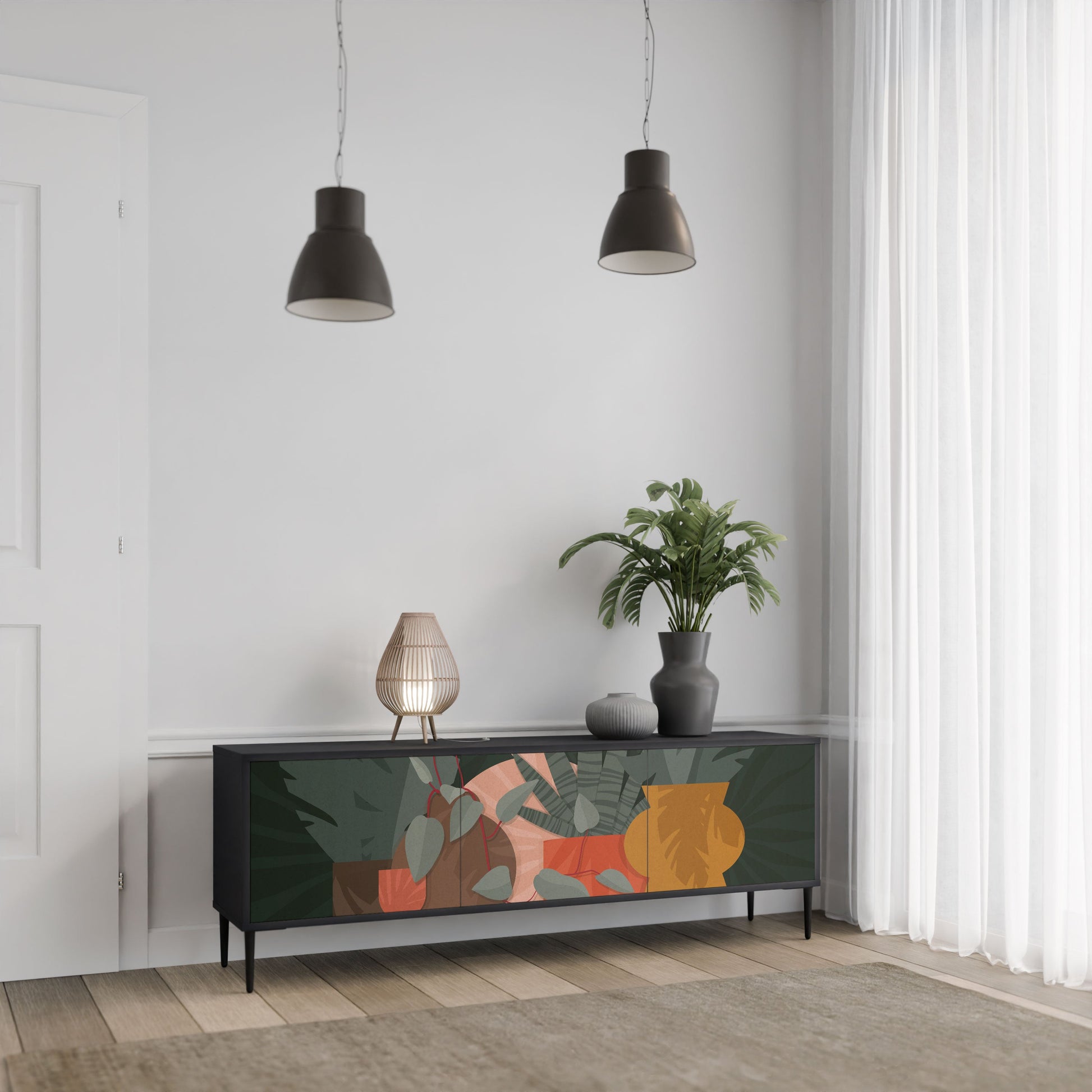 The black body of the stand creates a bold, modern accent that pairs beautifully with industrial and minimalist arrangements. The fronts with a designer print add character and uniqueness, making this piece not only practical but also a standout decorative element.