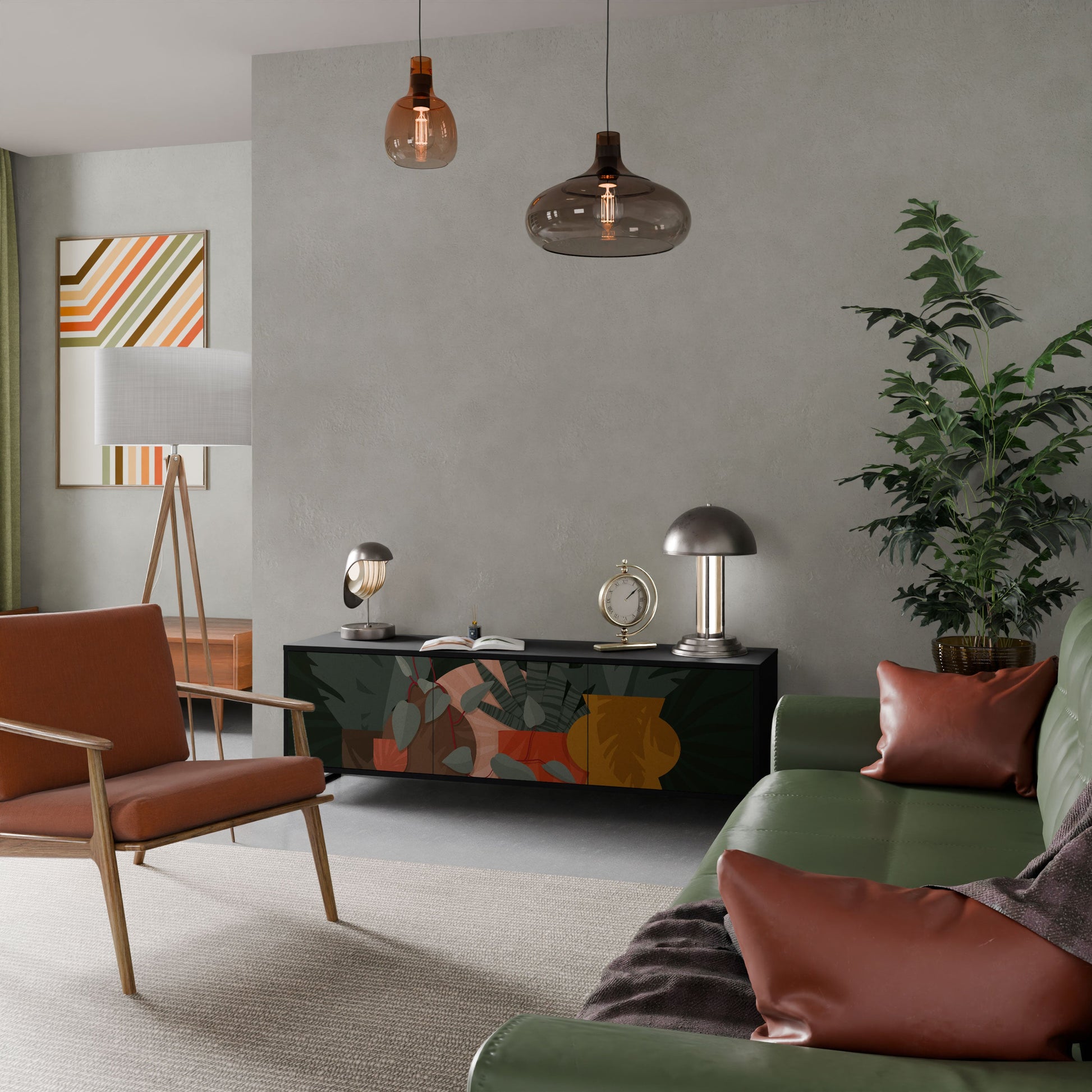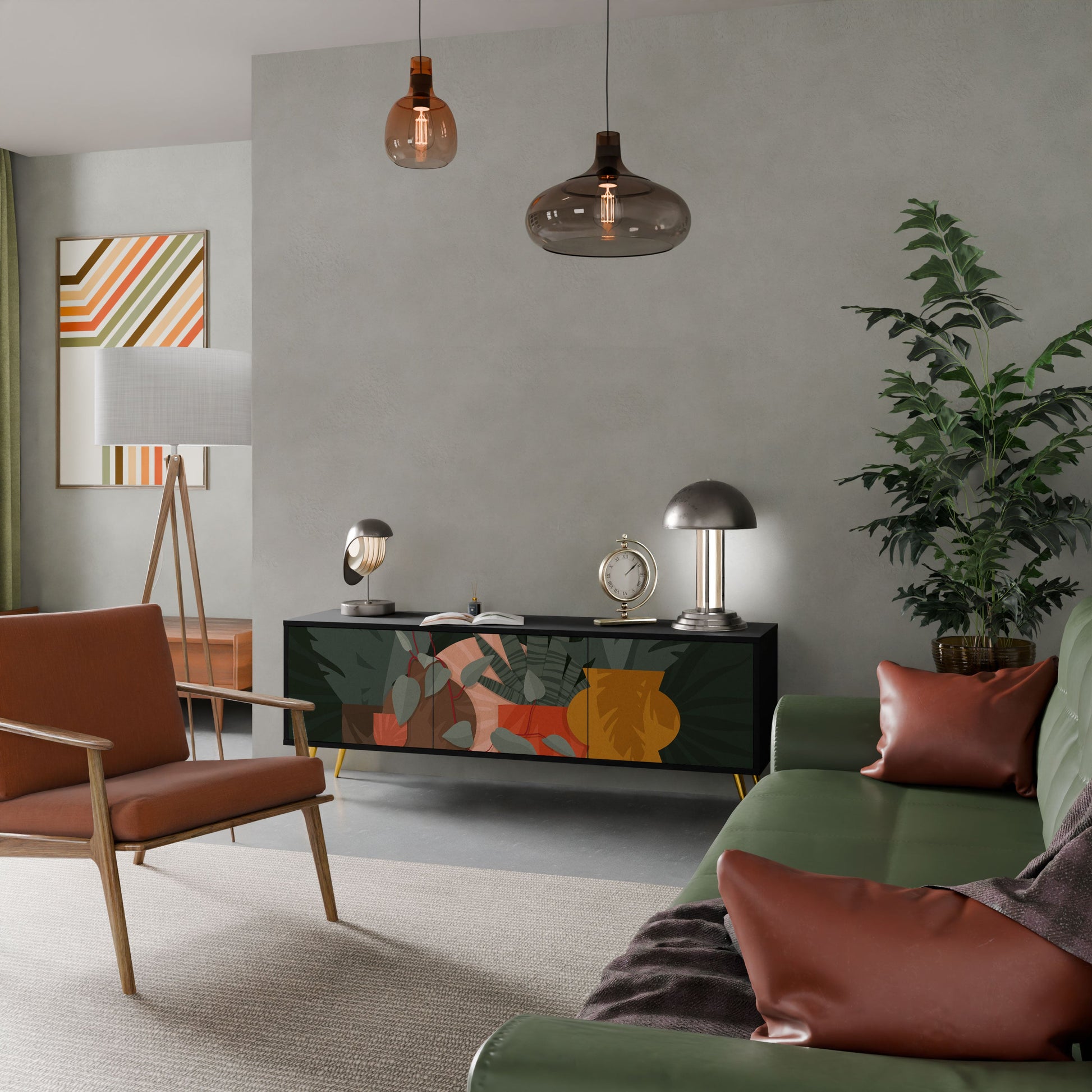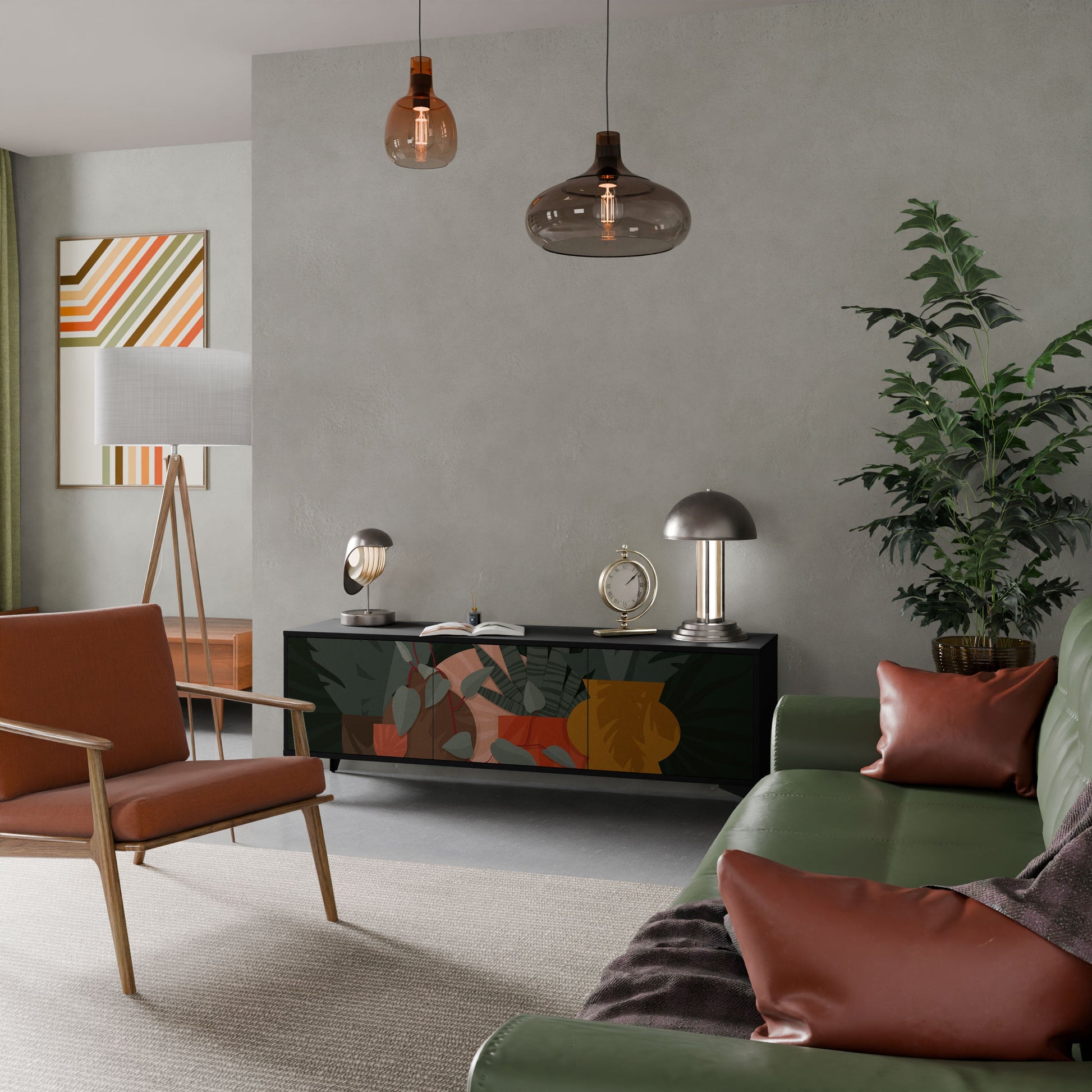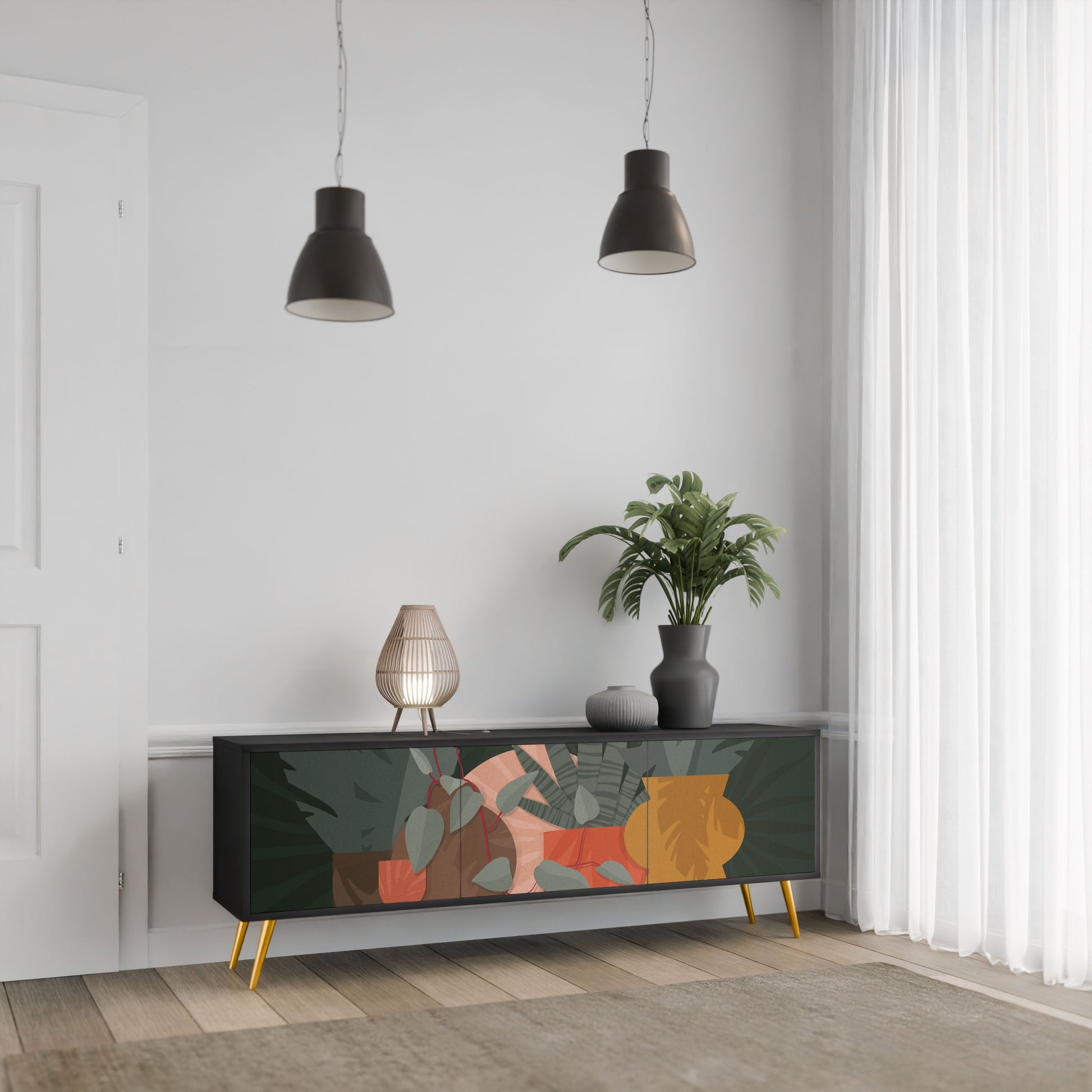 The black body of the stand creates a bold, modern accent that pairs beautifully with industrial and minimalist arrangements. The fronts with a designer print add character and uniqueness, making this piece not only practical but also a standout decorative element.