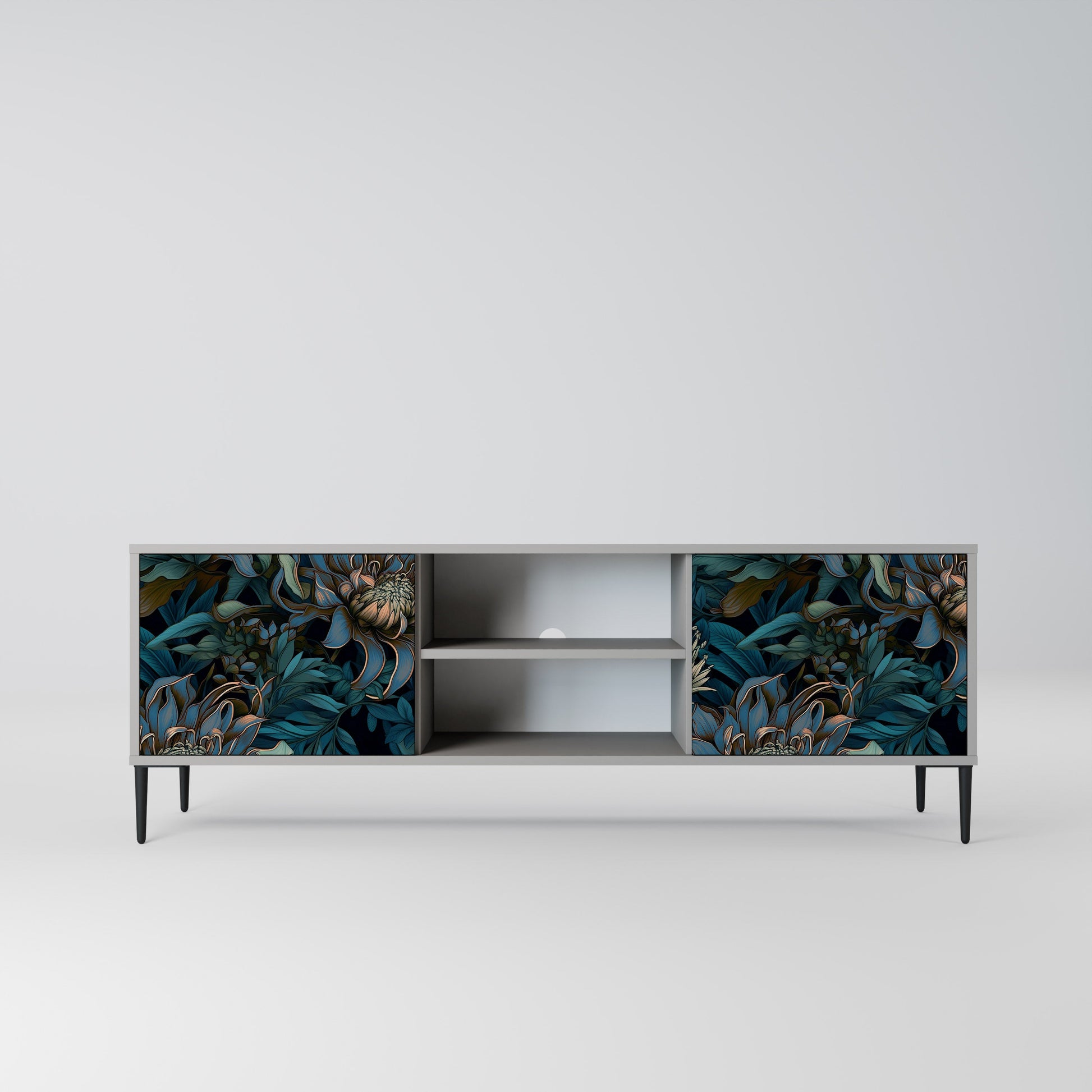 The grey body lends the TV stand a contemporary, refined look, while the fronts with an exceptional print capture attention, becoming the focal point of any room. The spacious interior provides room for electronic devices, cables, remotes, and other accessories, helping you maintain order and organization.