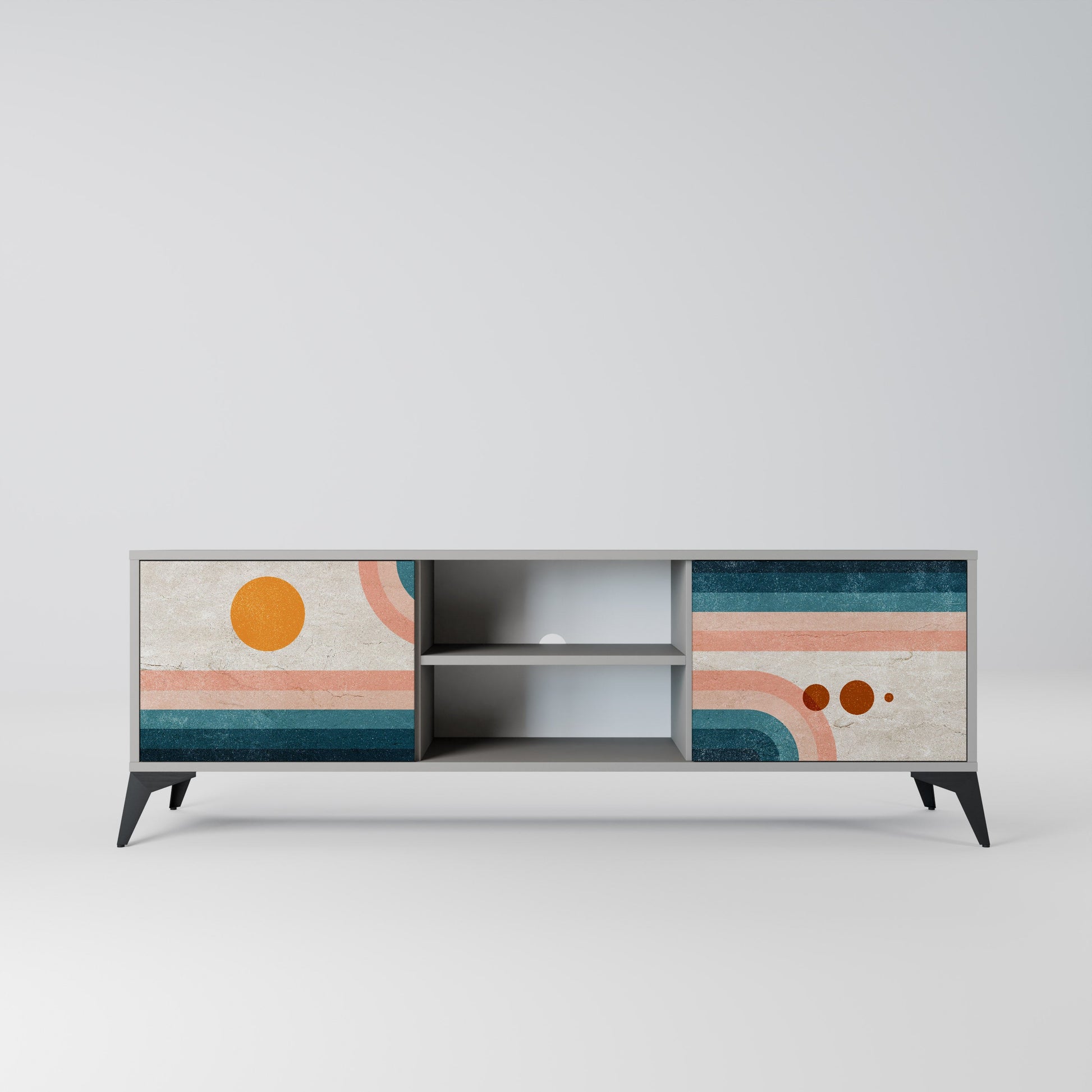 The grey body lends the TV stand a contemporary, refined look, while the fronts with an exceptional print capture attention, becoming the focal point of any room. The spacious interior provides room for electronic devices, cables, remotes, and other accessories, helping you maintain order and organization.