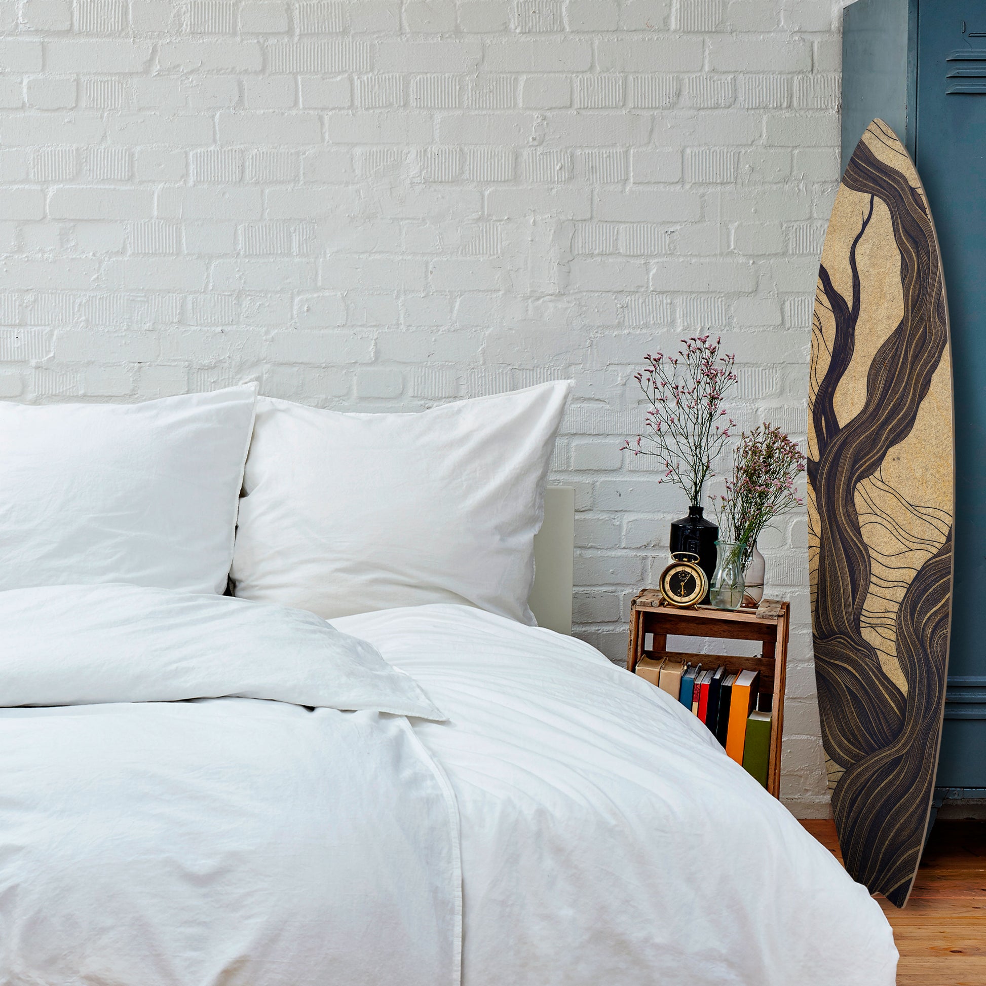 The surfboard has been designed with maximum functionality and arrangement flexibility in mind. It can be hung vertically or horizontally, or displayed freestanding by leaning it against a wall, dresser, or shelf. This makes it easy to adapt the piece to the character of the space and changing interior needs.