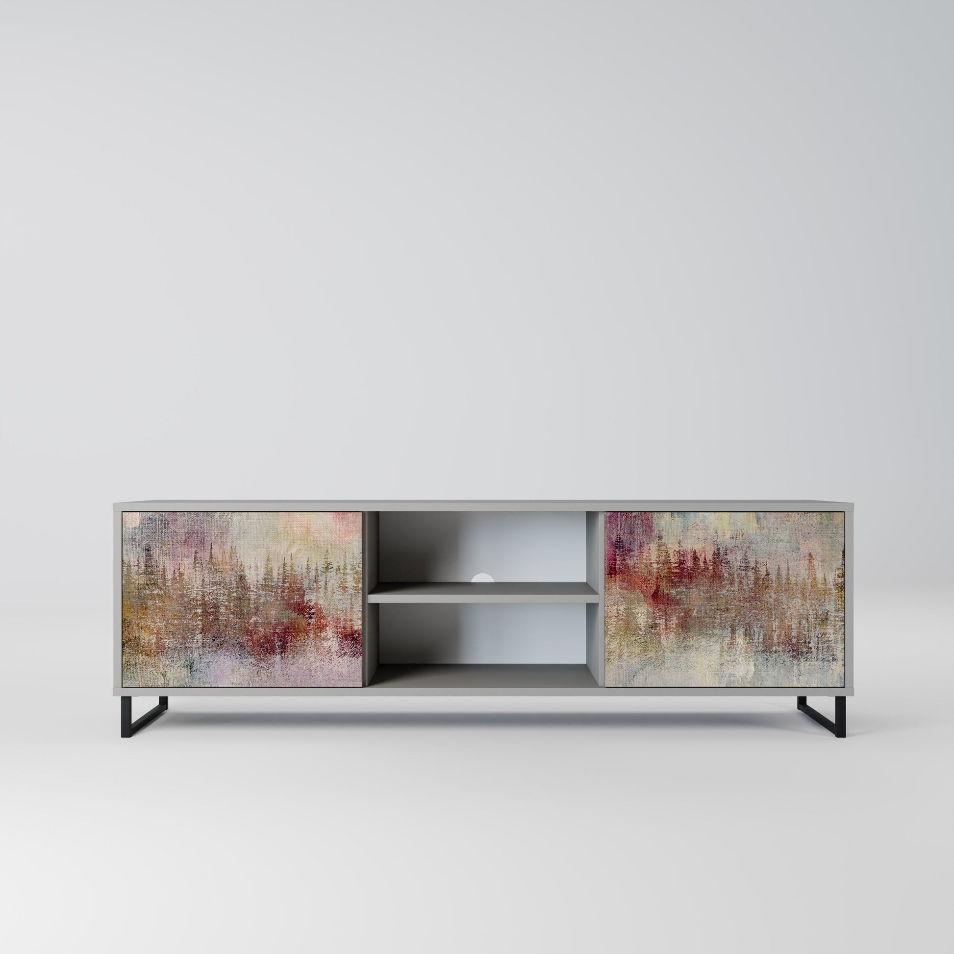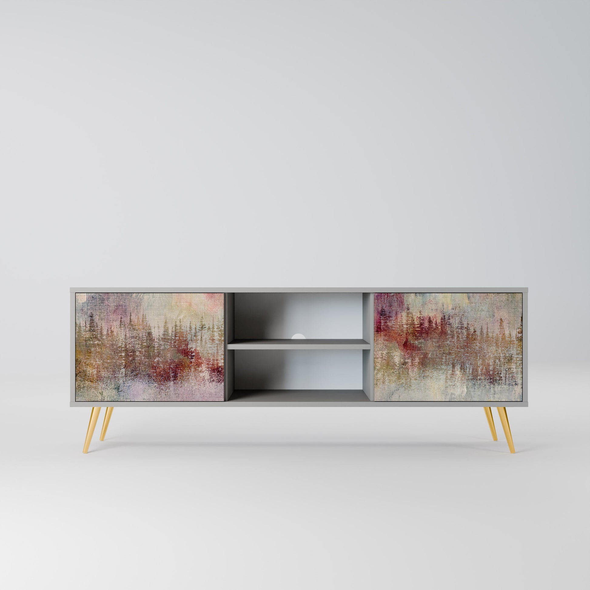The grey body lends the TV stand a contemporary, refined look, while the fronts with an exceptional print capture attention, becoming the focal point of any room. The spacious interior provides room for electronic devices, cables, remotes, and other accessories, helping you maintain order and organization.