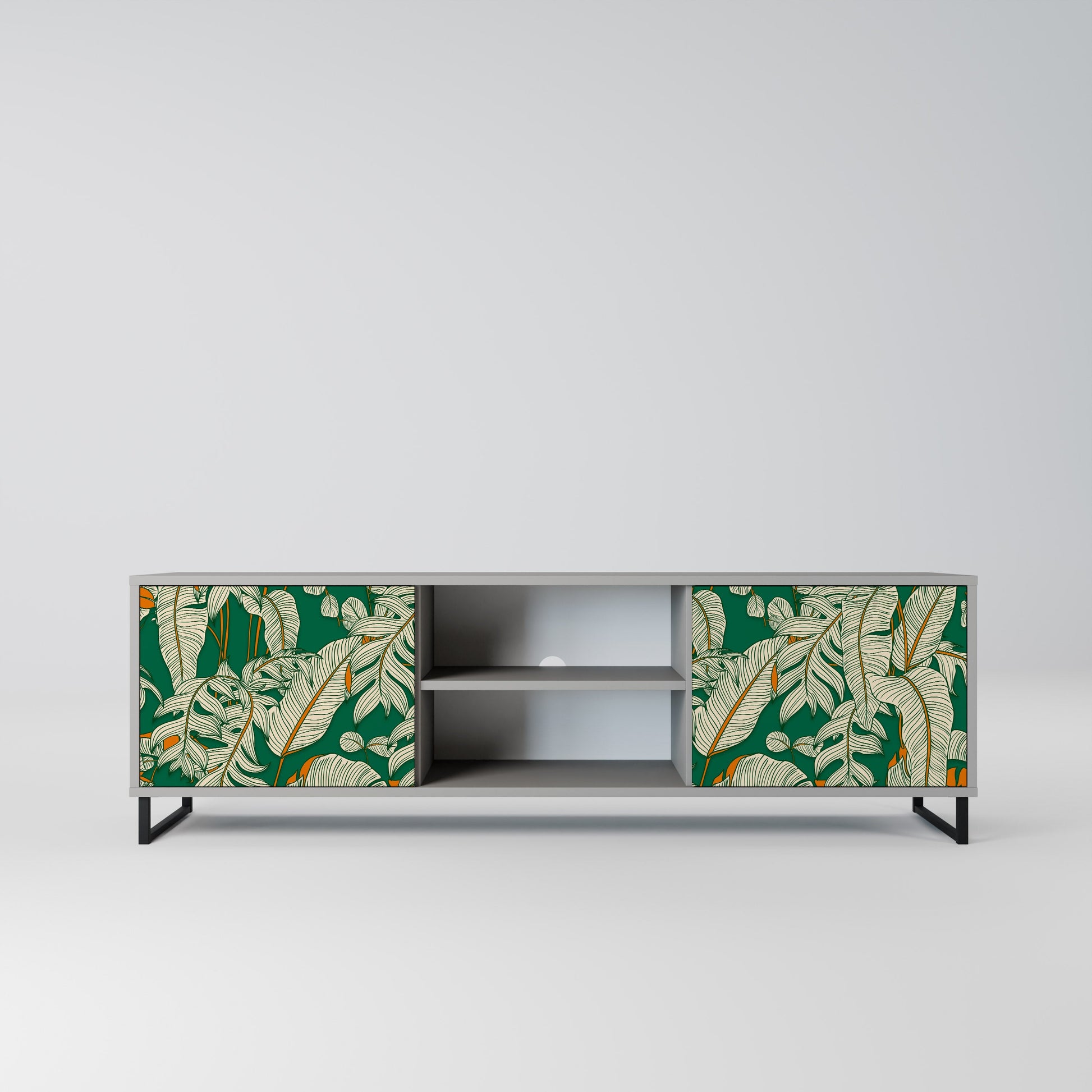 The grey body lends the TV stand a contemporary, refined look, while the fronts with an exceptional print capture attention, becoming the focal point of any room. The spacious interior provides room for electronic devices, cables, remotes, and other accessories, helping you maintain order and organization.