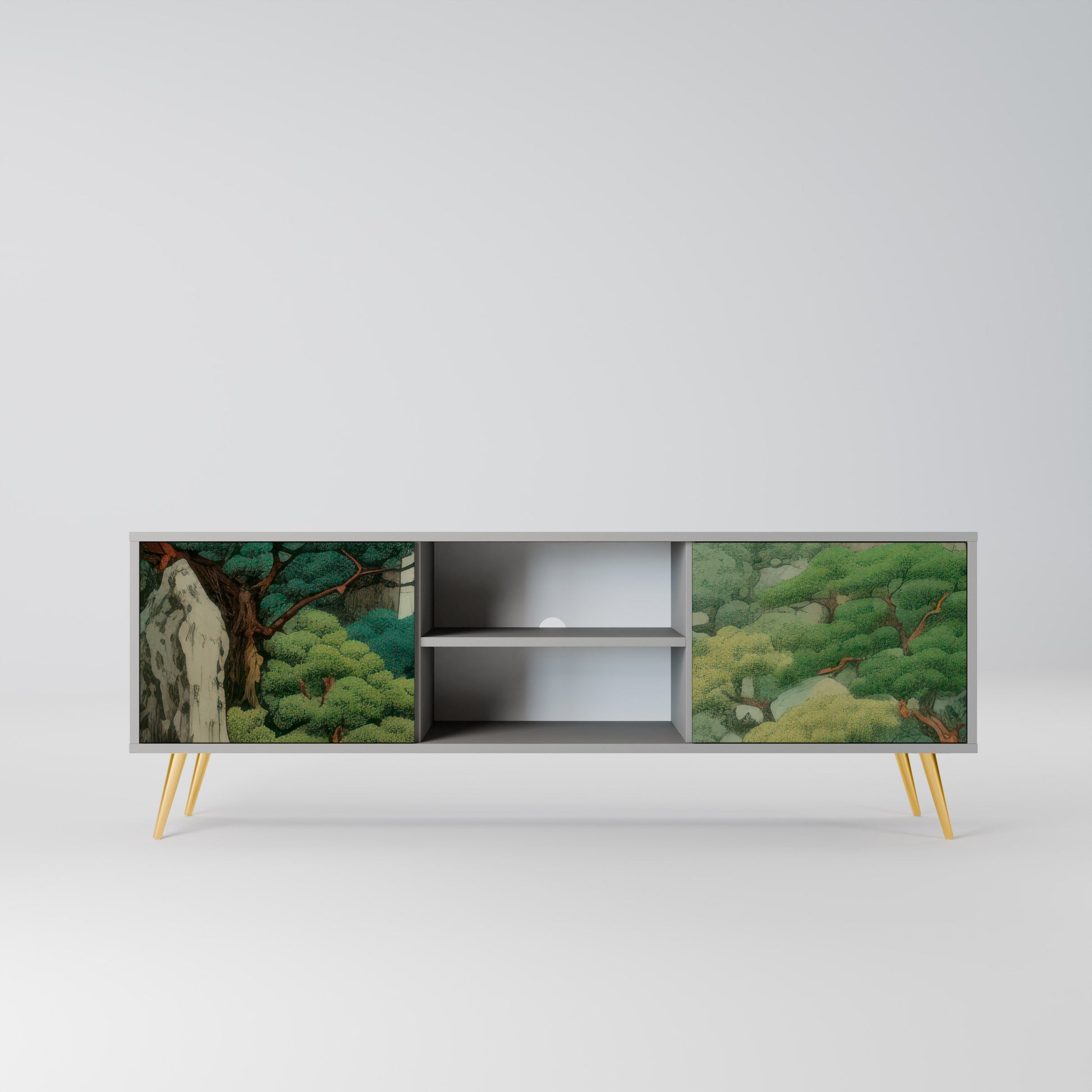 The grey body lends the TV stand a contemporary, refined look, while the fronts with an exceptional print capture attention, becoming the focal point of any room. The spacious interior provides room for electronic devices, cables, remotes, and other accessories, helping you maintain order and organization.