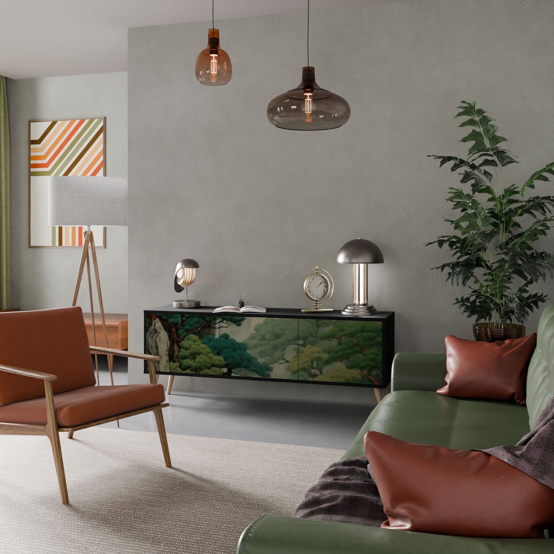 The black body of the stand creates a bold, modern accent that pairs beautifully with industrial and minimalist arrangements. The fronts with a designer print add character and uniqueness, making this piece not only practical but also a standout decorative element.