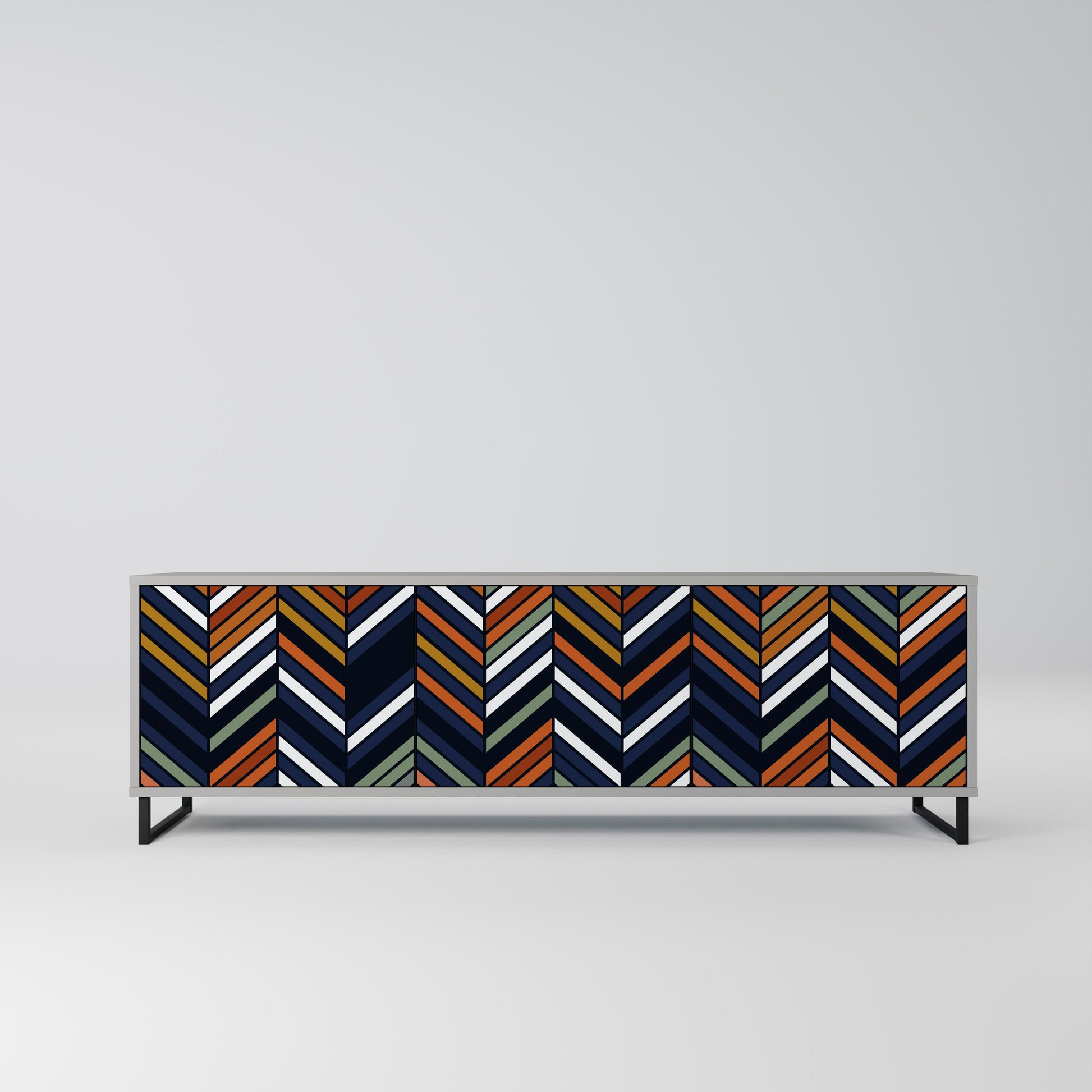 A unique design that blends modern geometry with a refined sci-fi aesthetic. The front of the furniture is dressed in a black-and-white mosaic of triangles, lines, and irregular shapes that merge into a hypnotic, rhythmic composition. A pattern that conveys depth and movement – like a pulsating code from the future.
