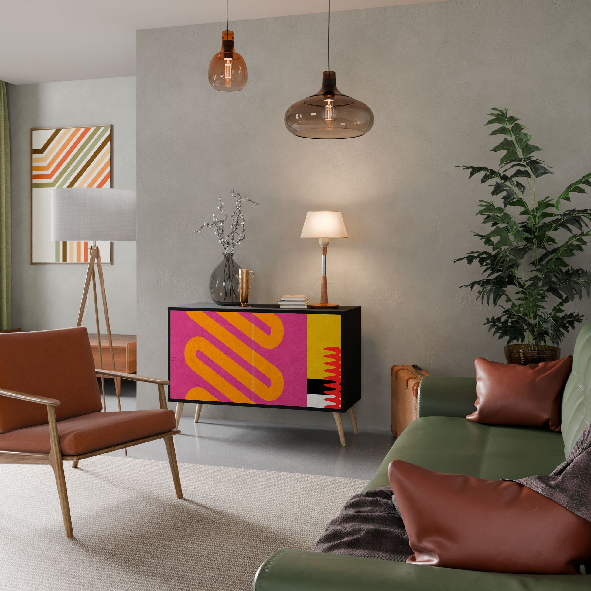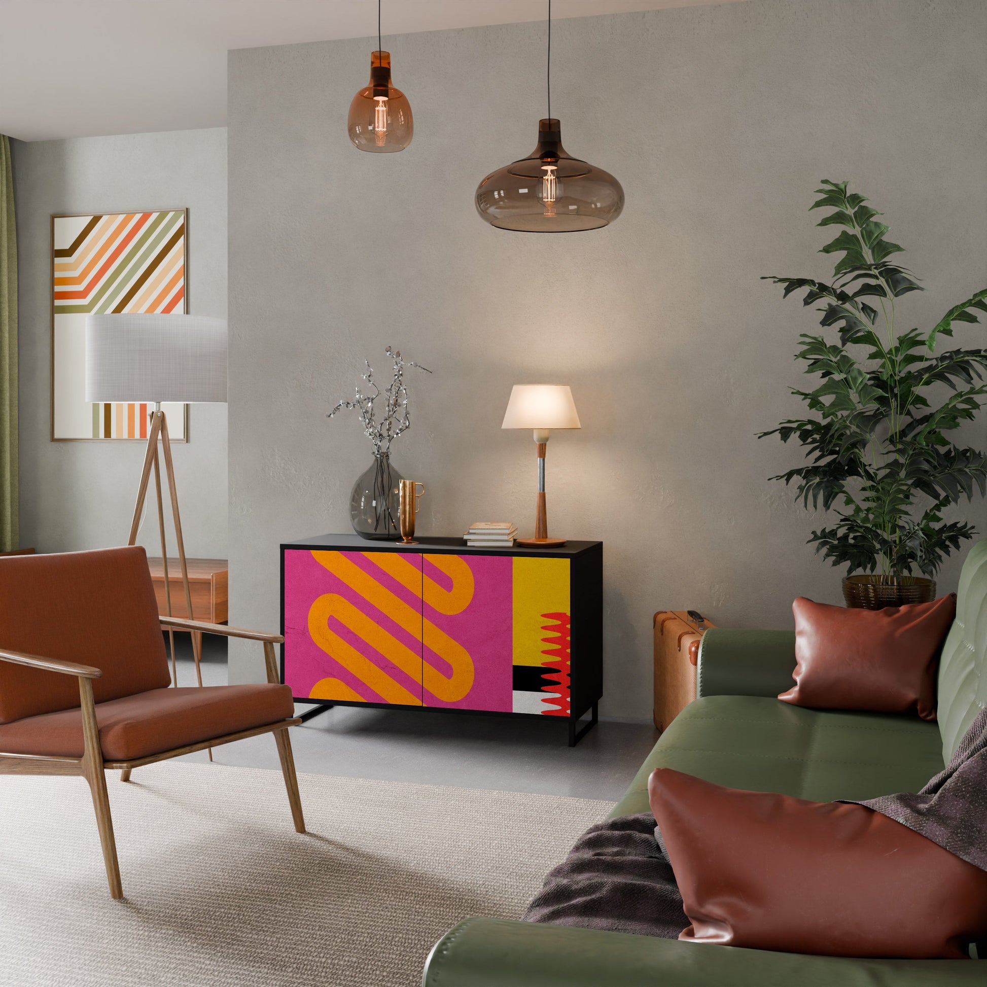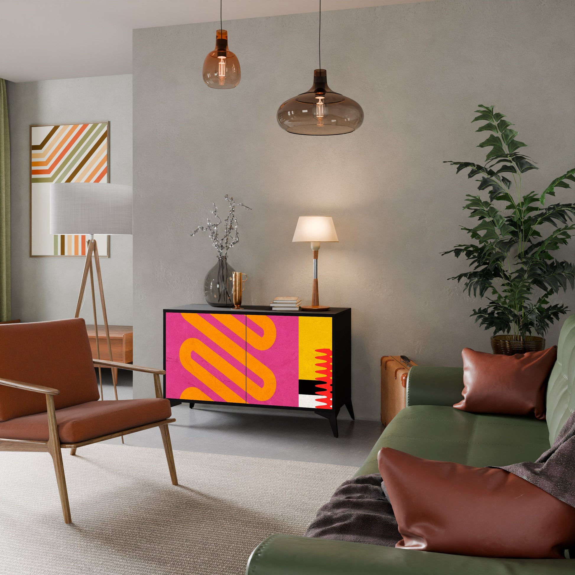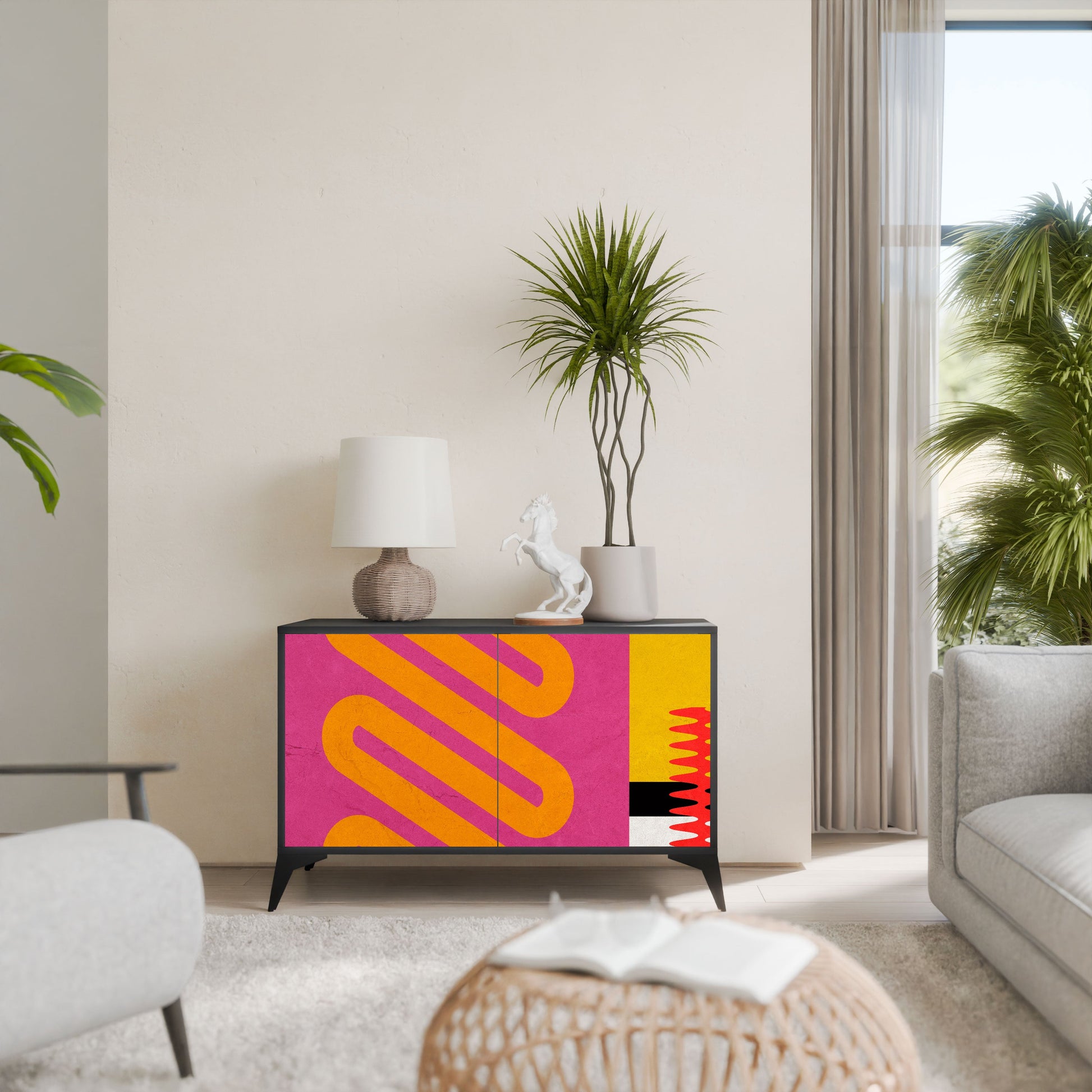 Elegance and functionality in a single piece of furniture – our 2-Door Sideboard with a black body is the perfect solution for lovers of stylish, modern interiors. The black body emphasizes the bold character of the furniture, while the fronts with a unique print add an artistic touch. It fits perfectly in the living room, bedroom, or office, complementing both modern and industrial arrangements.