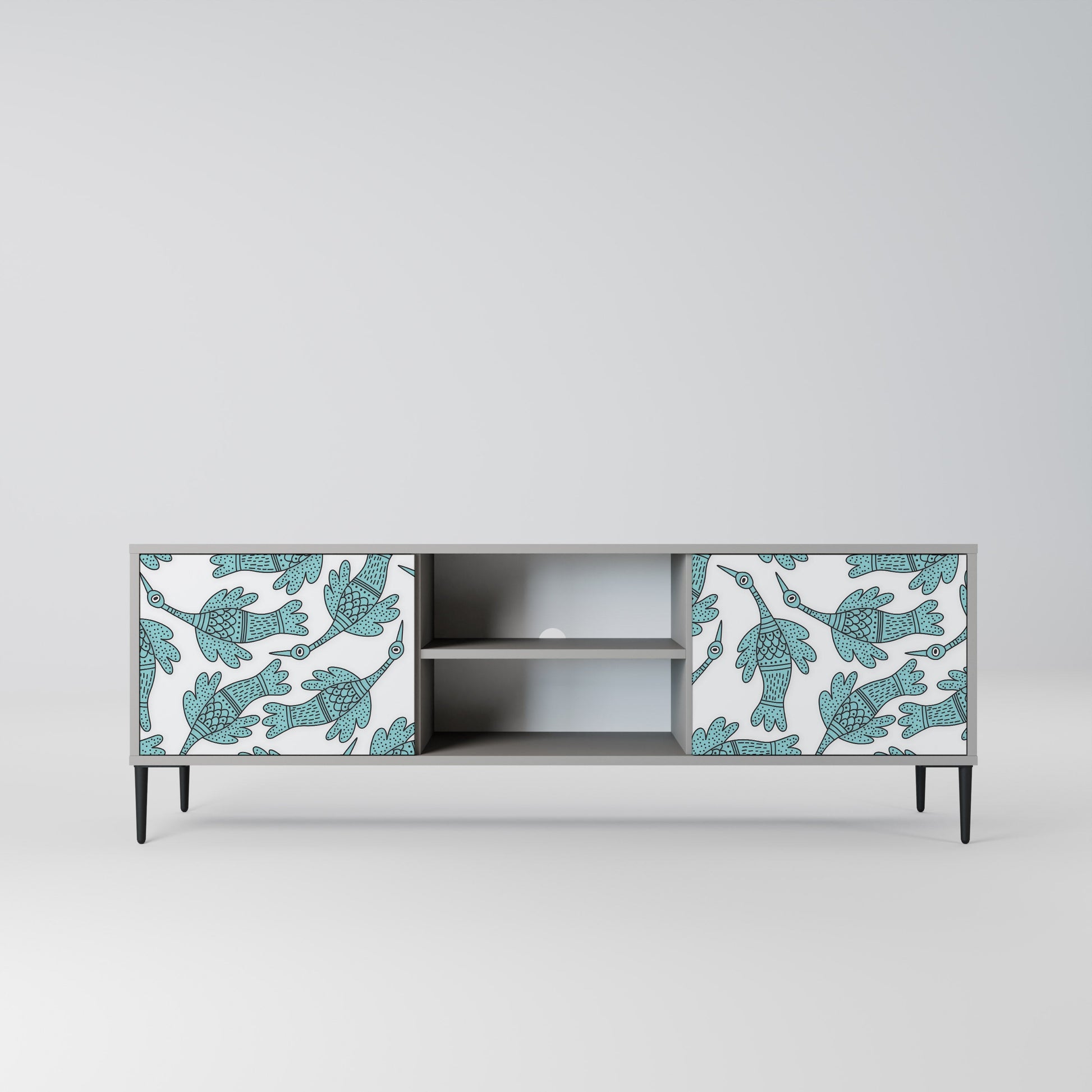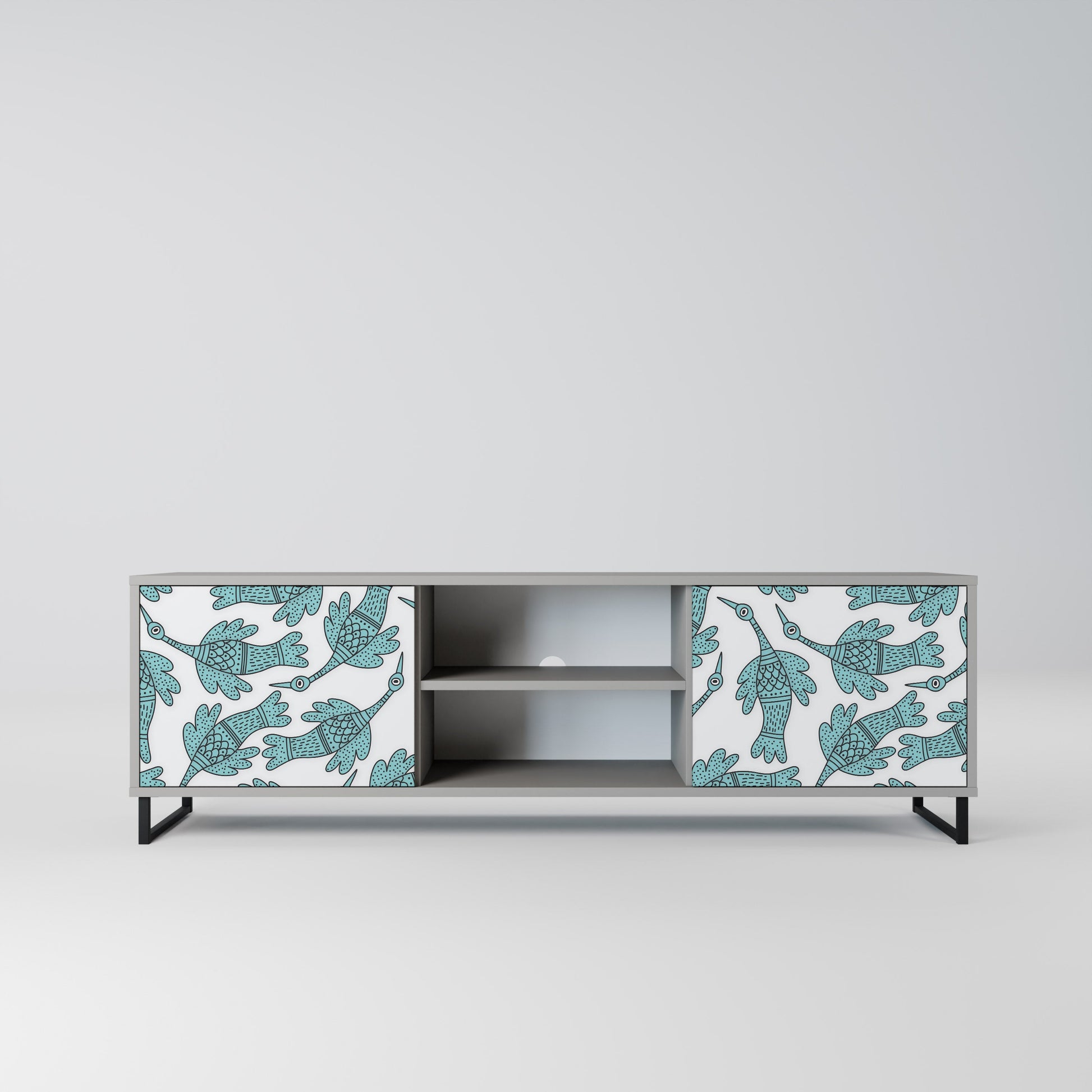 The grey body lends the TV stand a contemporary, refined look, while the fronts with an exceptional print capture attention, becoming the focal point of any room. The spacious interior provides room for electronic devices, cables, remotes, and other accessories, helping you maintain order and organization.