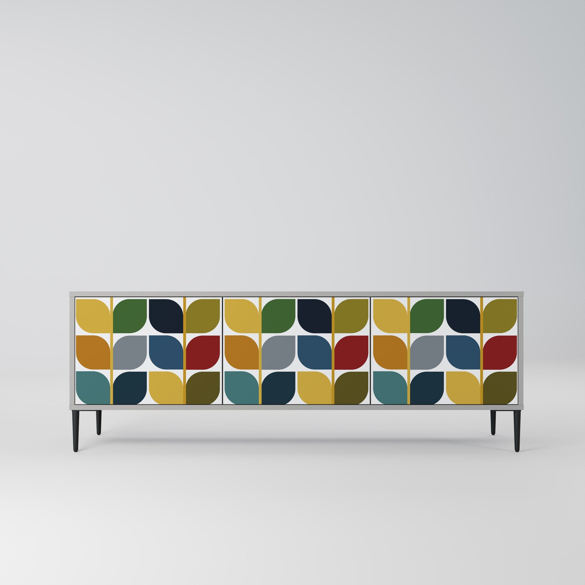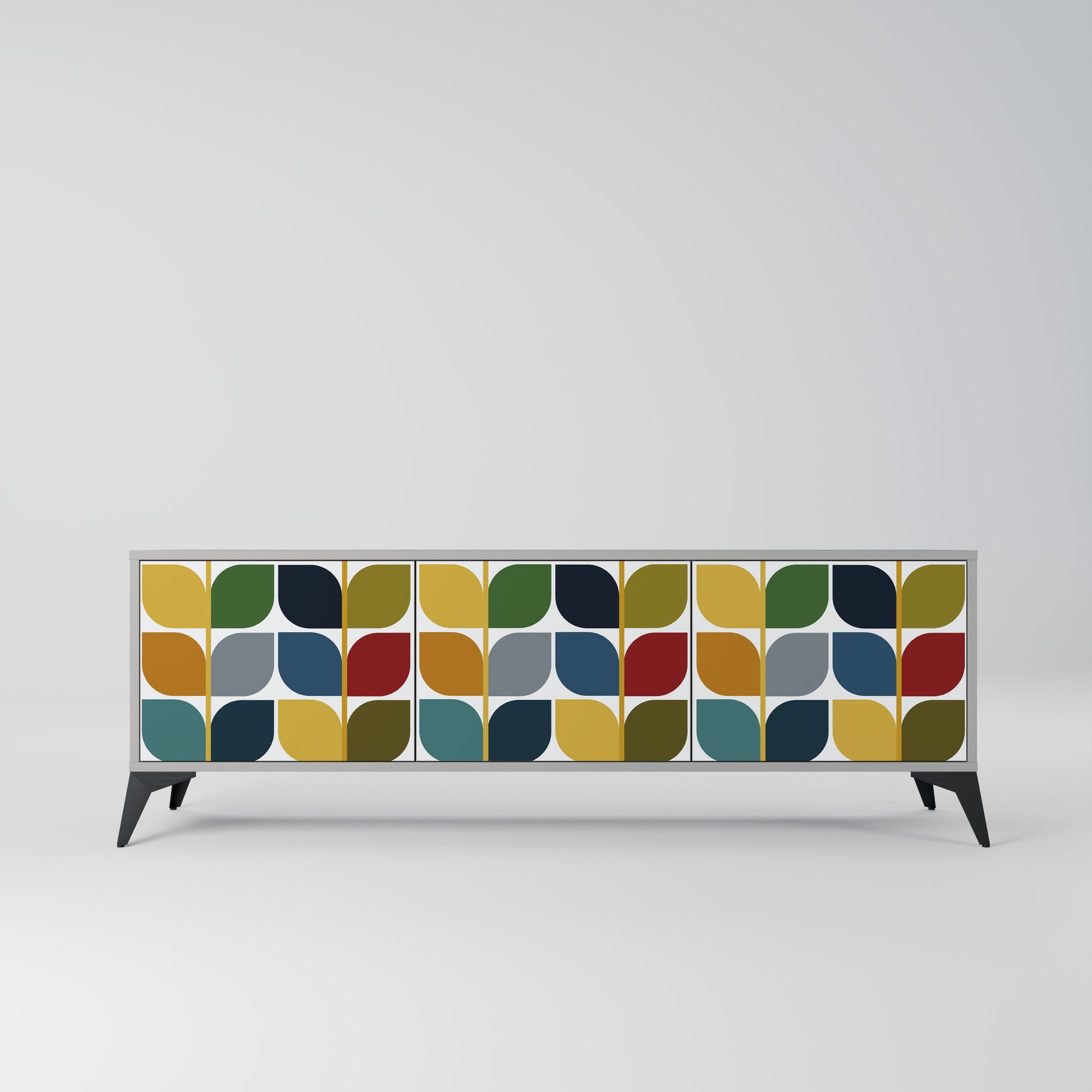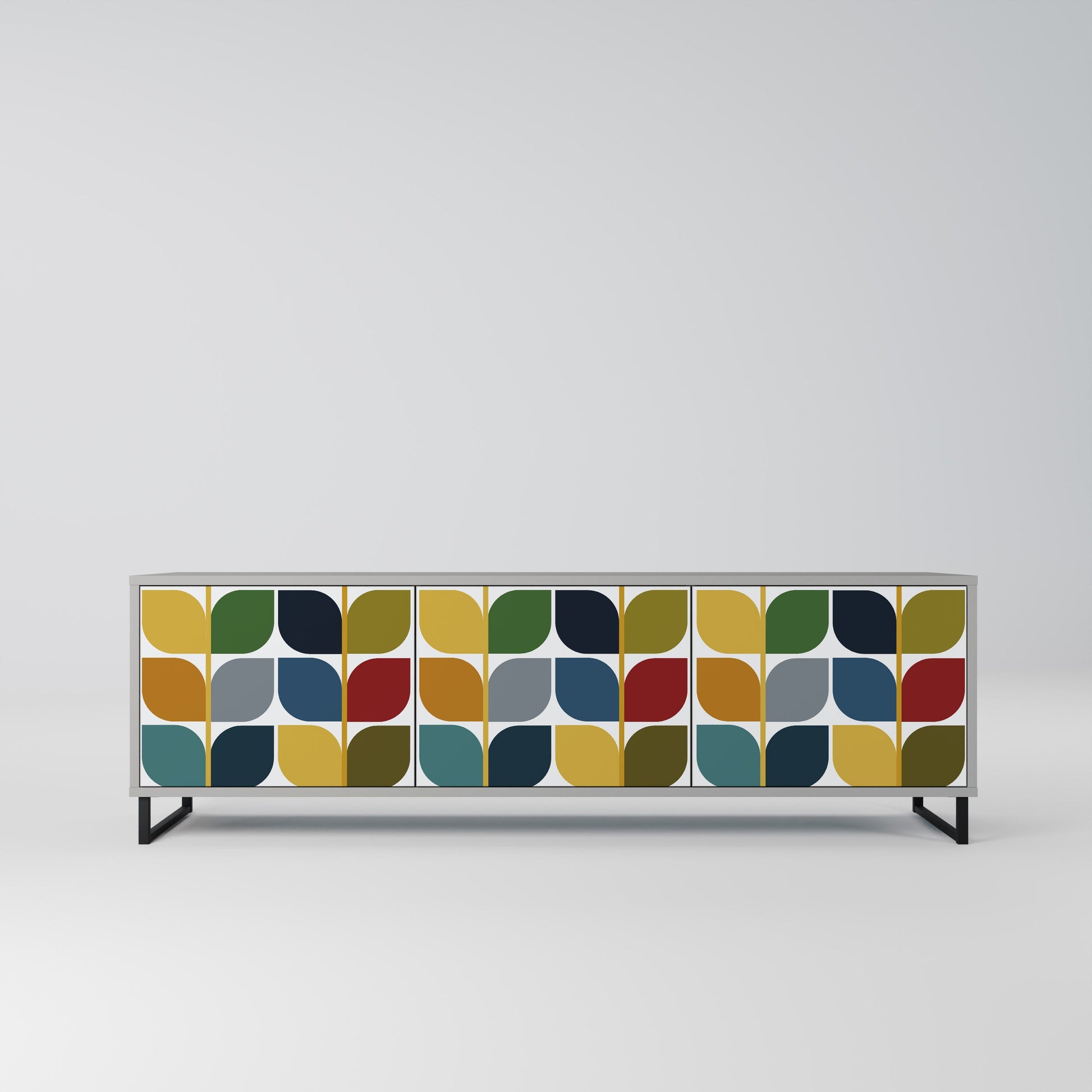 The grey body of the stand creates a refined, modern accent that pairs beautifully with industrial and minimalist arrangements. The fronts with a designer print add character and uniqueness, making this piece not only practical but also a standout decorative element.