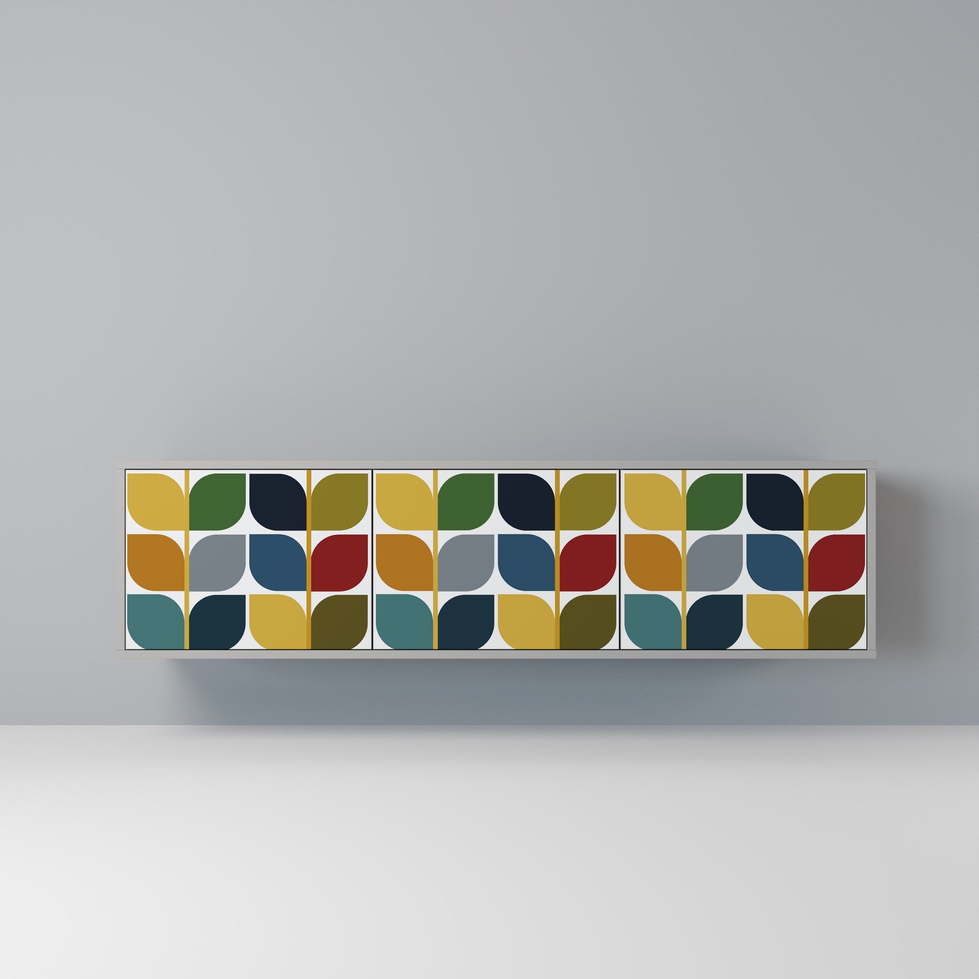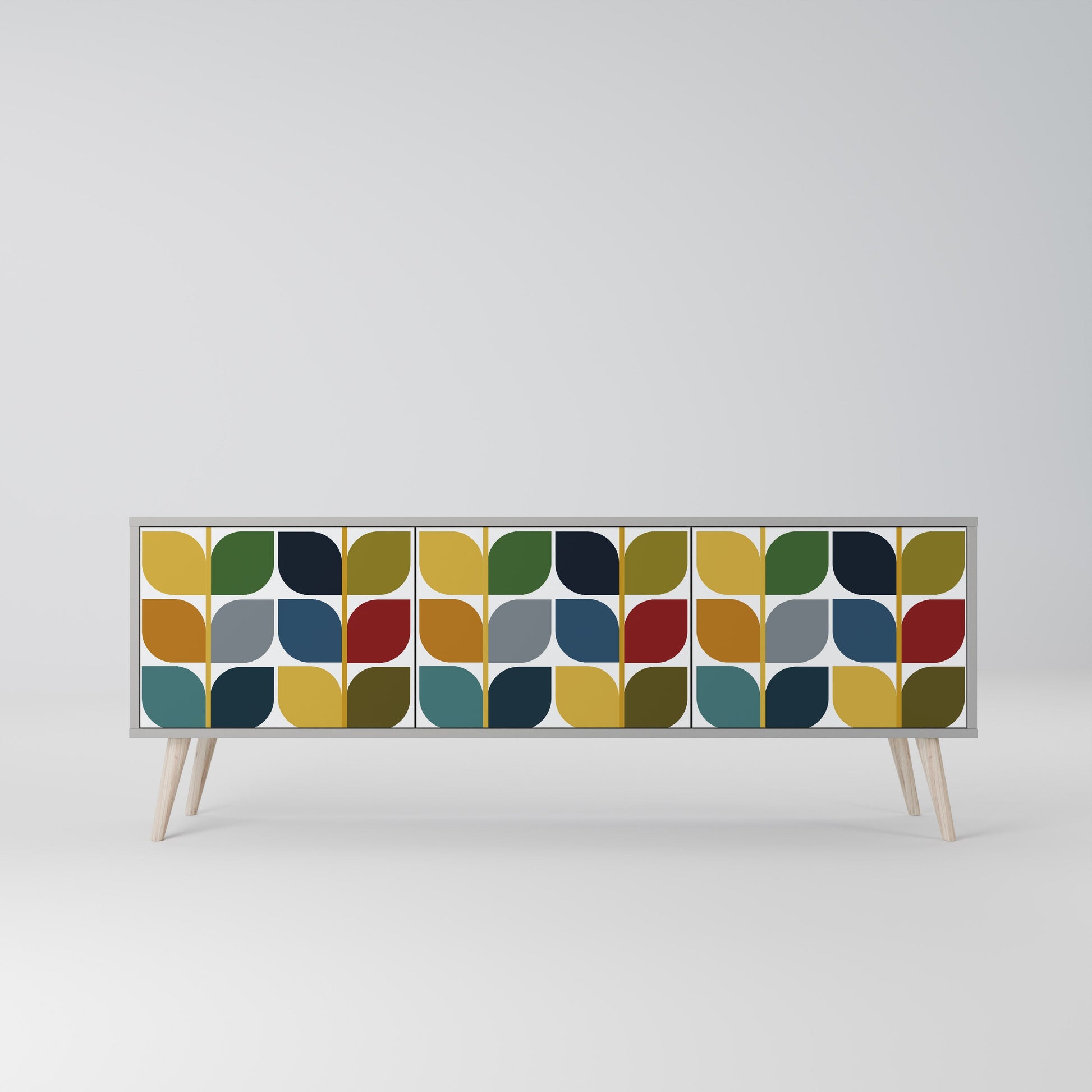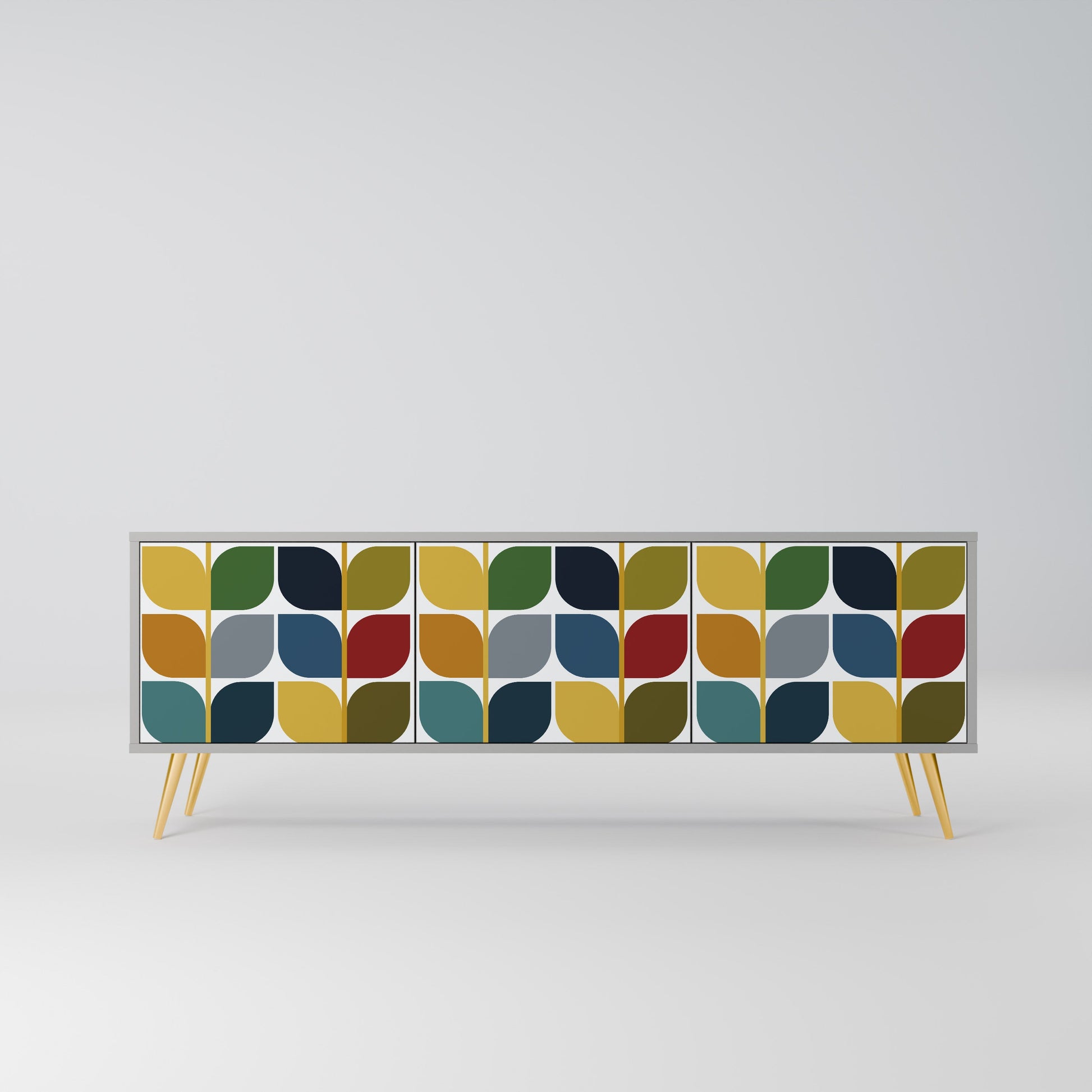 The grey body of the stand creates a refined, modern accent that pairs beautifully with industrial and minimalist arrangements. The fronts with a designer print add character and uniqueness, making this piece not only practical but also a standout decorative element.