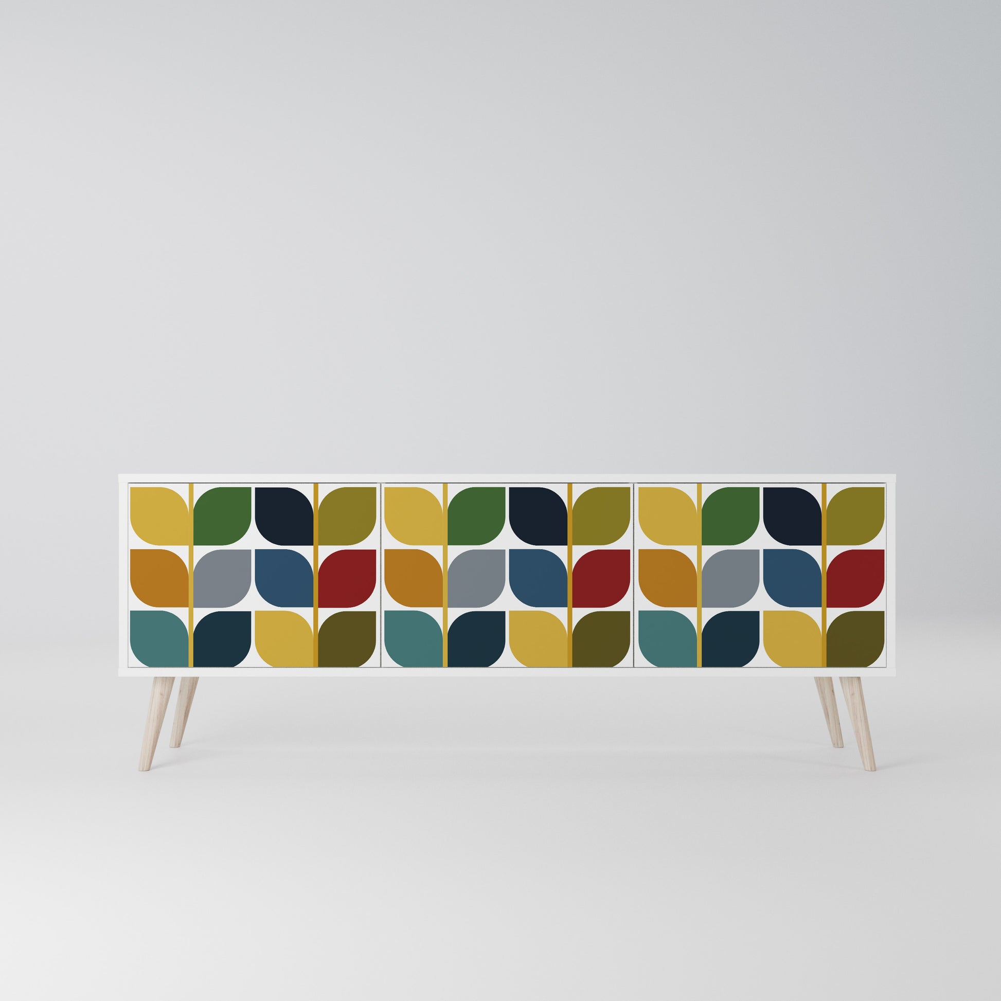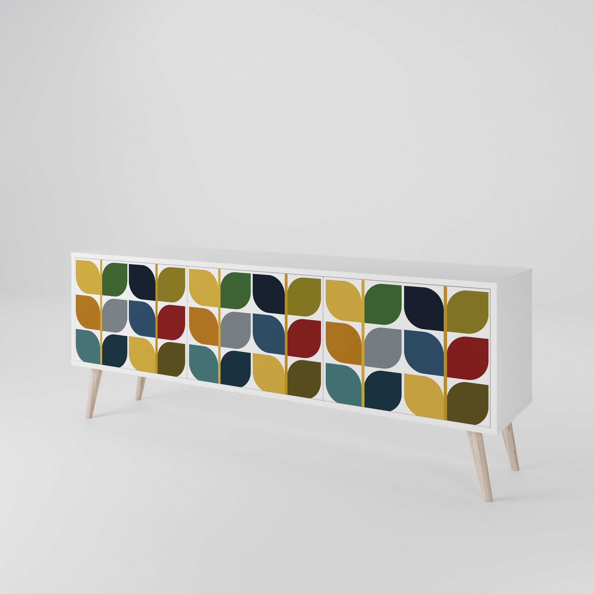 The white body of the stand creates a crisp, modern accent that pairs beautifully with minimalist and Scandinavian arrangements. The fronts with a designer print add character and uniqueness, making this piece not only practical but also a standout decorative element.