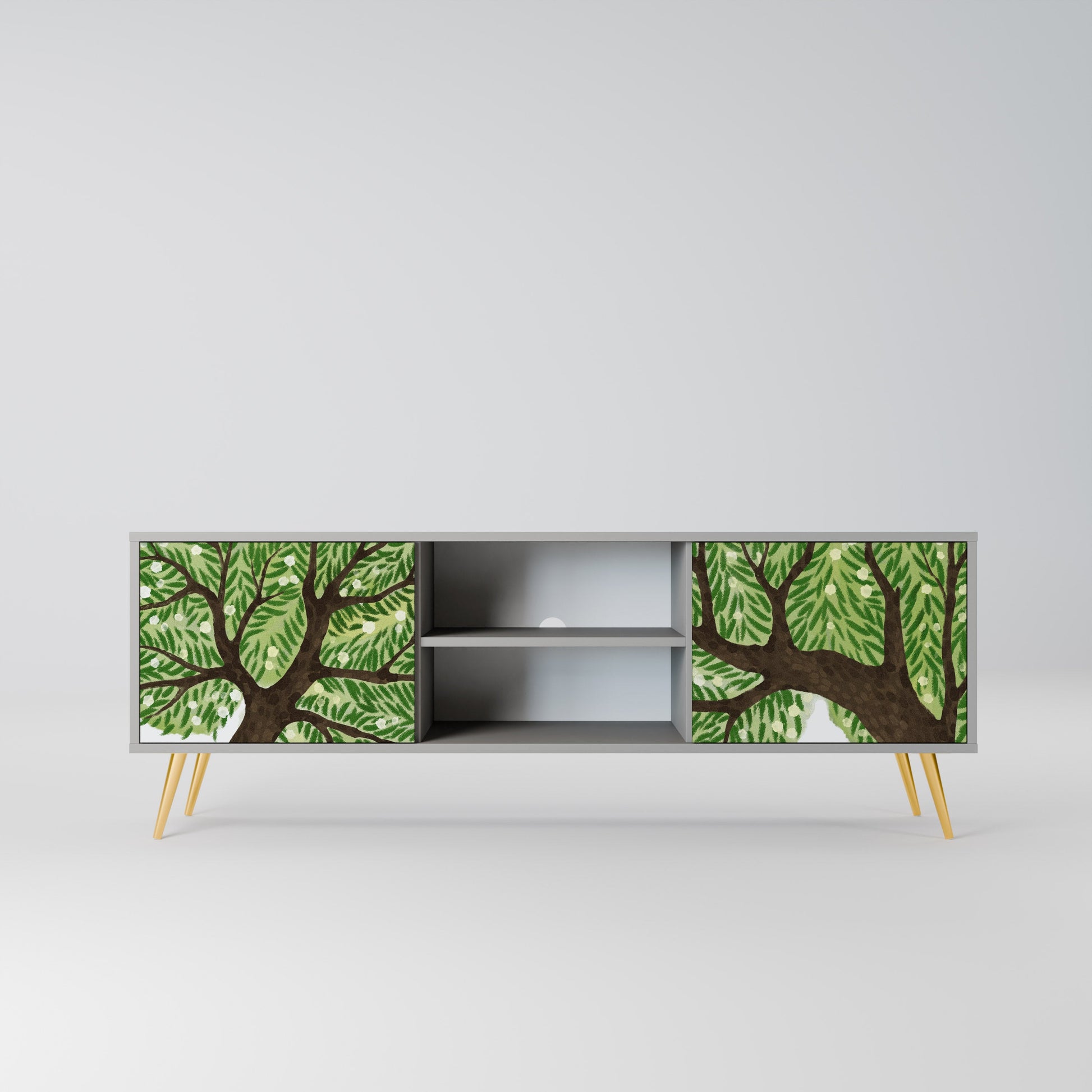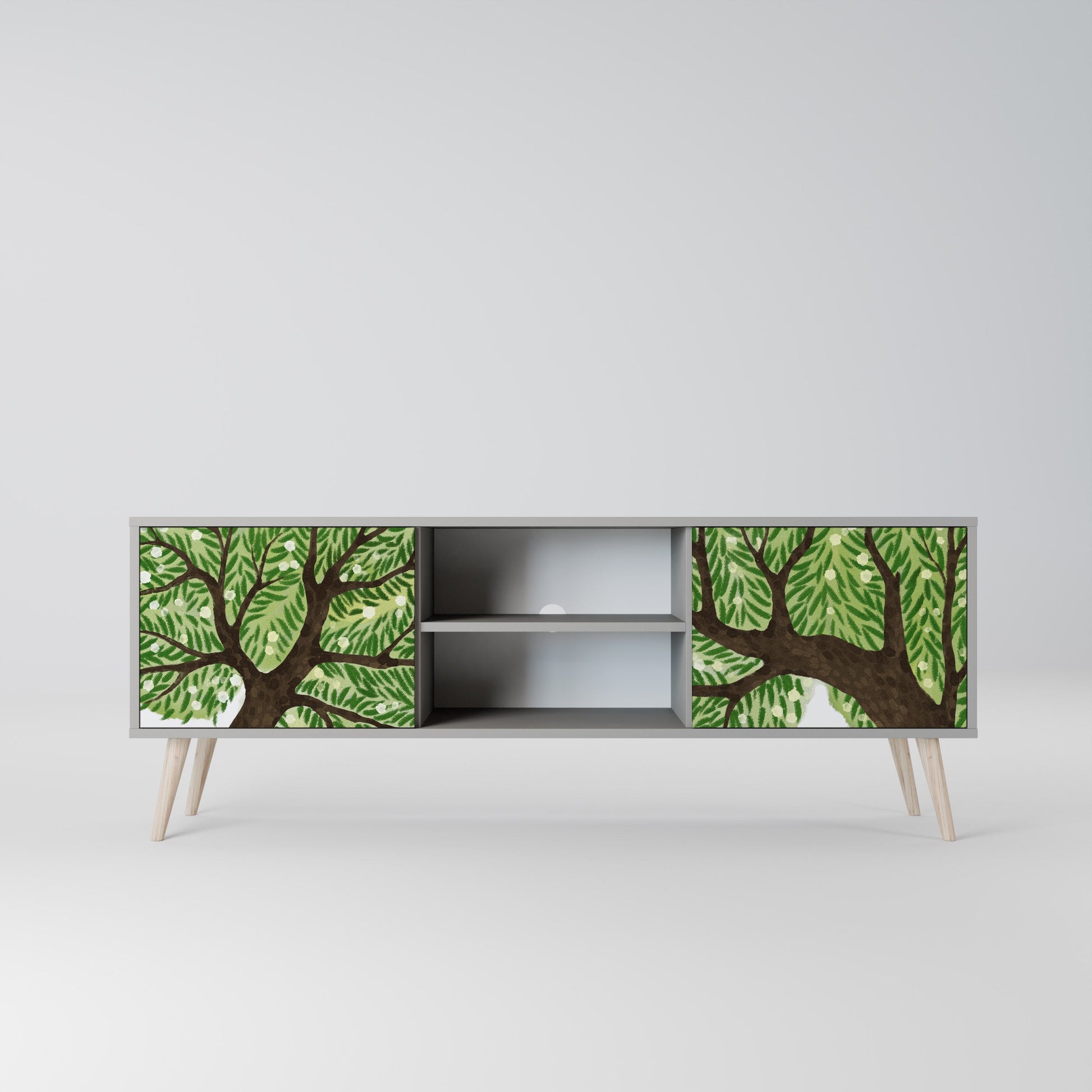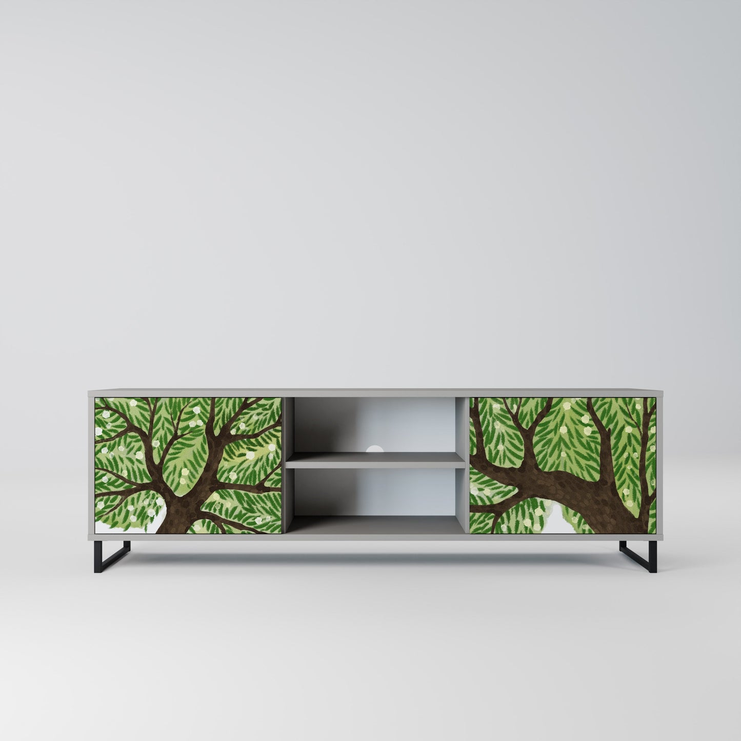The grey body lends the TV stand a contemporary, refined look, while the fronts with an exceptional print capture attention, becoming the focal point of any room. The spacious interior provides room for electronic devices, cables, remotes, and other accessories, helping you maintain order and organization.
