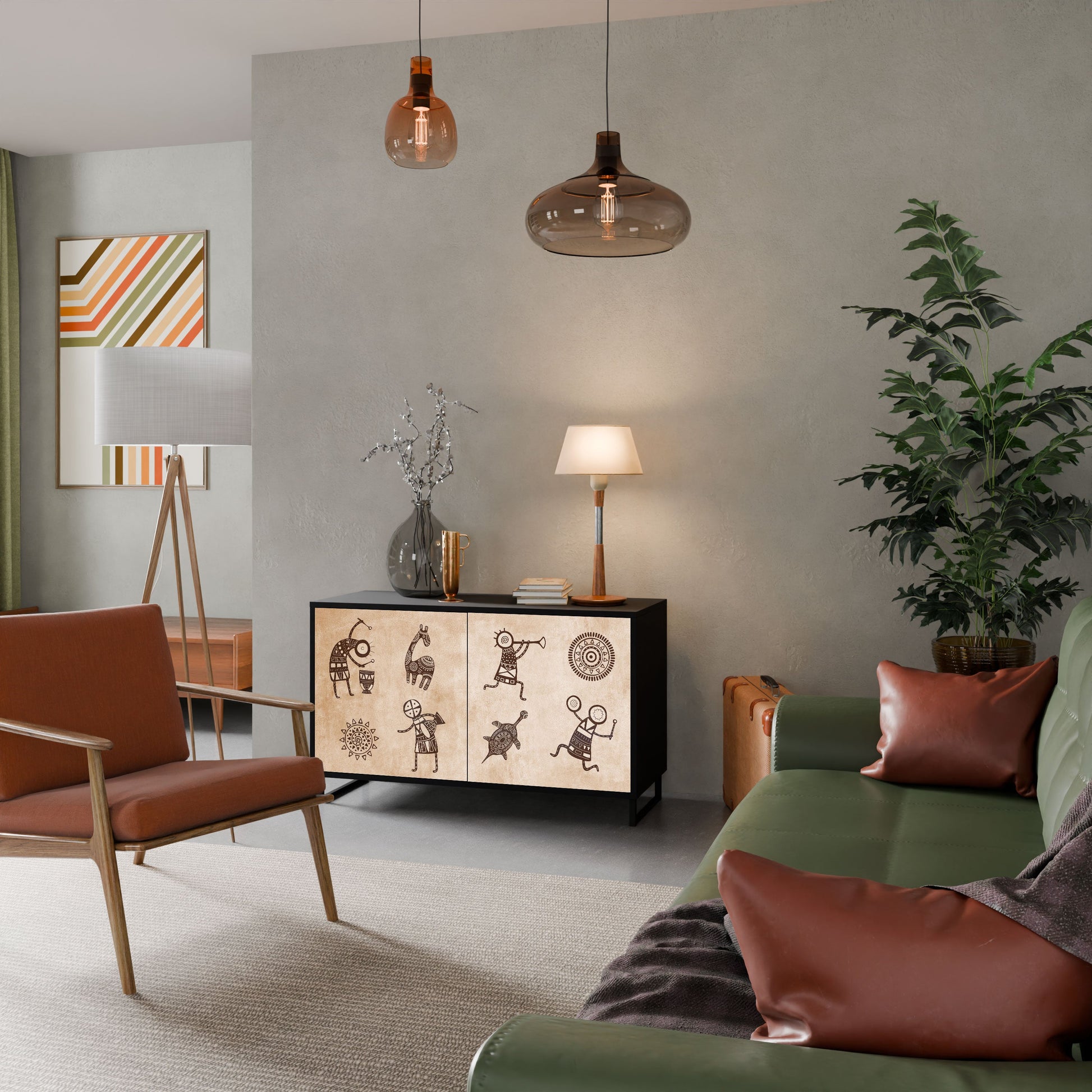 Eleganza e funzionalità in un unico mobile: la nostra credenza a 2 ante con corpo nero è la soluzione perfetta per gli amanti degli interni eleganti e moderni. Il corpo nero enfatizza il carattere audace del mobile, mentre i frontali con una stampa unica aggiungono un tocco artistico. Si adatta perfettamente al soggiorno, alla camera da letto o all'ufficio, completando sia gli arrangiamenti moderni che quelli industriali.