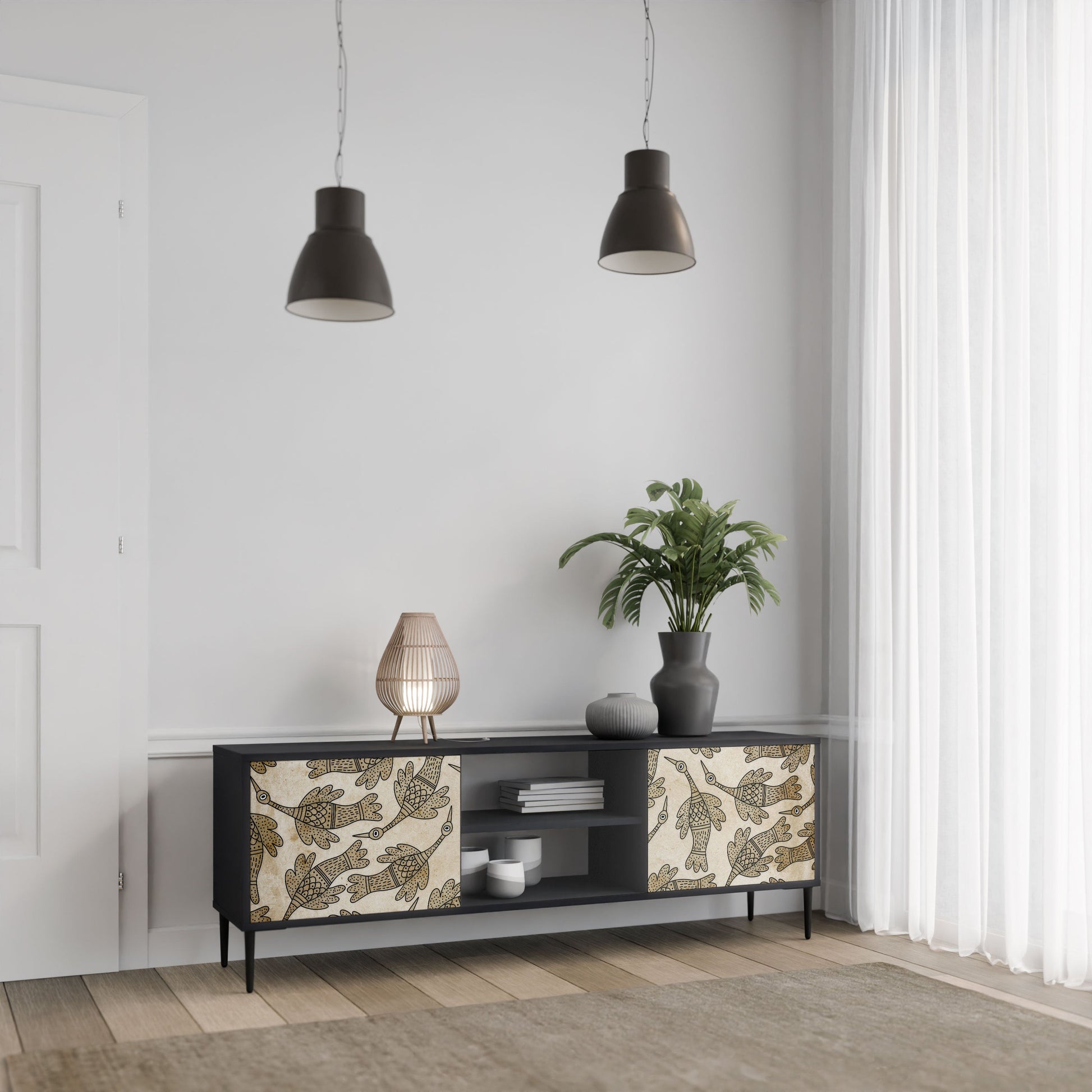 Il corpo nero conferisce al mobile TV un aspetto elegante e moderno, mentre i frontali con una stampa eccezionale attirano l'attenzione, rendendolo il punto focale di ogni stanza. L'interno spazioso offre spazio per dispositivi elettronici, cavi, telecomandi e altri accessori, aiutandoti a mantenere ordine e organizzazione.
